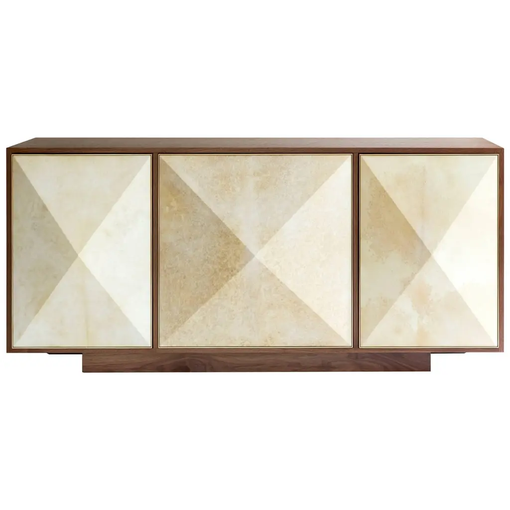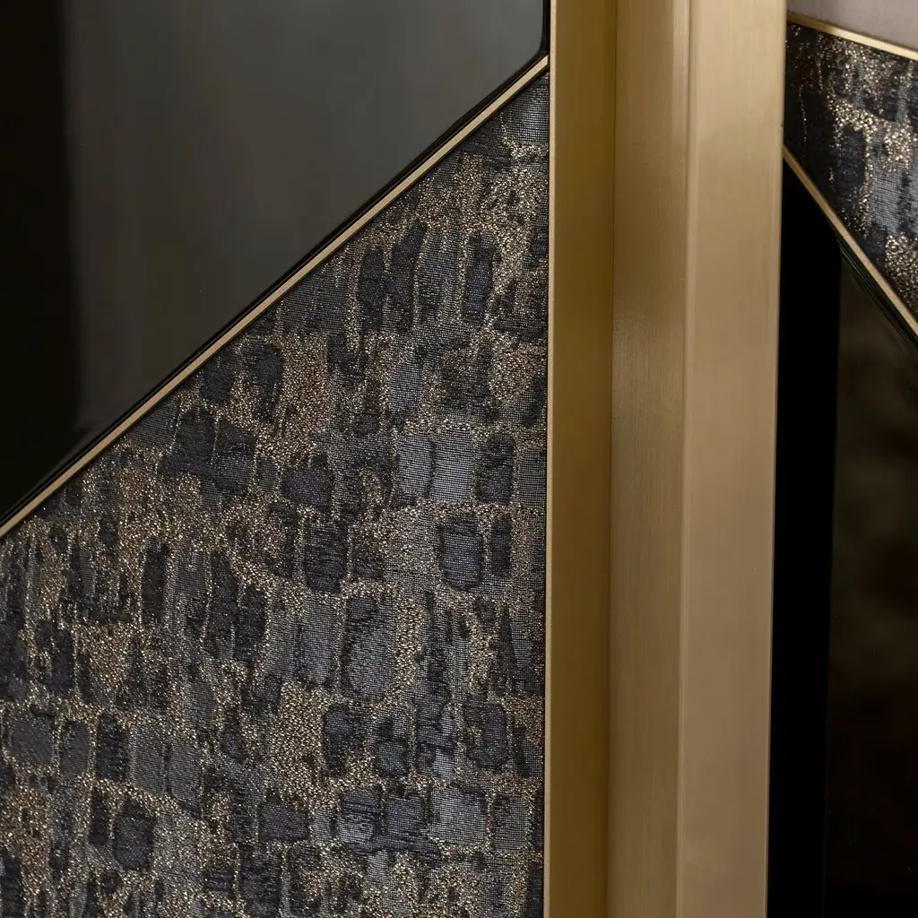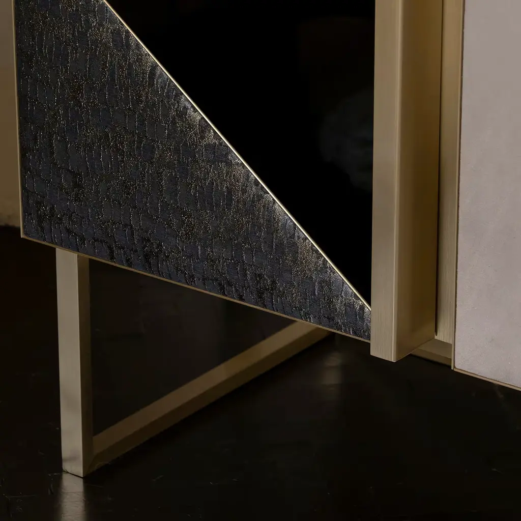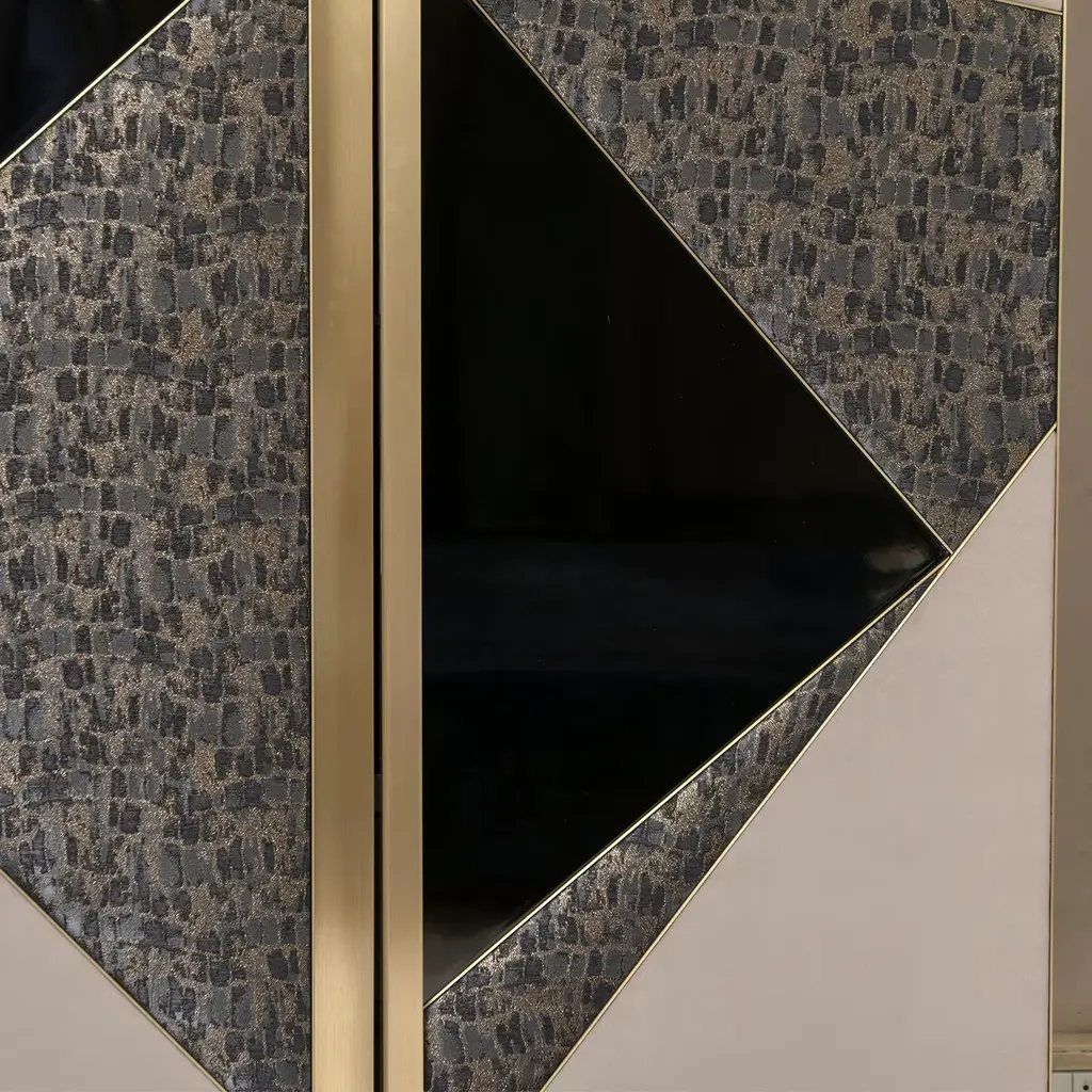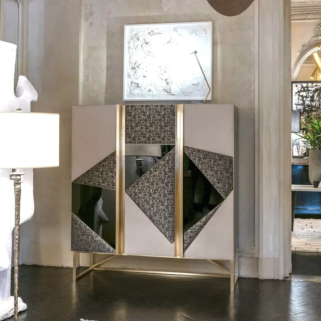This elegant cabinet combines sculptural finesse with Art Deco charm, perfect for chic, minimalist interiors. It features a glossy black-finished wood structure and a sleek brushed brass base. The three central panels showcase glossy black-lacquered geometric designs with vintage textile inserts and refined beige suede. Inside, it offers two black wood drawers, smoked mirror glass shelves, and a smoked mirror glass back panel. Customizable upon request