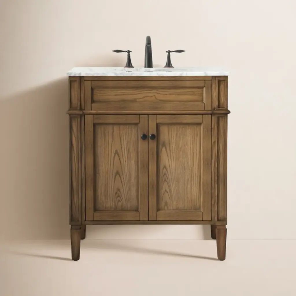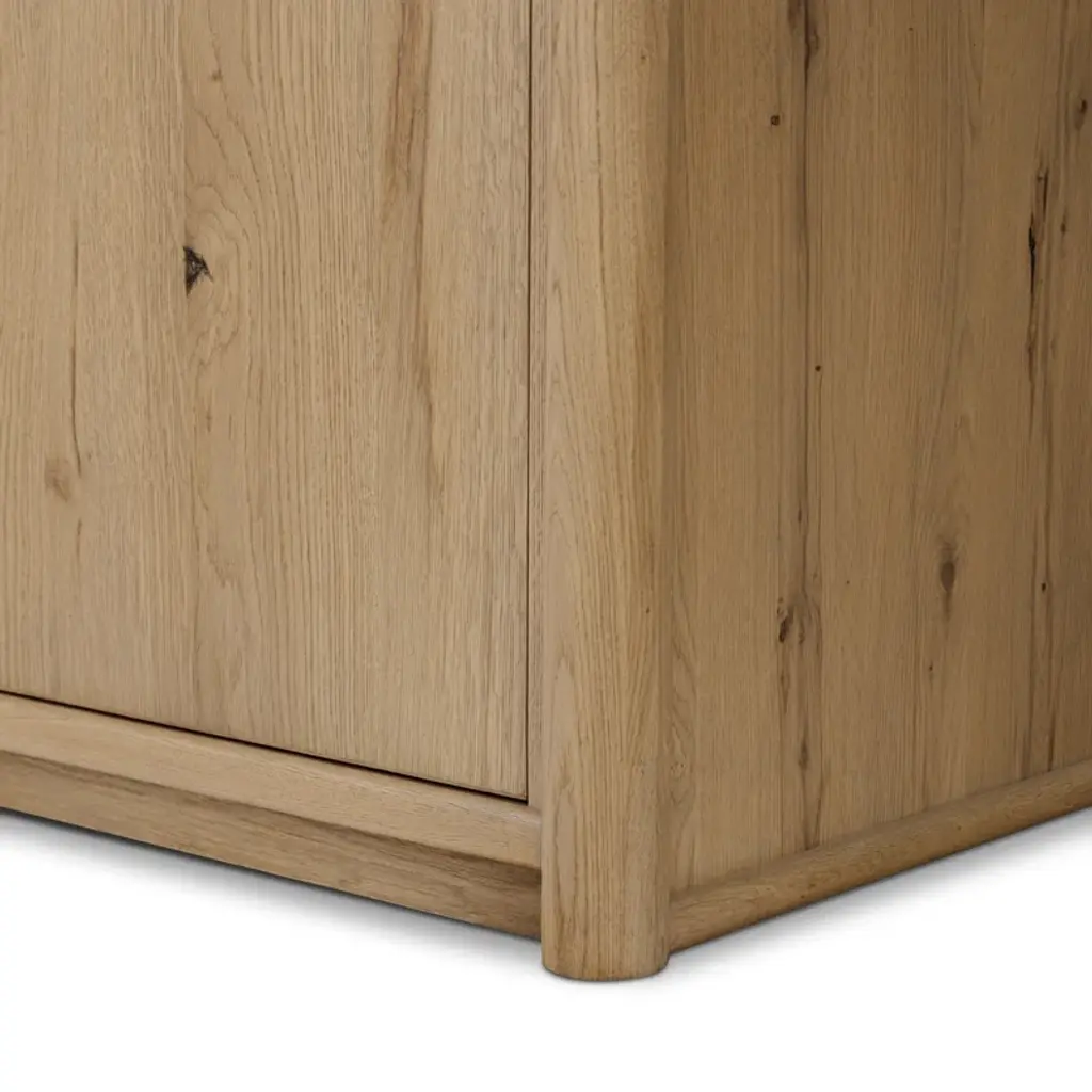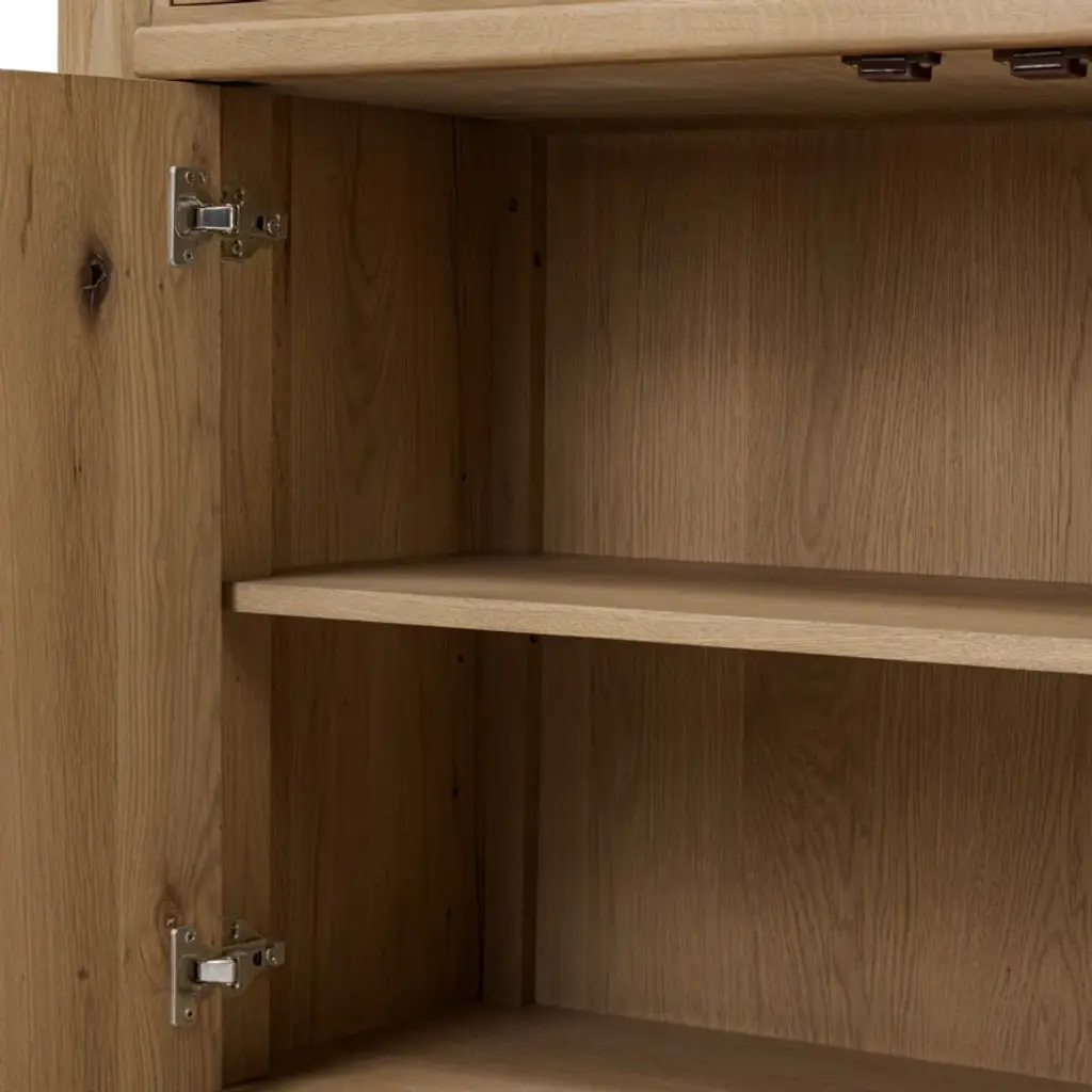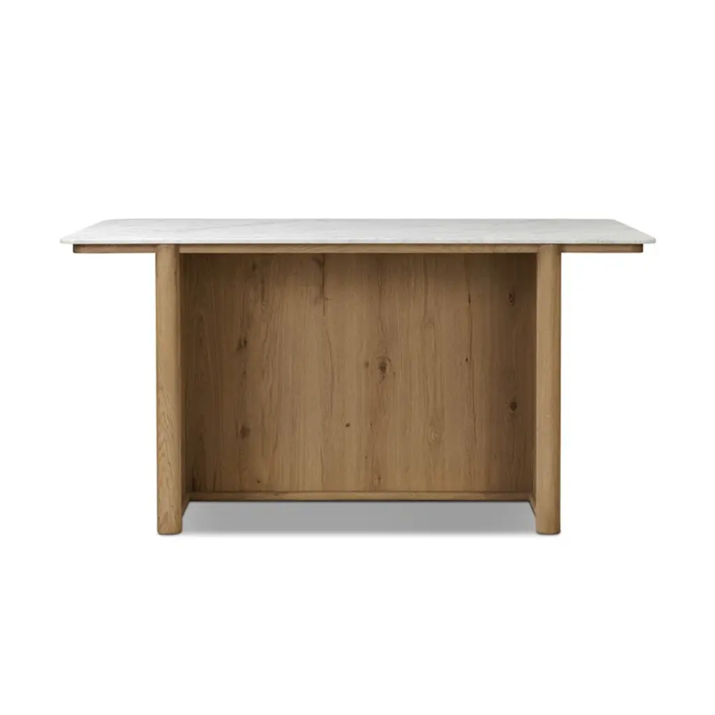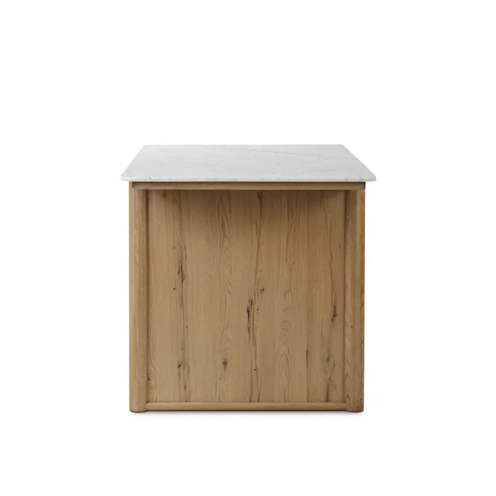 Bring bonus storage space to your kitchen with a mixed-material island of Carrara marble and aged natural oak. With closed construction to mimic a built-in piece, lower cabinetry with shelving plus dual drawers up top create endless options for storage of your servingware or appliances. Plus, it's a natural centerpoint for conversation while cooking or entertaining.