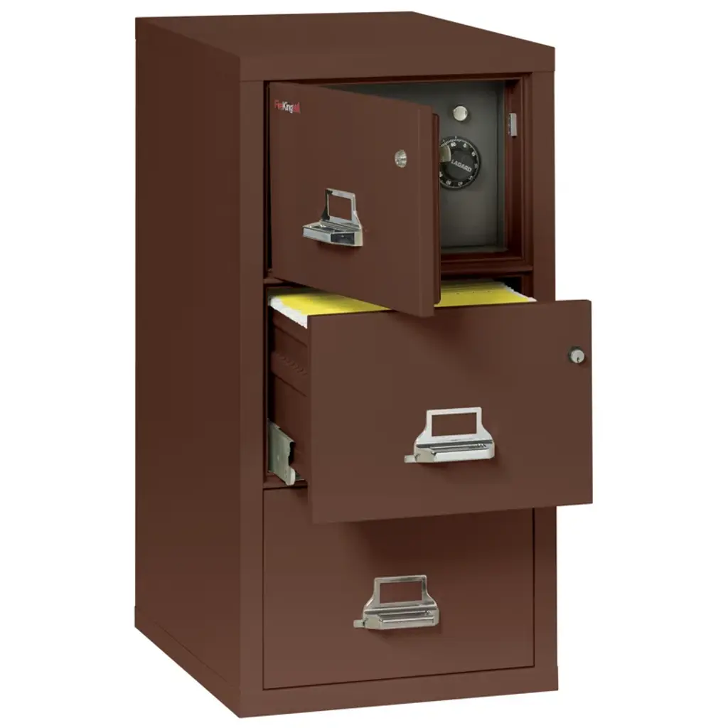 When you are protecting valuable documents you want the best. When it comes to fire protection, half as good is no good. FireKing's safe-in-a-file cabinets ensure that your vital items are secured, safe from fire, and cleverly hidden in a safe cabinet. Included, just as it sounds, is a cabinet safe inside the topmost file with a 2.4 cubic foot capacity and added fireproof protection. The safe’s lock is a UL®-listed Group II combination lock. FireKing is the choice among many companies for its outstanding, dependable fireproof filing cabinets. It will withstand a 1700-degree fire for a minimum of one hour protecting stored documents. Protecting against the heat is half the battle, fires very commonly result in building or structural collapse – an impact-rated file must be able to withstand a fall from multiple stories. For a UL-listed safe to be labeled “Impact Rated” it is heated to 1,550 degrees Fahrenheit in a furnace, raised three stories and dropped onto a pile of bricks, and then returned to the furnace and reheated. In order to meet the listing requirement, temperatures inside can't have risen above 350 degrees Fahrenheit, and sample papers left inside must be readable. If the file cabinet does endure a fire,