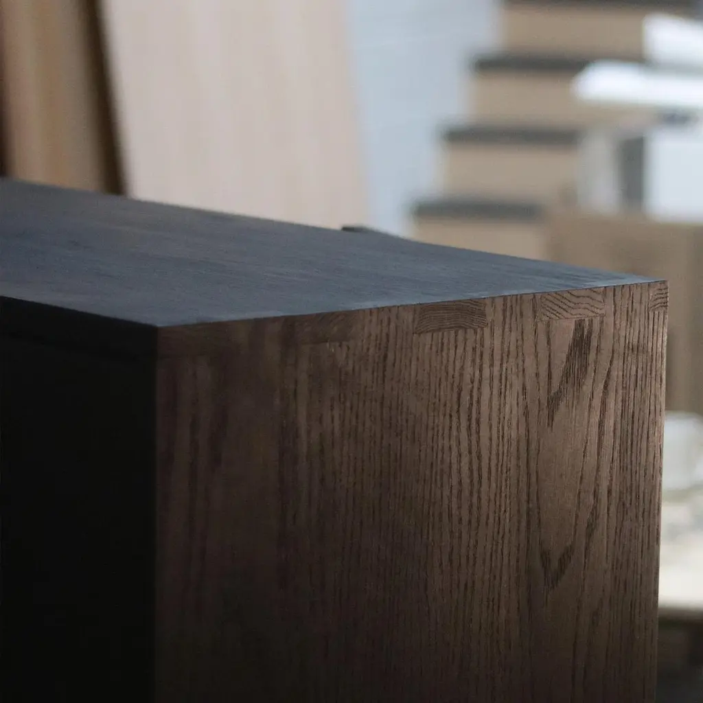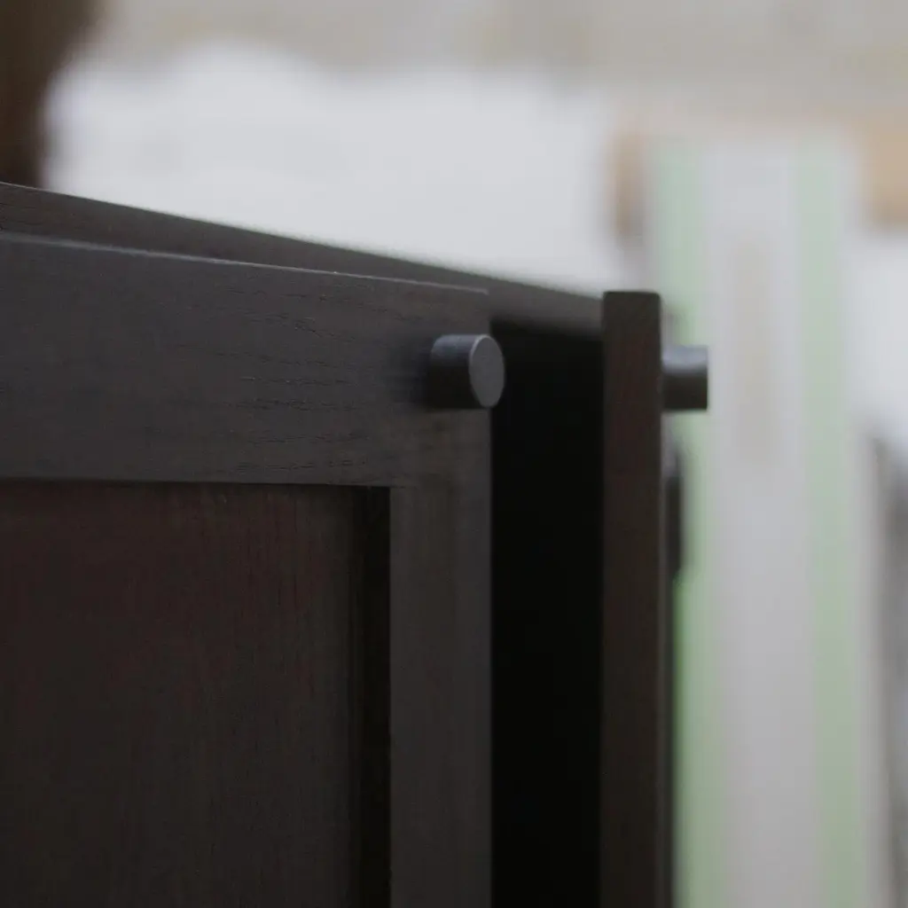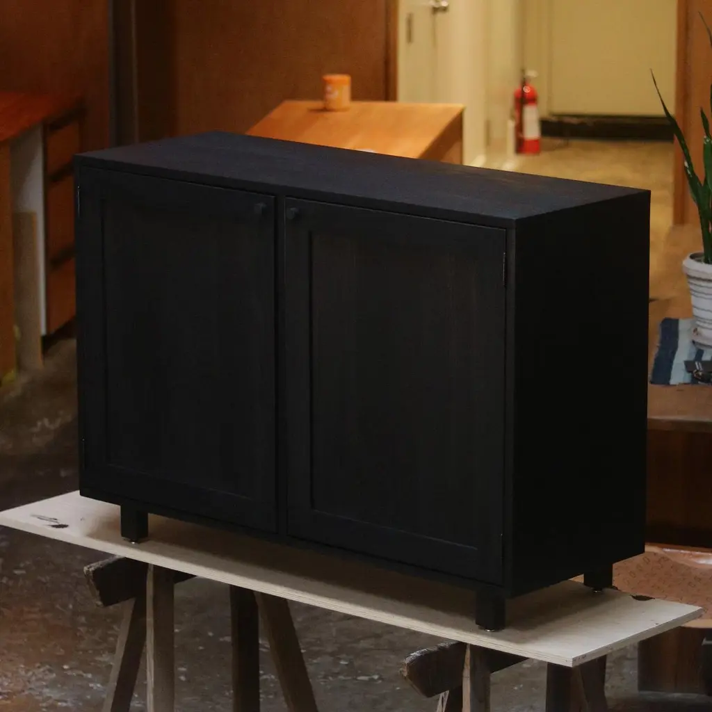 The Lemann Cabinet is a hand-crafted statement in solid red oak wood, echoing a simplicity that is both profound and understated. Its contours reflect a modern sensibility, where sleek lines and minimalism intertwine with the meticulous details that speak of dedication and expertise—dovetailed corners stand as testaments to the artisan's hand, while the adjustable wooden legs offer a subtle adaptability to various environments.Internally, the cabinet reveals an adjustable shelf on each side, inviting flexibility and personalization. This offering extends to the discerning customer, who may wish to request additional shelving, drawers, or tailored dimensions.The choice of wood species and finish becomes a dialogue between the maker and the owner, a partnership in creating a piece that resonates with individual stories and preferences. Finished in India ink, the cabinet dons a deep black that dances elegantly with the grain variation of the solid wood, allowing the natural beauty to emerge in quiet sophistication. Here lies not just a cabinet, but a canvas of possibility—a reflection of both its maker and its eventual keeper.