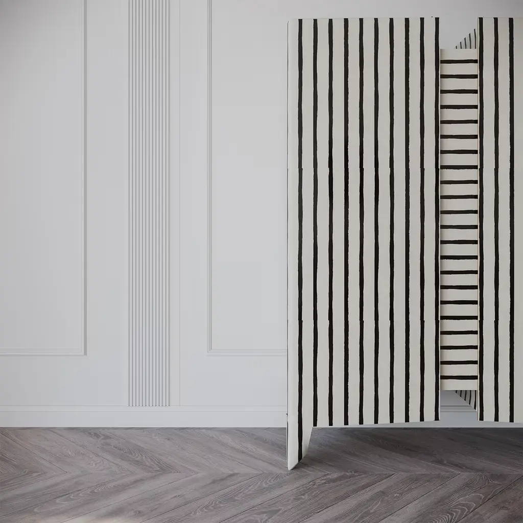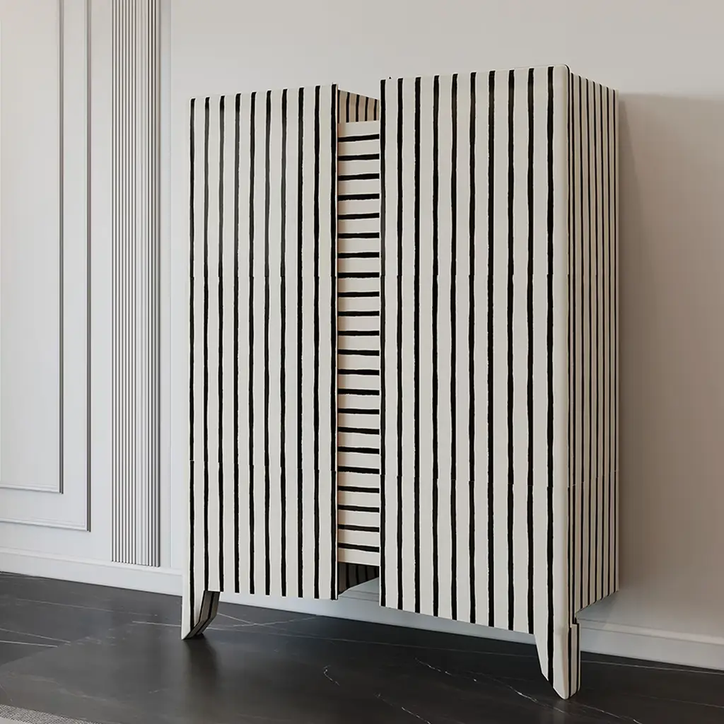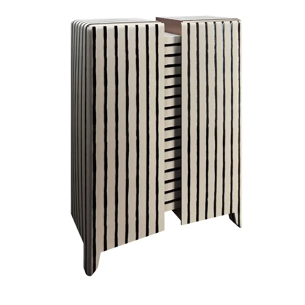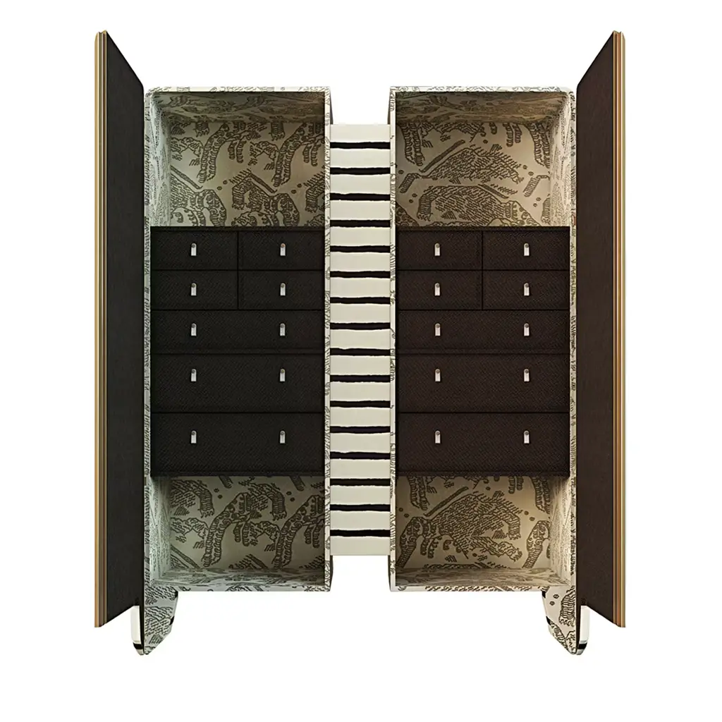 The large size of the cabinet makes it a complement versatile and functional. Cabinet with lacquered and multi-material doors dissected into 2 parts. Internally covered in fabric and available with internal drawers. Each door is internally enriched by LED light. This item must be fixed on the wall. Designed by Paolo Ciacci.