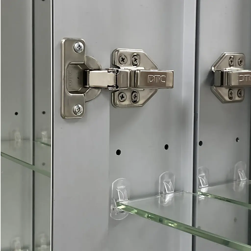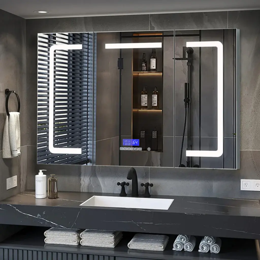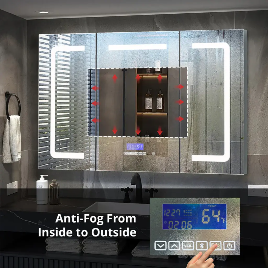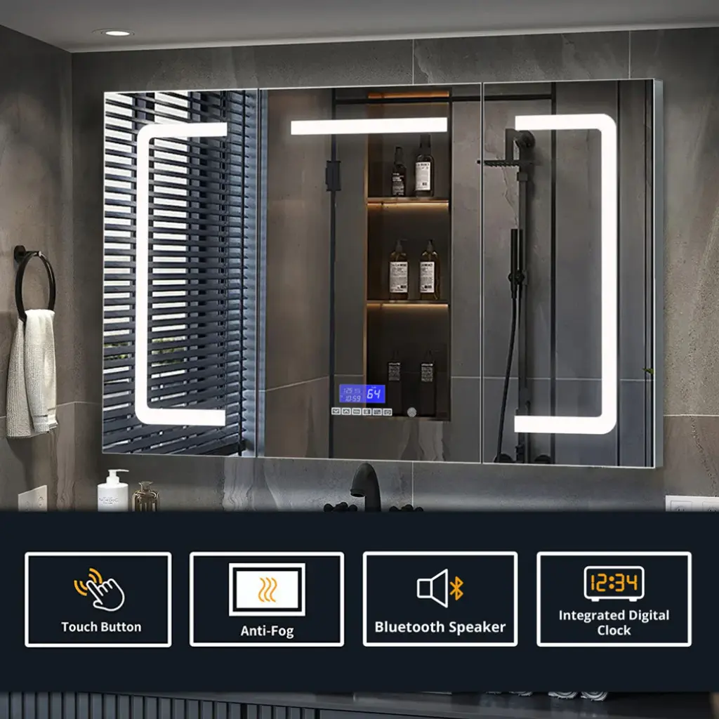 The Lesina bathroom medicine cabinet perfectly combines functionality with a unique design, providing plenty of storage room for your bathroom essentials, toiletries or accessories while adorning your space with a classy, timeless piece. The smart clock function and built-in defogger will transform your morning routine, while the Bluetooth speakers create a relaxing ambiance you''ll simply love. Everything you need within your immediate reach with the convenient shelves, low energy consumption and a superb, elegant design will make this wall mounted cabinet the perfect addition to any bathroom. This bath cabinet is available for purchase in various convenient sizes, providing a hassle-free installation and nicely complimenting any bathroom type, from contemporary, minimalist, farmhouse or boho chic. • Integrated LED light • Copper-free mirror Surface • Wall mount installation Mirror defogger• Integrated digital clock and Bluetooth speaker • Triple door design w/ soft-close hinges • Touch screen buttons All mounting hardware included • Color Temperature 6000-6500K • Aluminum frame and door • UL approved 4320LM