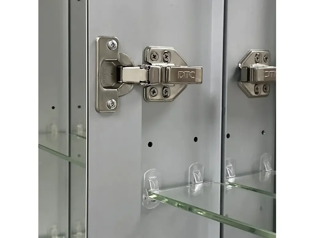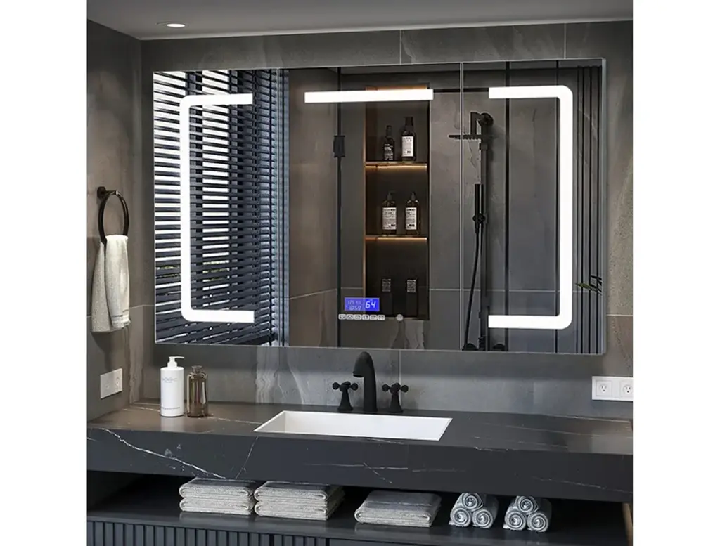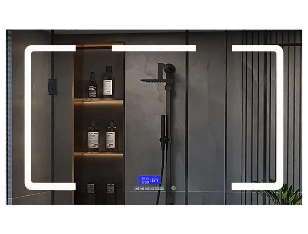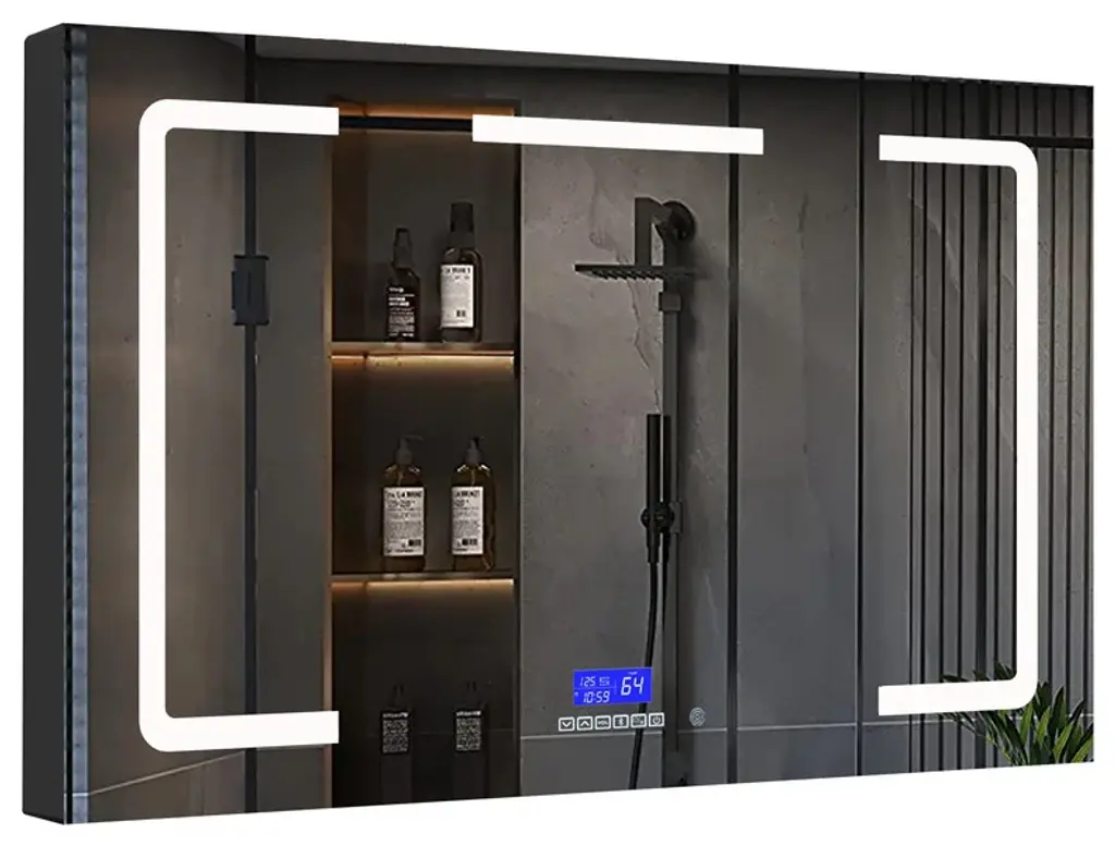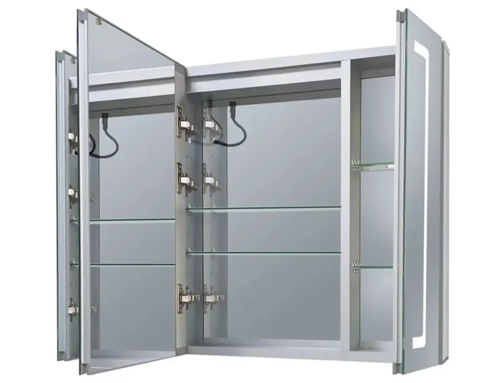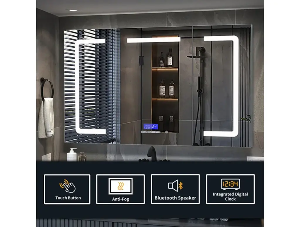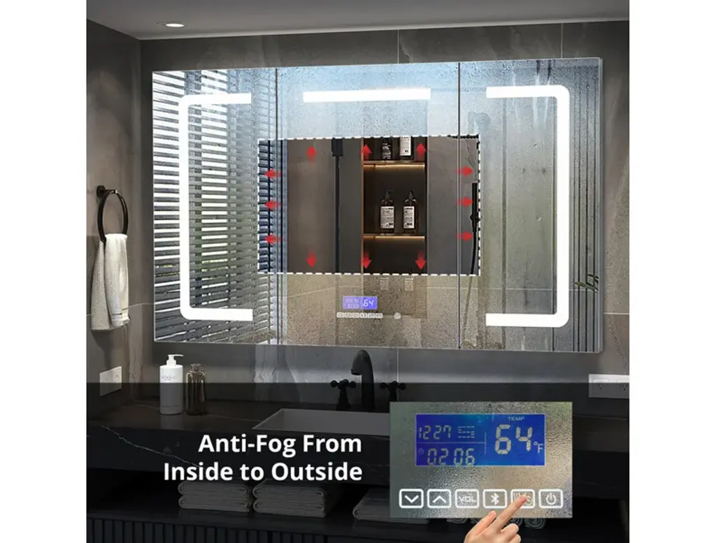 The Lesina bathroom medicine cabinet perfectly combines functionality with a unique design, providing plenty of storage room for your bathroom essentials, toiletries or accessories while adorning your space with a classy, timeless piece. The smart clock function and built-in defogger will transform your morning routine, while the Bluetooth speakers create a relaxing ambiance you'll simply love. Everything you need within your immediate reach with the convenient shelves, low energy consumption and a superb, elegant design will make this wall mounted cabinet the perfect addition to any bathroom. This bath cabinet is available for purchase in various convenient sizes, providing a hassle-free installation and nicely complimenting any bathroom type, from contemporary, minimalist, farmhouse or boho chic.Integrated LED lightCopper-free mirror SurfaceWall mount installation Mirror defoggerIntegrated digital clock and Bluetooth speakerTriple door design w/ soft-close hingesTouch screen buttons All mounting hardware includedColor Temperature 6000-6500KAluminum frame and doorUL approved 4320LM