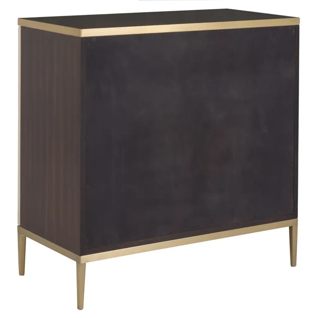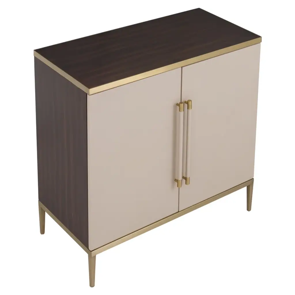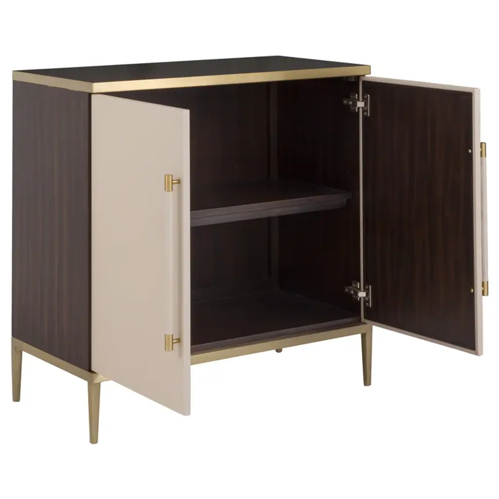 Features two doors with one interior adjustable shelf. Door fronts and hardware are wrapped in 4927-73 quartz with champagne brass accents and base. The exterior finish is in dark sable.
