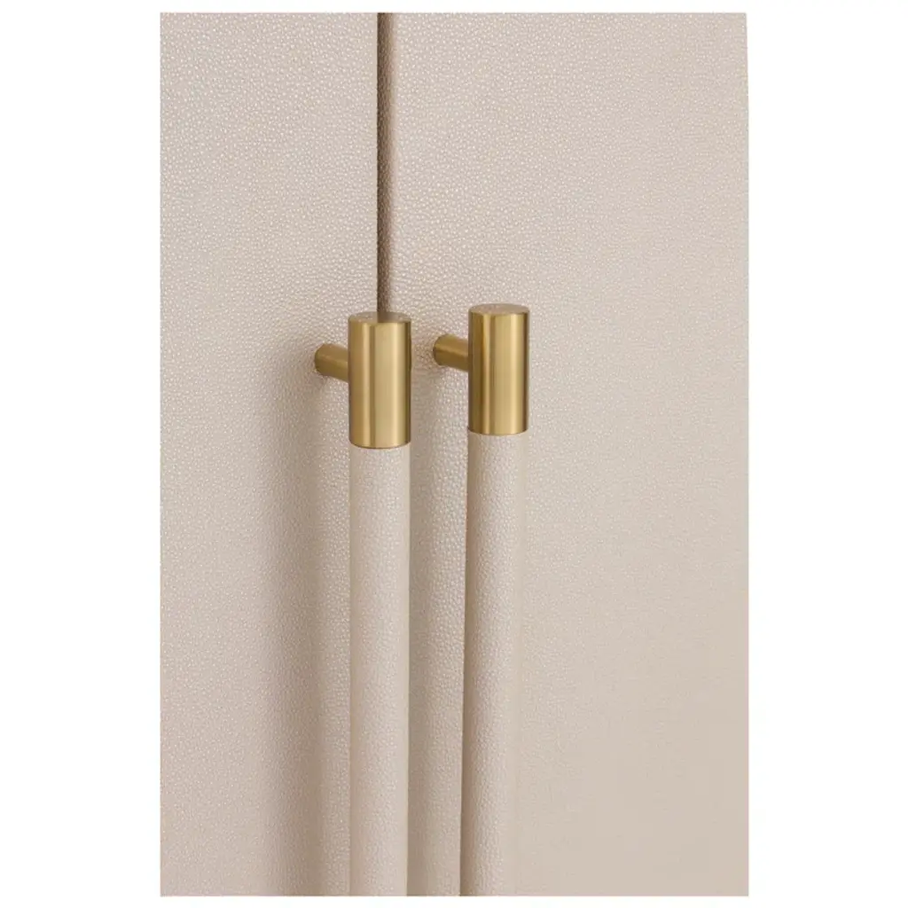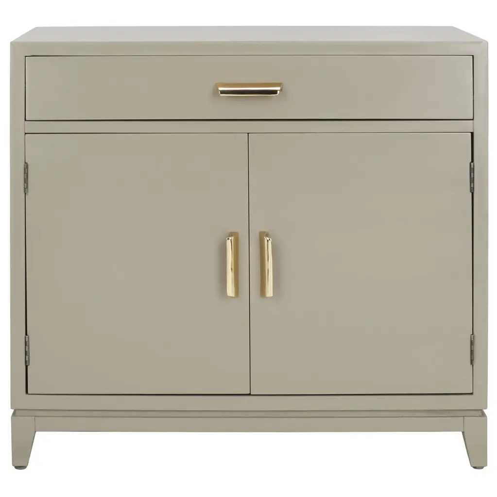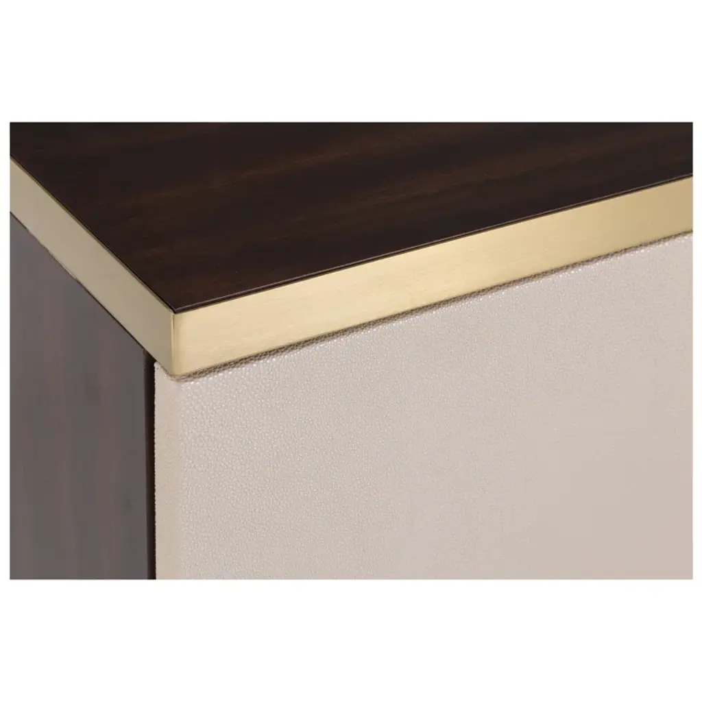 Features two doors with one interior adjustable shelf. Door fronts and hardware are wrapped in 4927-73 quartz with champagne brass accents and base. The exterior finish is in dark sable.