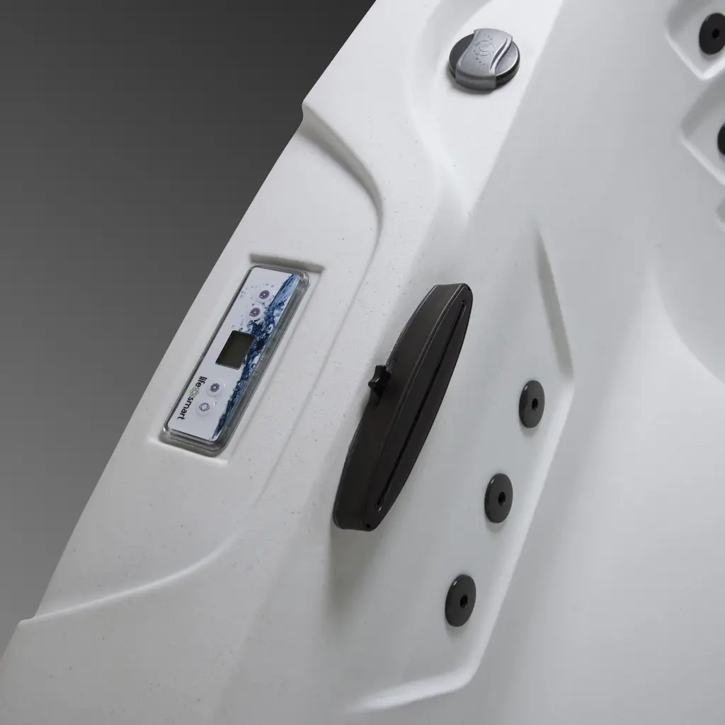 The Leganza by Lifesmart Spas is a 230v, 90-jet hot tub with a waterfall feature, multi-color underwater LED light, lounge seating, and capacity for 6 adults. With two powerful 2.5 HP pumps, air control valves, and intuitive digital control panel, the jets can be adjusted for maximum relaxation. Faux-wood siding provides a clean, classy look for any backyard. The included ozone water care system helps keep water sparkling clean with the need for fewer chemicals.Lifesmart Spas are energy efficient, so there is no need to turn the temperature down while not in use. Full foam insulation and included thermal locking cover will keep the heat in and the electric bill low, so you can enjoy your new spa for years to come. Rest easy knowing that Lifesmart Spas are certified to the APSP 14 National Standard and the California Energy Commission (CEC) in accordance with California Law.Features:This item includes curbside delivery only. Placement beyond the curb is not included.