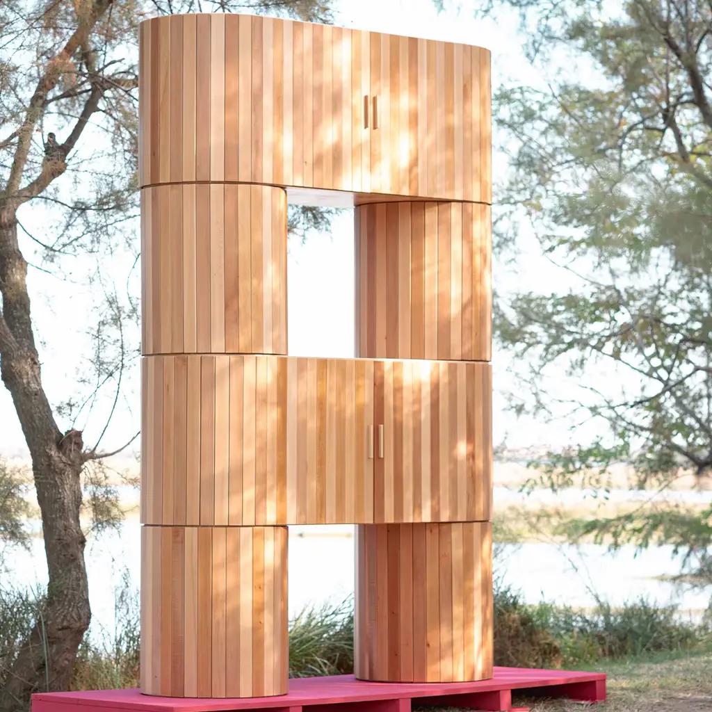An icon of contemporary design created by Cara Judd and Davide Gramatica, this cabinet boasts a singular structure of strong graphic inspiration. Drawn by clean lines alternating vertical and horizontal directions, it is enhanced with softly curved shapes. Masterfully handcrafted of lime wood, combining a natural finish with a light walnut shade.