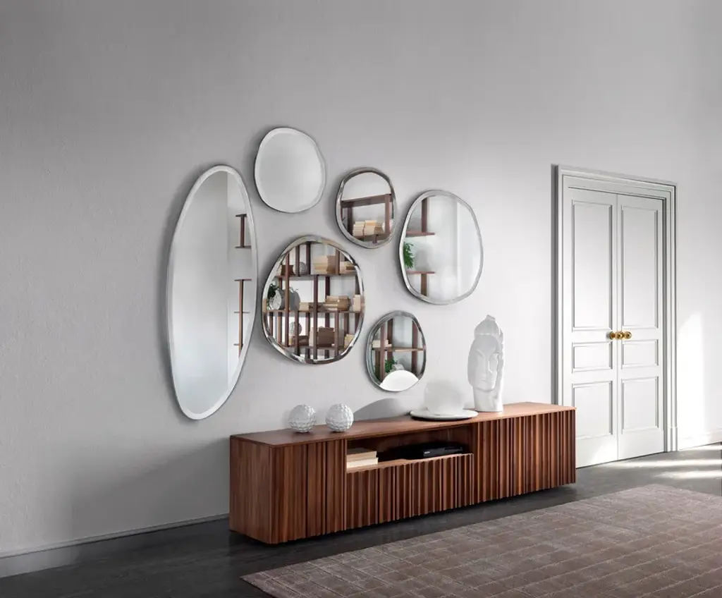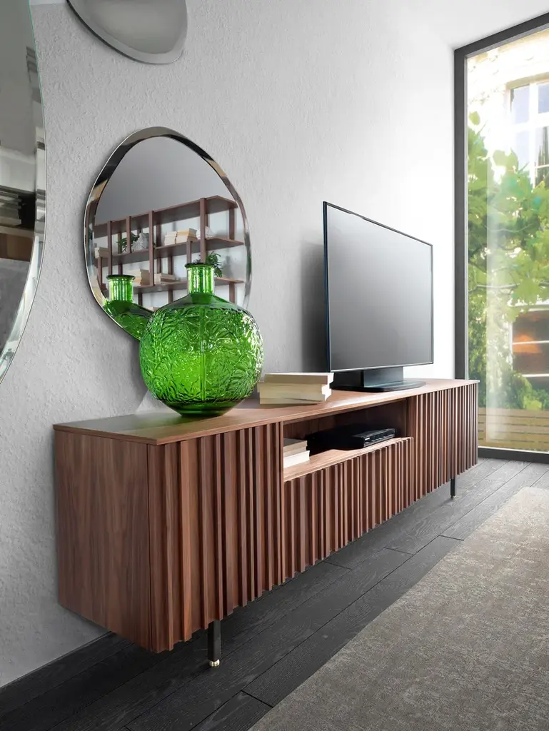 LINE TV is a modern wooden TV stand featuring an iconic design, defined by the refined craftsmanship of its doors.It offers generous internal storage space, including a central drawer and an open compartment—ideal for organizing all your devices.It can rest on a graphite-painted metal base with brass feet, or be used without a base.This TV stand is part of the LINE family, which includes sideboards in various sizes, allowing for a coordinated living room setup.TV stand with veneered and solid ash or canaletto walnut wood structure. Top surface in veneer. Internal shelves in clear glass. Available with or without graphite-painted metal base and brass feet. Cable management hole available on request.