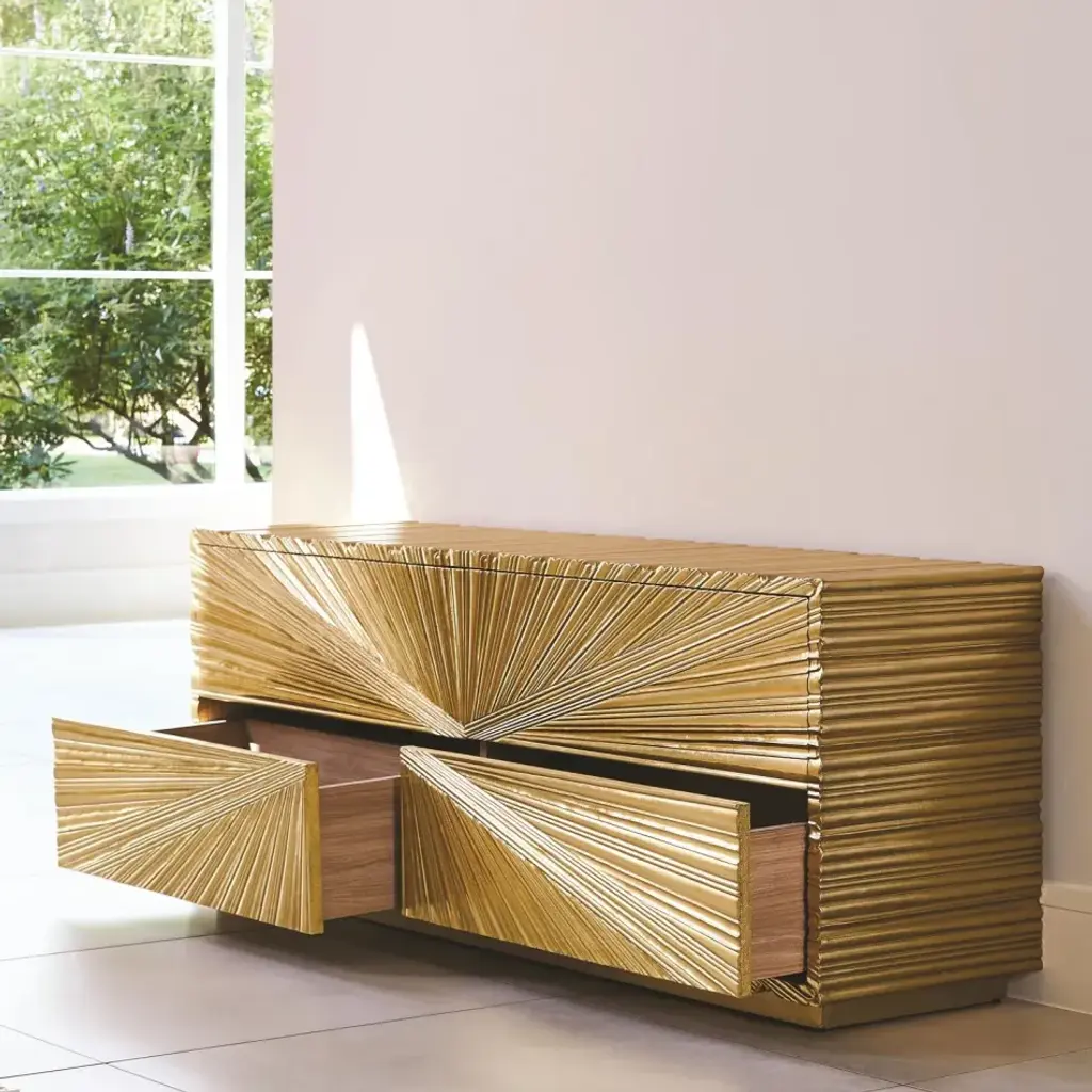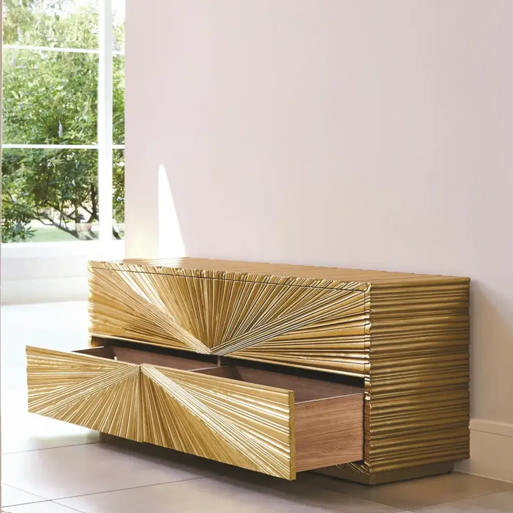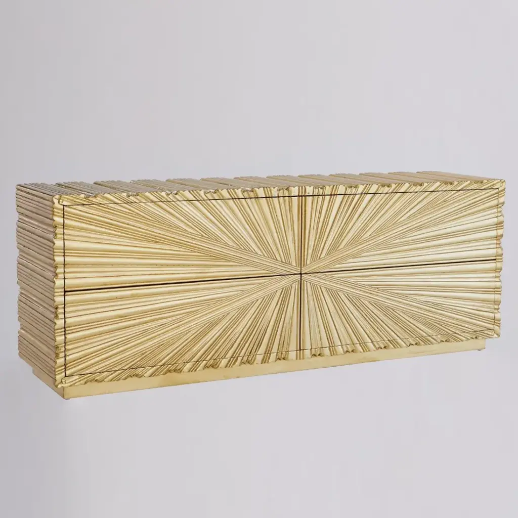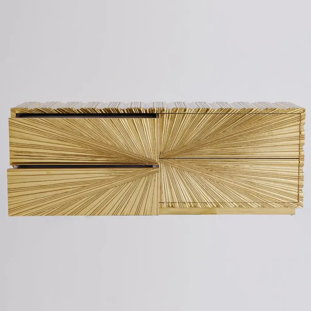 Linen Fold cabinet has an Art Deco inspired, textured starburst pattern made of white alloy metal with a protective coating. Four push open metal glide drawers. From a fashion forward perspective, Global Views offers accessories, furniture, statement lighting, and an assortment of rugs and mirrors to add beauty and joy to your home.