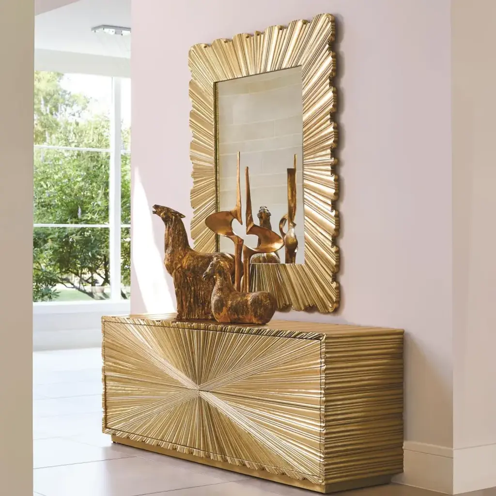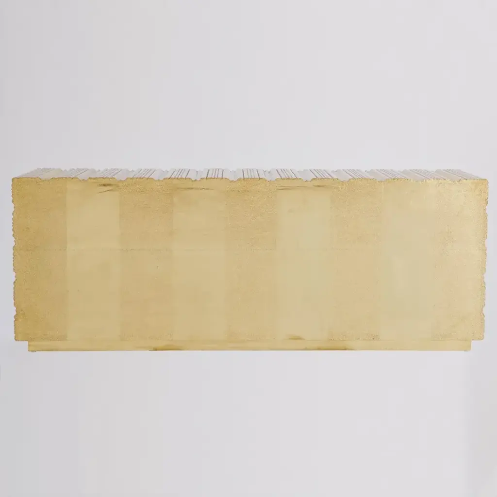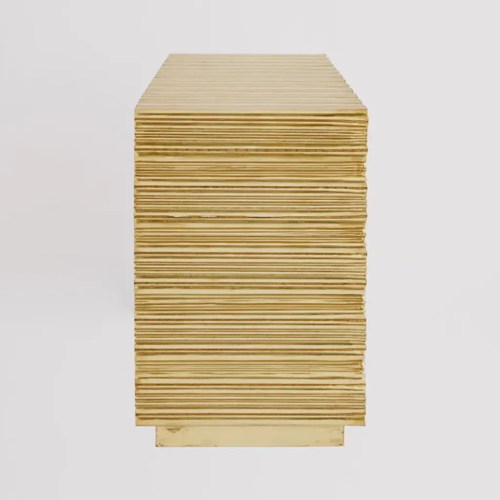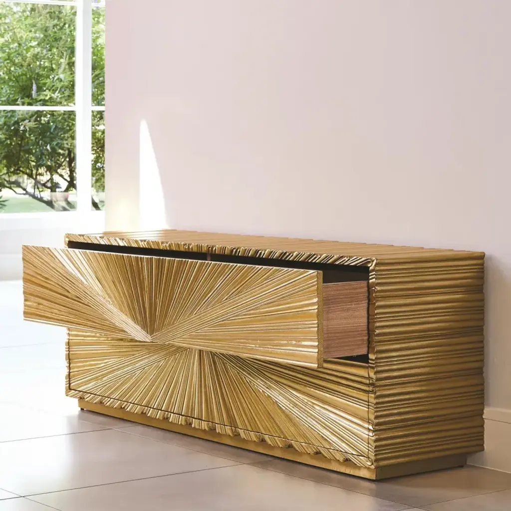 Linen Fold cabinet has an Art Deco inspired, textured starburst pattern made of white alloy metal with a protective coating. Four push open metal glide drawers. From a fashion forward perspective, Global Views offers accessories, furniture, statement lighting, and an assortment of rugs and mirrors to add beauty and joy to your home.