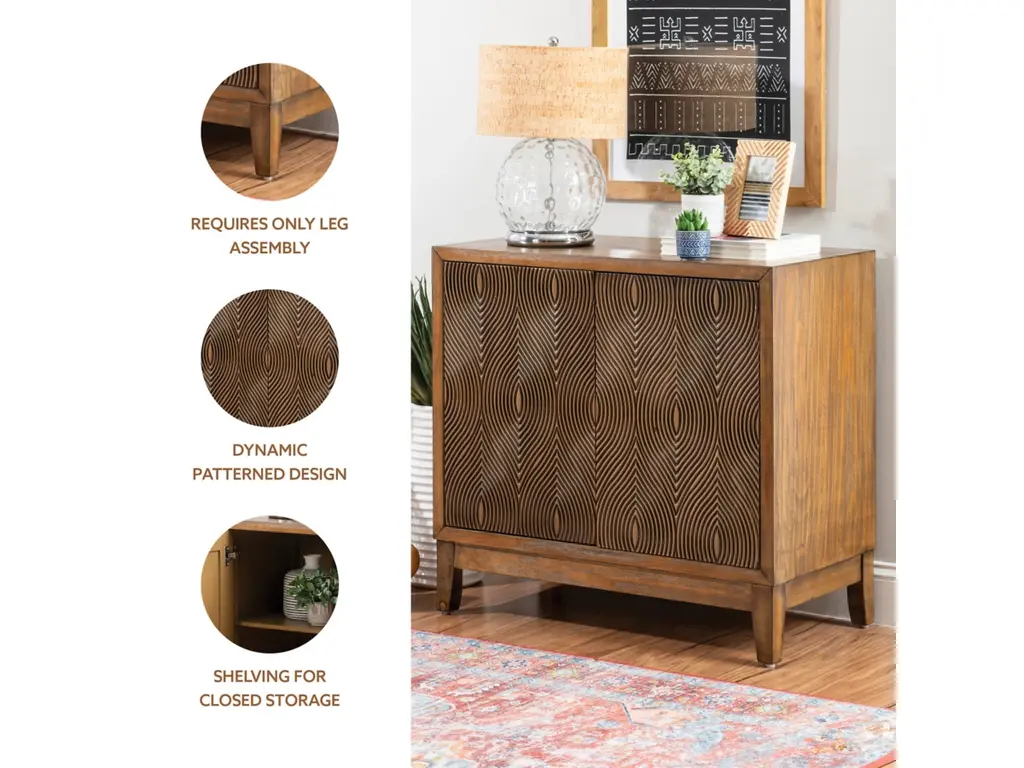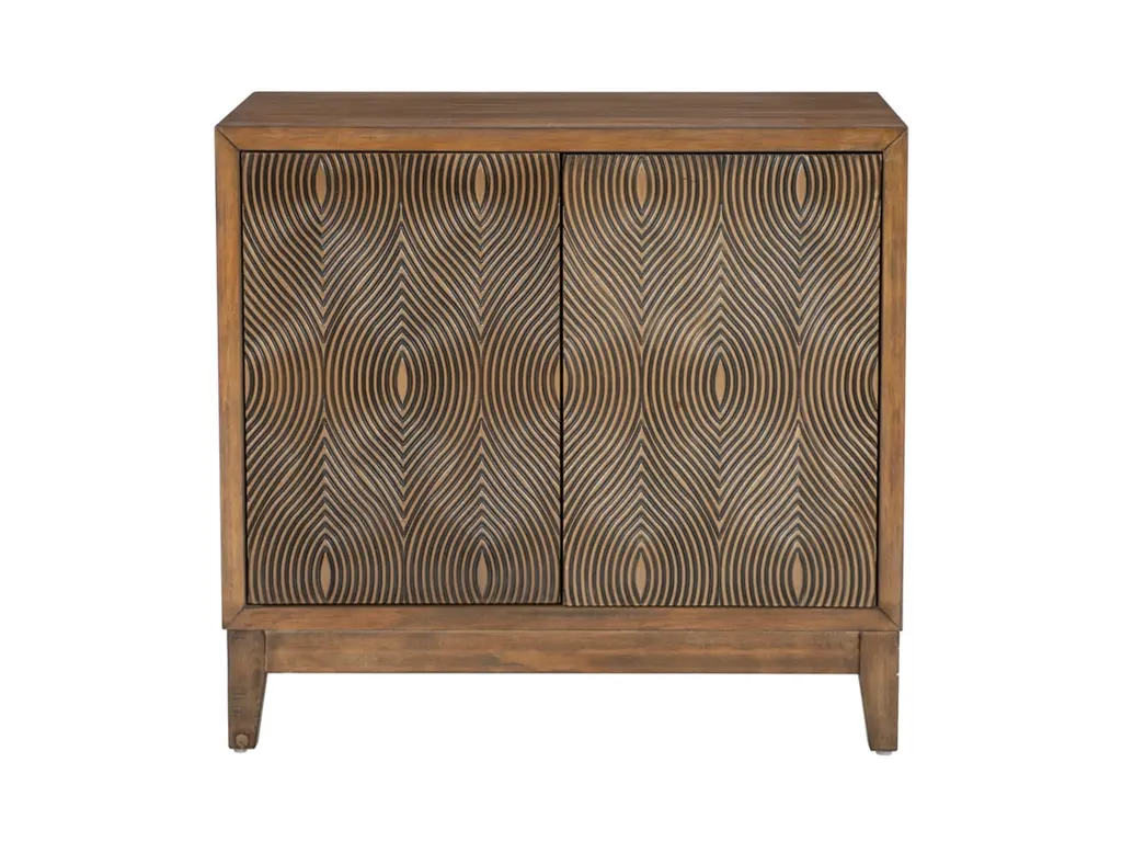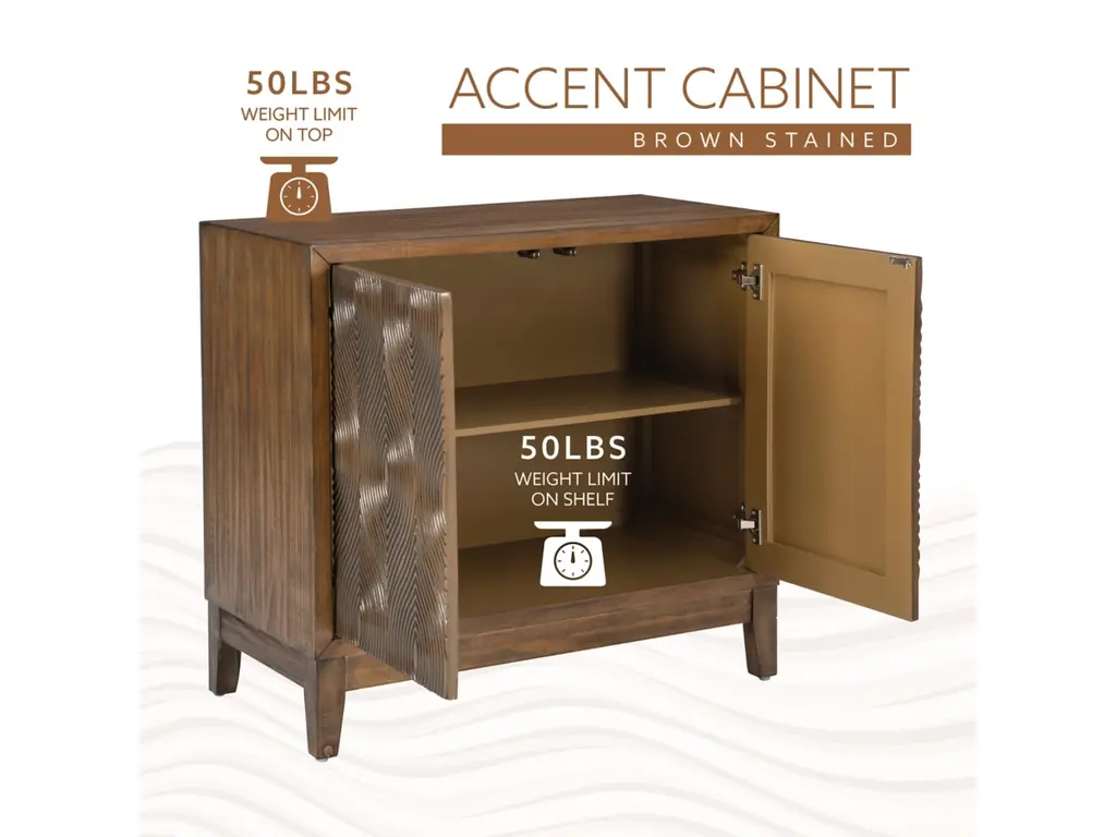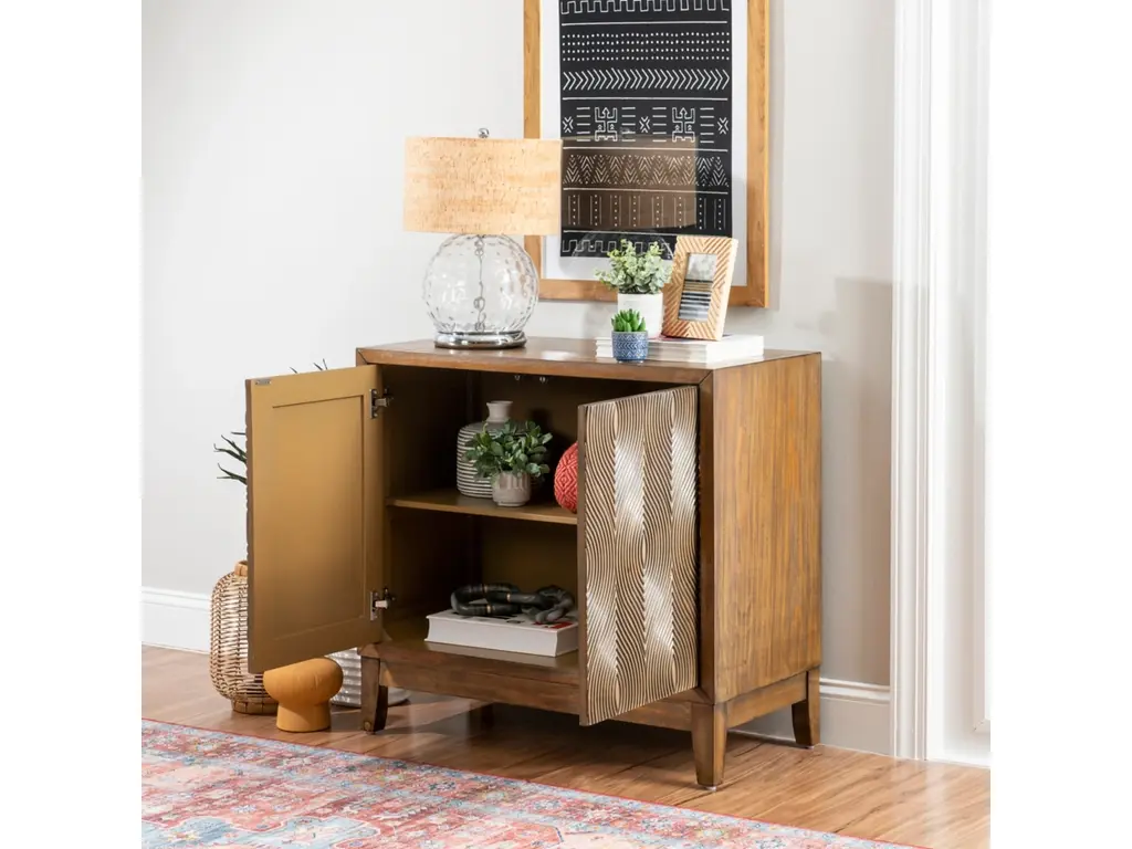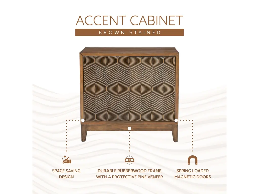 Revitalize your home decor with this budget friendly accent cabinet, seamlessly blending bold, abstract design with practical functionality. The two doors showcase a mesmerizing cutout pattern of swirls, creating an illusion of movement that captivates the eye. Featuring a single shelf with a durable, solid wood brown frame and spring-loaded magnetic doors, this beautiful piece is perfect for organization and effortless access. From living electronics to bathroom linens, experience both style and functionality in one show stopping cabinet.