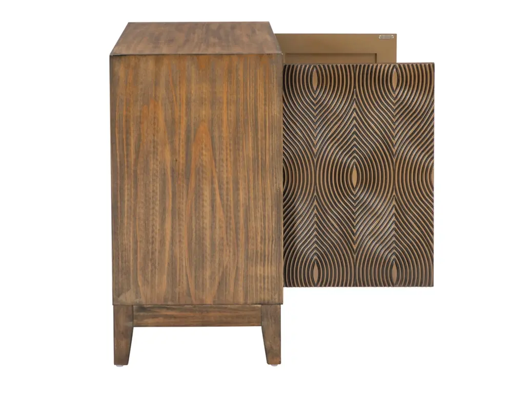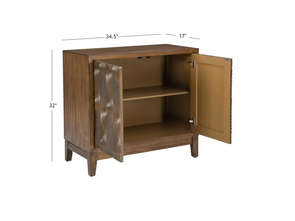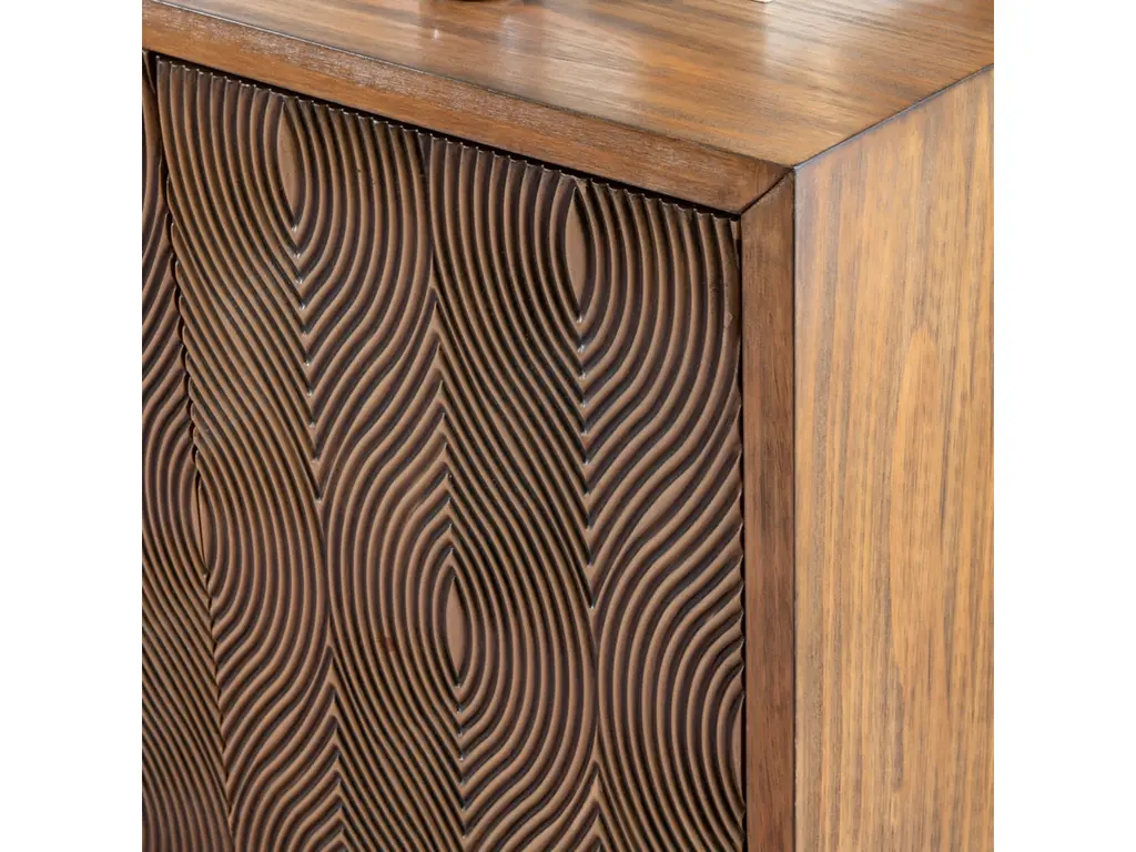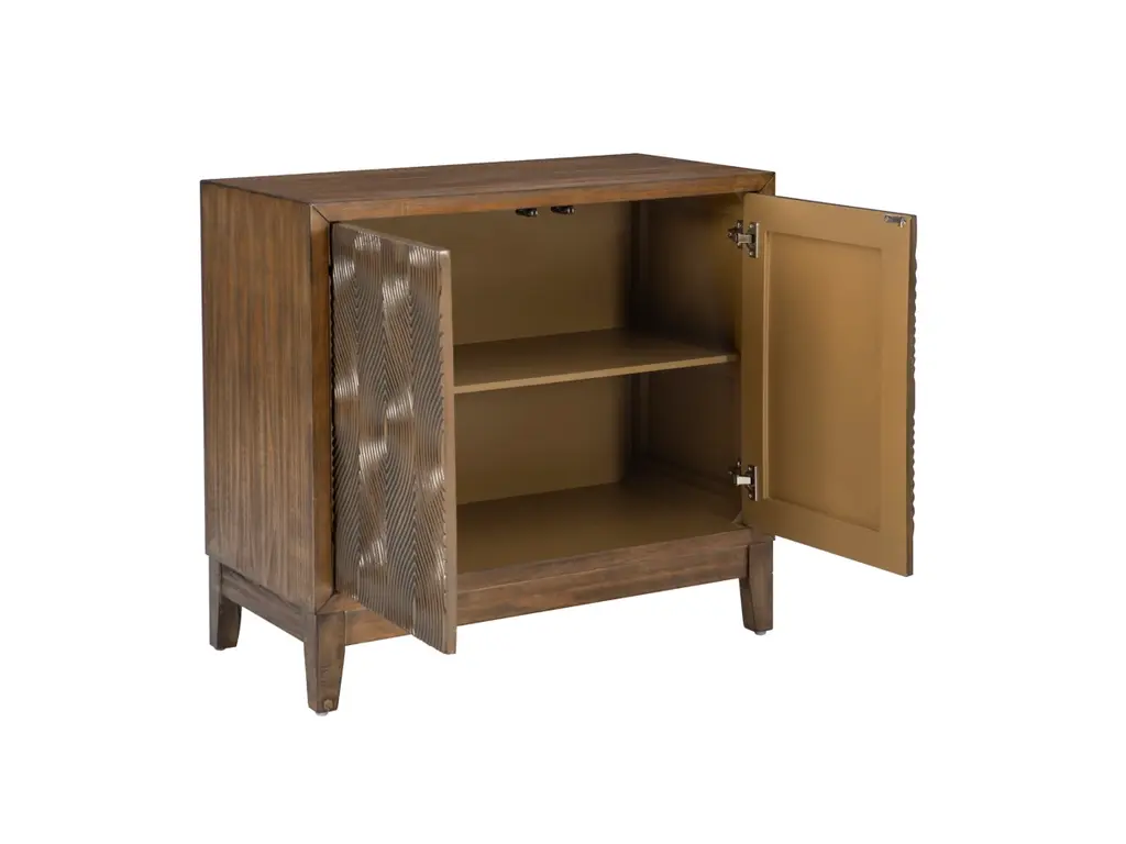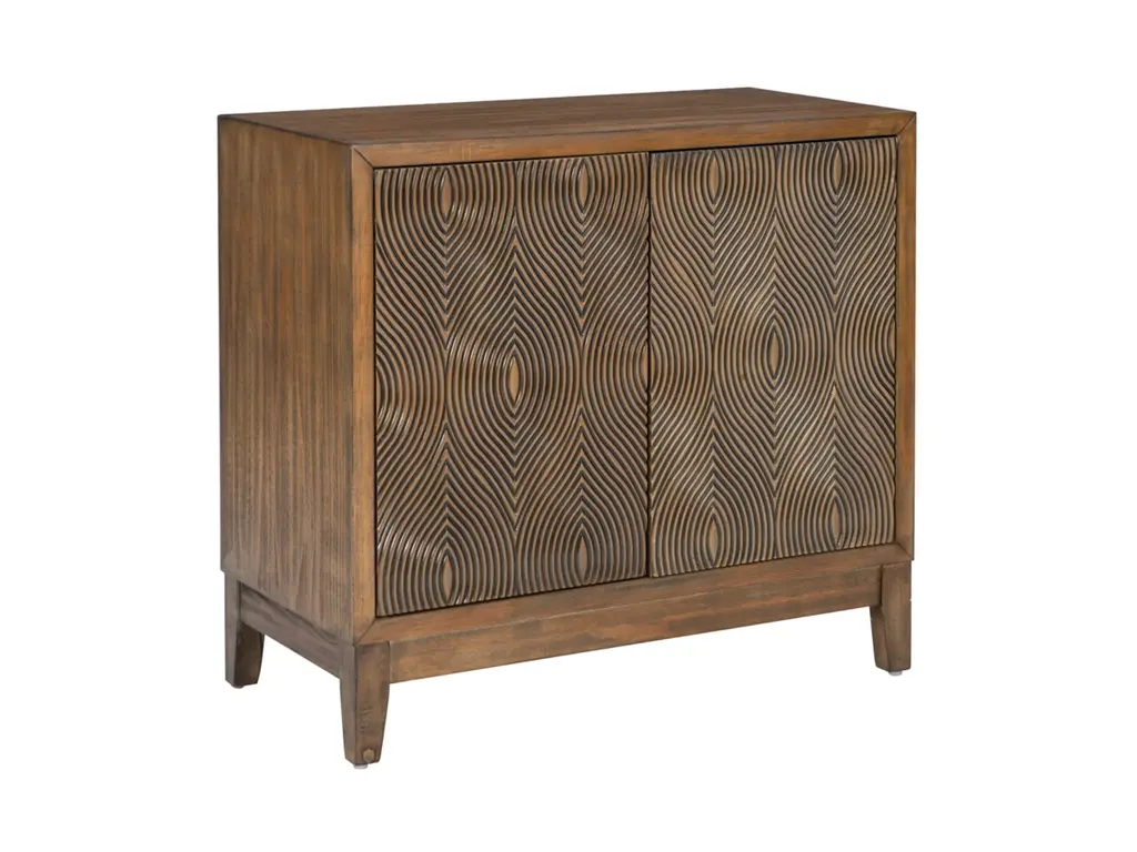 Revitalize your home decor with this budget friendly accent cabinet, seamlessly blending bold, abstract design with practical functionality. The two doors showcase a mesmerizing cutout pattern of swirls, creating an illusion of movement that captivates the eye. Featuring a single shelf with a durable, solid wood brown frame and spring-loaded magnetic doors, this beautiful piece is perfect for organization and effortless access. From living electronics to bathroom linens, experience both style and functionality in one show stopping cabinet.
