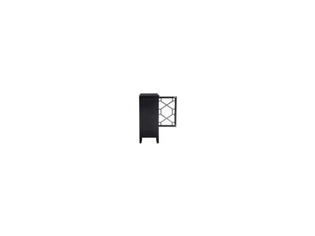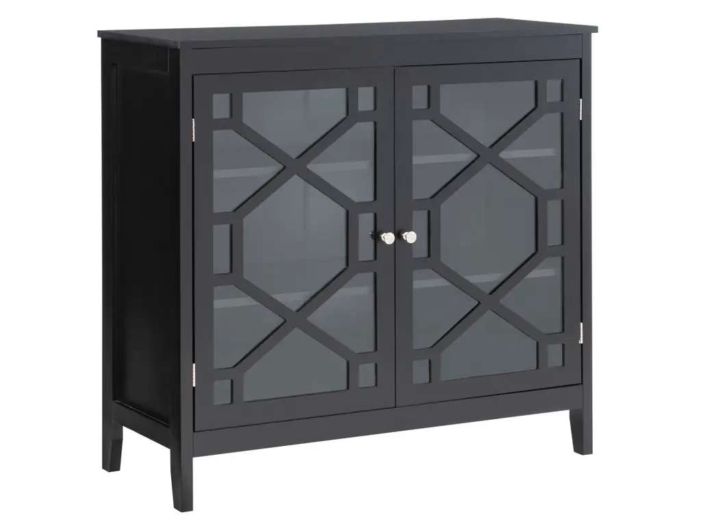 Why sacrifice style when adding storage space to your home? This lovely cabinet offers a clean-lined design in a versatile solid black hue. The cabinet front features glass with a pane overlay and sleek silvertone pulls, which open to reveal three tiers of interior shelving space. Set this piece in your dining area for use in tucking away serving essentials or use it to bring order to your entryway. It is sure to be a wonderful addition to any home.