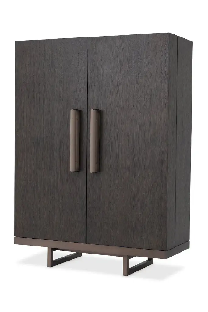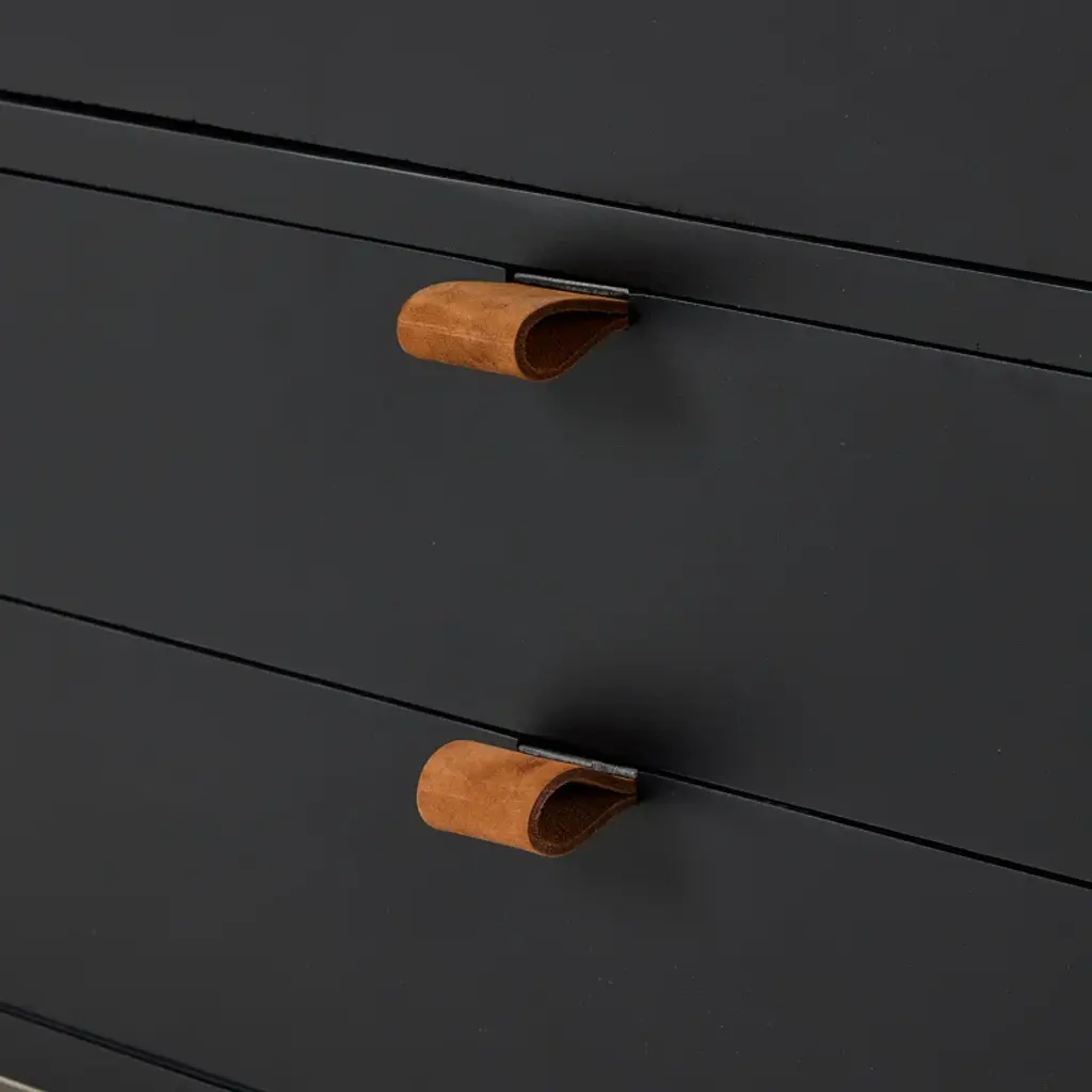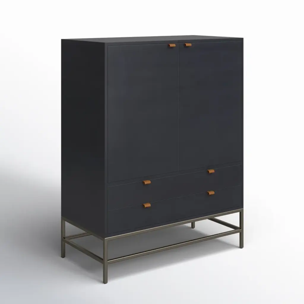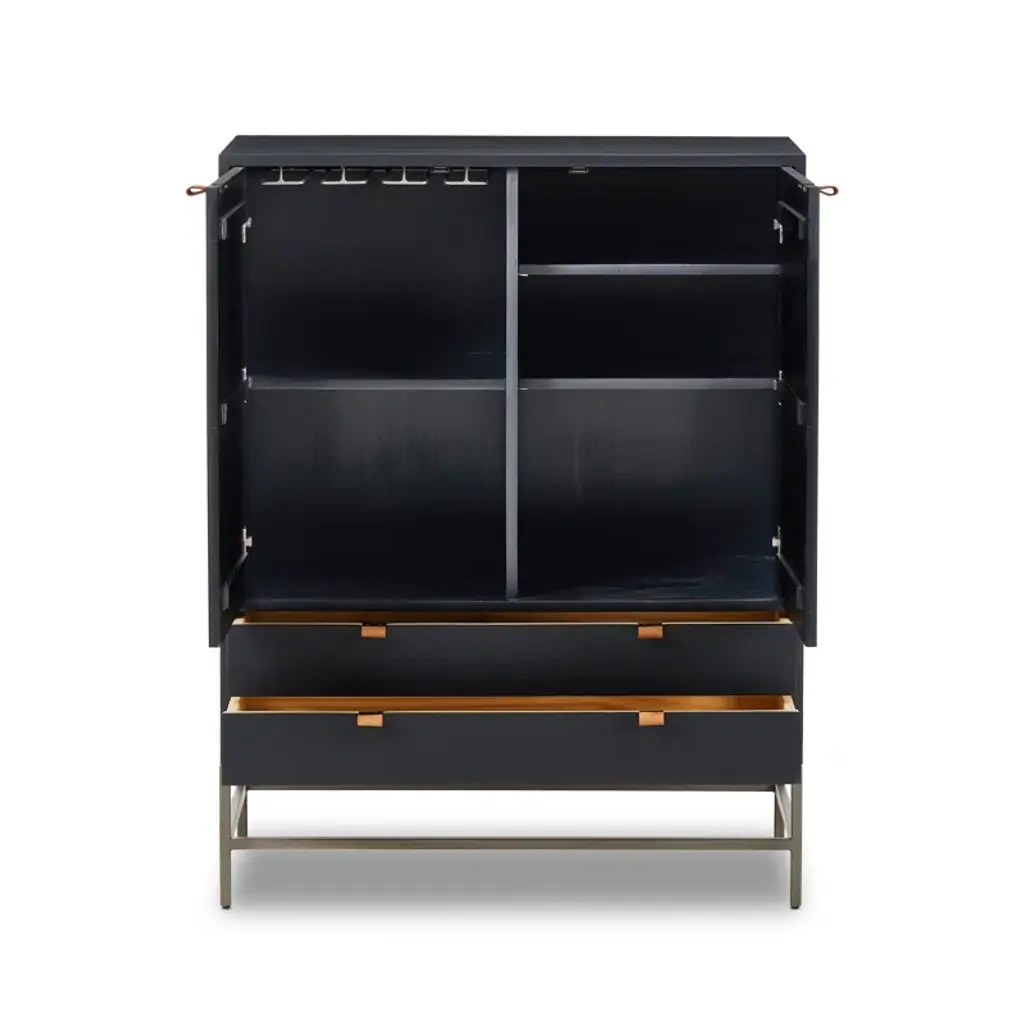 Asymmetry creates a dynamic, modern aesthetic to this cabinet. Impulses from the mid-century are reinvented with a mix of warm woods and hard iron. Top-grain leather hardware.