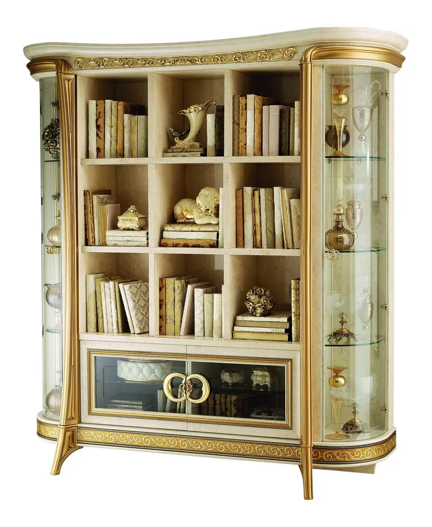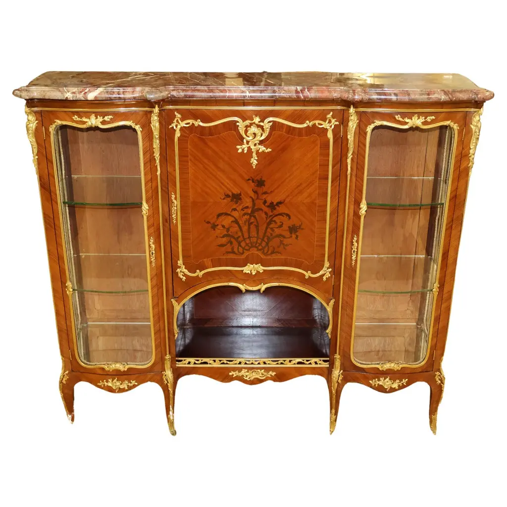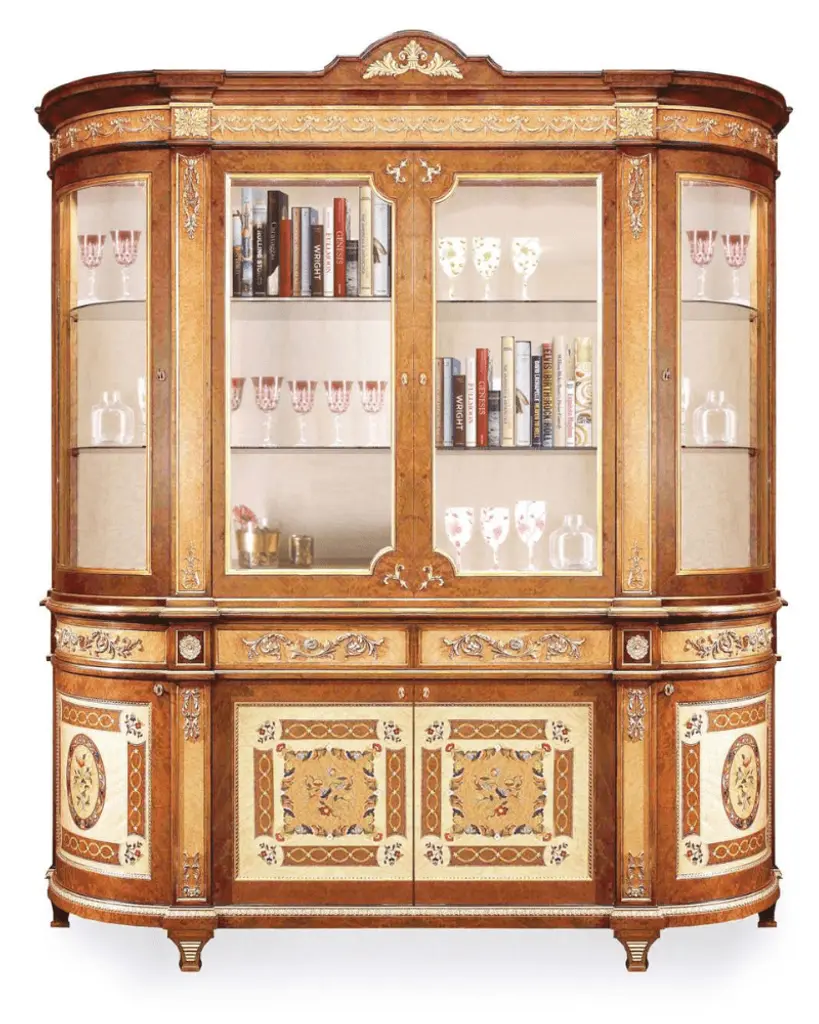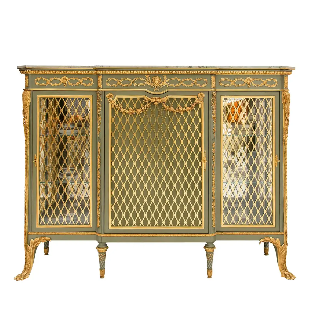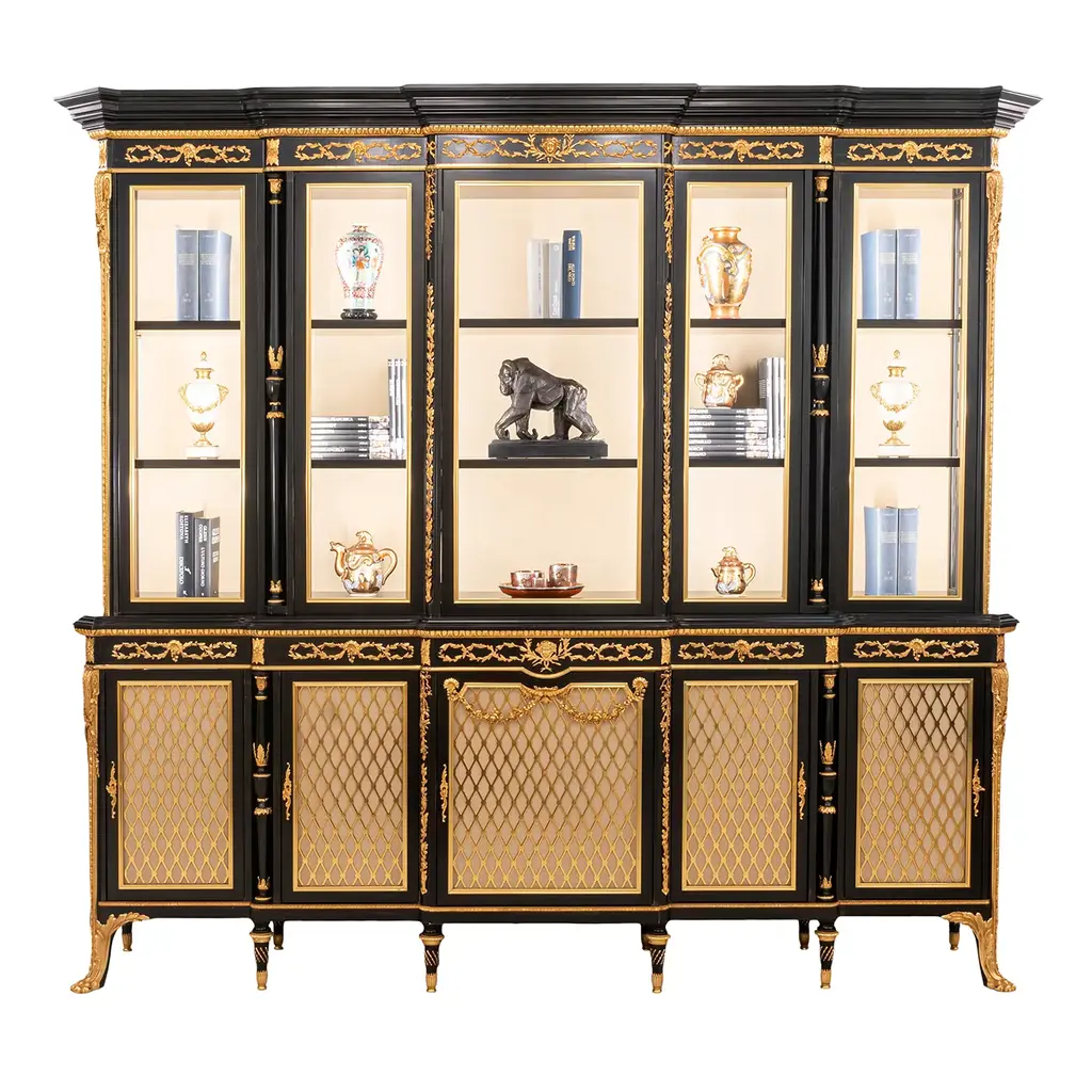 This Louis XVI-inspired transition style display cabinet is a veritable objet d'art. The black lacquered wood frame is accented with French gold patina and 24kt gold plated bronze beads and details, best exemplified in the fronds framing the central doors and lateral accents flowing into the feet. The doors open to reveal ample storage space, with interior lining and grids in nubuck leather, heightening the textural richness of the piece. Please contact the Concierge for further information.