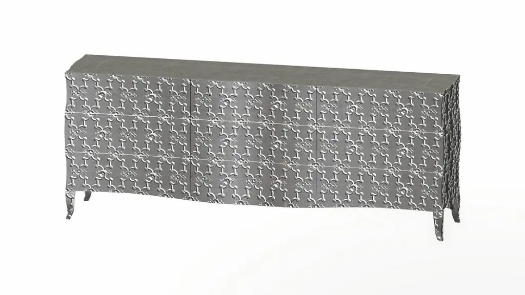 Renowned designer Paul Mathieu created this large dresser with 9 drawers with his interpretation of Fleur de Lis motif carved all over the piece just like the other two designs namely the Louise Semainier and Demi Louise Semainier which are part of the Louise Collection he created for Stephanie OdegardCrafted with utmost care and attention to detail, these Louis XVI Fleur De Lis are made to order and are available in twelve metal clad finishes, ensuring that you can choose the perfect one to match your individual style and taste. The use of high-quality materials and expert craftsmanship ensure that each Art Deco Louis XVI Fleur De Lis is not only beautiful but also a true piece of art.The curved legs and side arms of this Art Deco Louis XVI Fleur De Lis are hand carved from solid pieces of teak. Pattern makers trace and cut complex forms that will cover the chair in a skin of copper, white bronze, brass or antiqued white bronze The metal finishes will tarnish over time. Regular non-abrasive household metal polishes can be used to restore the original luster.Overall, if you're looking for a piece of furniture that combines luxury, comfort, and style, then the Art Deco Louis XVI Fleur De Lis is an excellent choice. With its distinctive curved profile and multiple finish options, this Chair set is sure to elevate the look of any room it is placed in, and be a beloved addition to your home for years to come.The images shown in this listing are shot in different lighting conditions and/or are 3D illustrations. We encourage our customers to please request a sample or a full sample set of 12 finishes so that they can experience the finish first hand. Louise Art Deco Apothecary Cabinets Fleur De Lis Mid. Hammered White Bronze Size- 84"x 18"x 33"HMaterials - White Bronze, Metal sheet, Teak, Wood, MetalTechniques: Hand-Crafted, Hand-Carved, Metal Work, Wood Work, Metal Wrapping, PolishedPlease note that moisture in air, sudden change in temperature and natural movement of wood over time causes the metal to wrinkle or bubble up. We use well seasoned, reclaimed teak and high quality marine grade MDF (wherever technically possible) to avoid and delay the mentioned changes. However a perfect stability of metal cannot be guaranteed. Please note that our smooth finish metal clad pieces will have some unavoidable tool marks. This is proof that everything is done by hand. The smooth finish will not come out like a machine made perfect surface and the master artisan will do their best to make it look as good/clean/stable/perfect as he possibly can.The antique white bronze finish is hand done by using an acidic chemical over the white bronze finish to recreate a natural patination. Like with the natural patination of silver, copper, or brass, the final result and color uniformity of the patina cannot be guaranteed. The goal of this finish is to achieve rainbow-like shades with dull, shiny, cloudy, and streaky patches to give an illusion of antiquing. Please note:None of our metal clad pieces are treated with a protective “finish” thus enabling the items to age naturally over time. We will of course polish them well before we pack them. a) Copper oxidizes faster than the other metals. In six to twelve months it will most likely lose its shine and will gradually turn to different shades of brown and/or green/blue. This aging process and its effect is referred to as verdigris. After a year the piece should not change much more. Copper does not rust, but does require periodic cleaning in order to retain its original shine if that the preferred option. ('BRASSO' or any known copper polish can be used to polish copper).b) Brass retains its shine for far longer than others, but will tarnish if not cleaned on occasion. ('BRASSO' is made to polish brass).c) White bronze, has the least tendency to show age or tarnish. If kept in a controlled climate, this metal will hold its shine for years. It can be cleaned with a cleanser and polished with a cloth. d) The antiqued white bronze finish will react with the natural elements the fastest in the beginning but it too will stop reacting and will settle down in a stable state like copper after 6-12 months. Since it is already antiqued and looked like it is tarnished, as described in an earlier message, this fast reaction will not change the over all look. In that way this surface is most forgiving. The images shown in this listing are shot in different lighting conditions and/or are 3D illustrations. We encourage our customers to please request a sample or a full sample set of 12 finishes so that they can experience the finish first hand.
