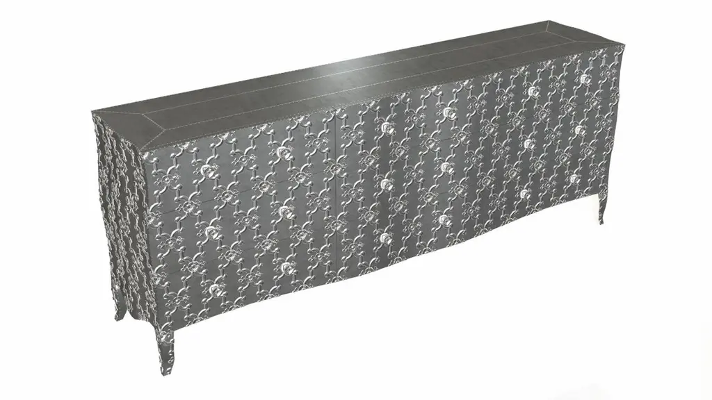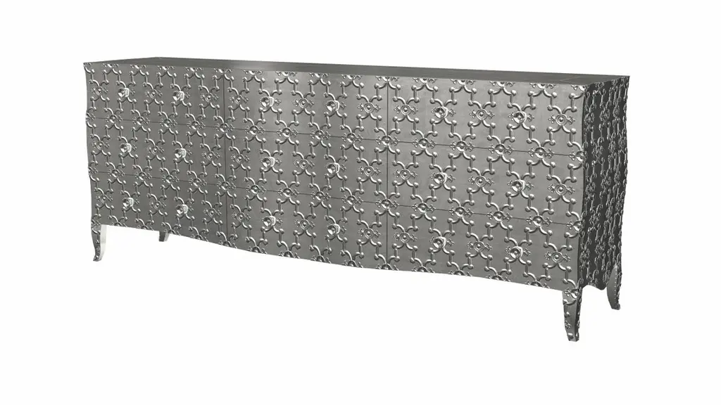 Renowned designer Paul Mathieu created this large dresser with 9 drawers with his interpretation of Fleur de Lis motif carved all over the piece just like the other two designs namely the Louise Semainier and Demi Louise Semainier which are part of the Louise Collection he created for Stephanie OdegardCrafted with utmost care and attention to detail, these Louis XVI Fleur De Lis are made to order and are available in twelve metal clad finishes, ensuring that you can choose the perfect one to match your individual style and taste. The use of high-quality materials and expert craftsmanship ensure that each Art Deco Louis XVI Fleur De Lis is not only beautiful but also a true piece of art.The curved legs and side arms of this Art Deco Louis XVI Fleur De Lis are hand carved from solid pieces of teak. Pattern makers trace and cut complex forms that will cover the chair in a skin of copper, white bronze, brass or antiqued white bronze The metal finishes will tarnish over time. Regular non-abrasive household metal polishes can be used to restore the original luster.Overall, if you're looking for a piece of furniture that combines luxury, comfort, and style, then the Art Deco Louis XVI Fleur De Lis is an excellent choice. With its distinctive curved profile and multiple finish options, this Chair set is sure to elevate the look of any room it is placed in, and be a beloved addition to your home for years to come.The images shown in this listing are shot in different lighting conditions and/or are 3D illustrations. We encourage our customers to please request a sample or a full sample set of 12 finishes so that they can experience the finish first hand. Louise Art Deco Apothecary Cabinets Fleur De Lis Smooth White Bronze by Paul M.Size- 84"x 18"x 33"HMaterials - White Bronze, Metal sheet, Teak, Wood, MetalTechniques: Hand-Crafted, Hand-Carved, Metal Work, Wood Work, Metal Wrapping, PolishedPlease note that moisture in air, sudden change in temperature and natural movement of wood over time causes the metal to wrinkle or bubble up. We use well seasoned, reclaimed teak and high quality marine grade MDF (wherever technically possible) to avoid and delay the mentioned changes. However a perfect stability of metal cannot be guaranteed. Please note that our smooth finish metal clad pieces will have some unavoidable tool marks. This is proof that everything is done by hand. The smooth finish will not come out like a machine made perfect surface and the master artisan will do their best to make it look as good/clean/stable/perfect as he possibly can.The antique white bronze finish is hand done by using an acidic chemical over the white bronze finish to recreate a natural patination. Like with the natural patination of silver, copper, or brass, the final result and color uniformity of the patina cannot be guaranteed. The goal of this finish is to achieve rainbow-like shades with dull, shiny, cloudy, and streaky patches to give an illusion of antiquing. Please note:None of our metal clad pieces are treated with a protective “finish” thus enabling the items to age naturally over time. We will of course polish them well before we pack them. a) Copper oxidizes faster than the other metals. In six to twelve months it will most likely lose its shine and will gradually turn to different shades of brown and/or green/blue. This aging process and its effect is referred to as verdigris. After a year the piece should not change much more. Copper does not rust, but does require periodic cleaning in order to retain its original shine if that the preferred option. ('BRASSO' or any known copper polish can be used to polish copper).b) Brass retains its shine for far longer than others, but will tarnish if not cleaned on occasion. ('BRASSO' is made to polish brass).c) White bronze, has the least tendency to show age or tarnish. If kept in a controlled climate, this metal will hold its shine for years. It can be cleaned with a cleanser and polished with a cloth. d) The antiqued white bronze finish will react with the natural elements the fastest in the beginning but it too will stop reacting and will settle down in a stable state like copper after 6-12 months. Since it is already antiqued and looked like it is tarnished, as described in an earlier message, this fast reaction will not change the over all look. In that way this surface is most forgiving. The images shown in this listing are shot in different lighting conditions and/or are 3D illustrations. We encourage our customers to please request a sample or a full sample set of 12 finishes so that they can experience the finish first hand.