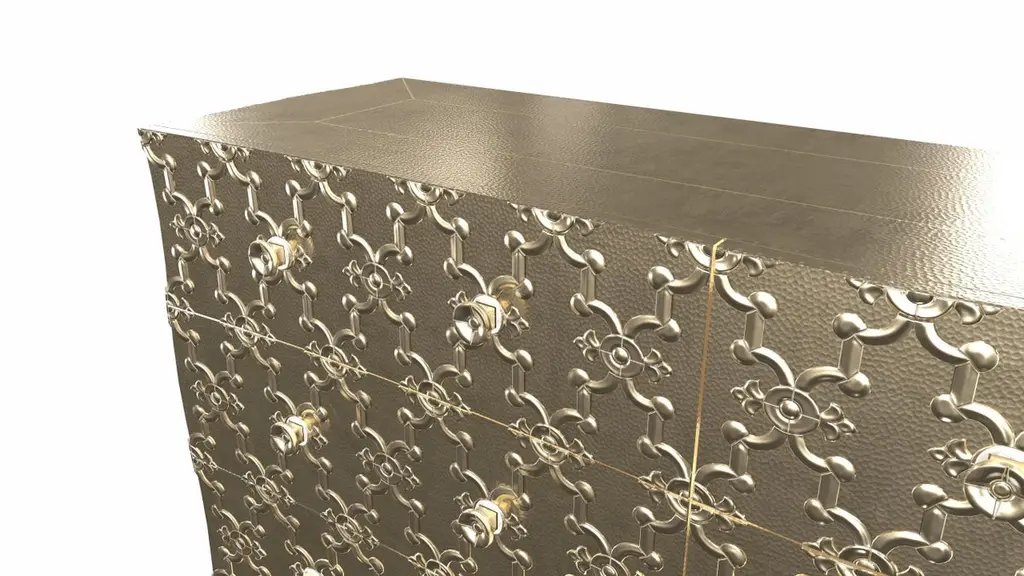 Renowned designer Paul Mathieu created this large dresser with 9 drawers with his interpretation of Fleur de Lis motif carved all over the piece just like the other two designs namely the Louise Semainier and Demi Louise Semainier which are part of the Louise Collection he created for Stephanie OdegardCrafted with utmost care and attention to detail, these Louis XVI Fleur De Lis are made to order and are available in twelve metal clad finishes, ensuring that you can choose the perfect one to match your individual style and taste. The use of high-quality materials and expert craftsmanship ensure that each Art Deco Louis XVI Fleur De Lis is not only beautiful but also a true piece of art.The curved legs and side arms of this Art Deco Louis XVI Fleur De Lis are hand carved from solid pieces of teak. Pattern makers trace and cut complex forms that will cover the chair in a skin of copper, white bronze, brass or antiqued white bronze The metal finishes will tarnish over time. Regular non-abrasive household metal polishes can be used to restore the original luster.Overall, if you're looking for a piece of furniture that combines luxury, comfort, and style, then the Art Deco Louis XVI Fleur De Lis is an excellent choice. With its distinctive curved profile and multiple finish options, this Chair set is sure to elevate the look of any room it is placed in, and be a beloved addition to your home for years to come.The images shown in this listing are shot in different lighting conditions and/or are 3D illustrations. We encourage our customers to please request a sample or a full sample set of 12 finishes so that they can experience the finish first hand. Louise Art Deco Apothecary Cabinets Mid. Hammered Brass by Paul MathieuSize- 84"x 18"x 33"HMaterials - Brass, Metal sheet, Teak, Wood, MetalTechniques: Hand-Crafted, Hand-Carved, Metal Work, Wood Work, Metal Wrapping, PolishedPlease note that moisture in air, sudden change in temperature and natural movement of wood over time causes the metal to wrinkle or bubble up. We use well seasoned, reclaimed teak and high quality marine grade MDF (wherever technically possible) to avoid and delay the mentioned changes. However a perfect stability of metal cannot be guaranteed. Please note that our smooth finish metal clad pieces will have some unavoidable tool marks. This is proof that everything is done by hand. The smooth finish will not come out like a machine made perfect surface and the master artisan will do their best to make it look as good/clean/stable/perfect as he possibly can.The antique white bronze finish is hand done by using an acidic chemical over the white bronze finish to recreate a natural patination. Like with the natural patination of silver, copper, or brass, the final result and color uniformity of the patina cannot be guaranteed. The goal of this finish is to achieve rainbow-like shades with dull, shiny, cloudy, and streaky patches to give an illusion of antiquing. Please note:None of our metal clad pieces are treated with a protective “finish” thus enabling the items to age naturally over time. We will of course polish them well before we pack them. a) Copper oxidizes faster than the other metals. In six to twelve months it will most likely lose its shine and will gradually turn to different shades of brown and/or green/blue. This aging process and its effect is referred to as verdigris. After a year the piece should not change much more. Copper does not rust, but does require periodic cleaning in order to retain its original shine if that the preferred option. ('BRASSO' or any known copper polish can be used to polish copper).b) Brass retains its shine for far longer than others, but will tarnish if not cleaned on occasion. ('BRASSO' is made to polish brass).c) White bronze, has the least tendency to show age or tarnish. If kept in a controlled climate, this metal will hold its shine for years. It can be cleaned with a cleanser and polished with a cloth. d) The antiqued white bronze finish will react with the natural elements the fastest in the beginning but it too will stop reacting and will settle down in a stable state like copper after 6-12 months. Since it is already antiqued and looked like it is tarnished, as described in an earlier message, this fast reaction will not change the over all look. In that way this surface is most forgiving. The images shown in this listing are shot in different lighting conditions and/or are 3D illustrations. We encourage our customers to please request a sample or a full sample set of 12 finishes so that they can experience the finish first hand.