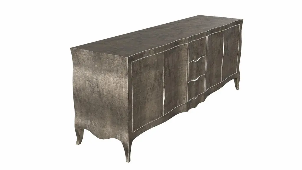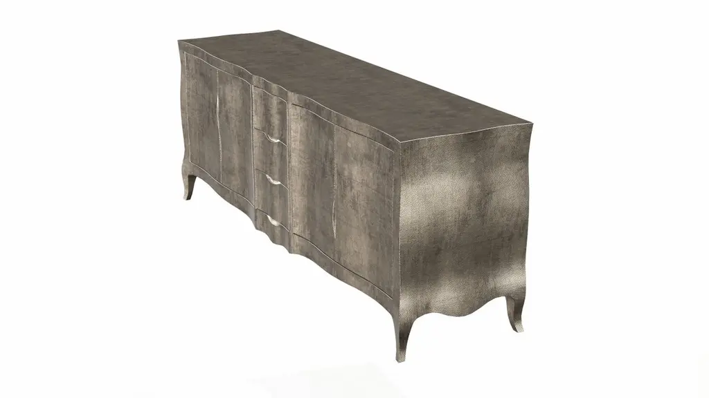 Louise Credenza from our Louise Collection. The renowned designer Paul Mathieu chose the name “Louise Credenza” when he created his more feminine version of Louis XV (1730-1760) furniture. The characteristic cabriole leg, curving outward at the knee and inward towards the foot in an "S" shape was born during this period. It is during the same era that English furniture makers produced the Queen Anne and Chippendale styles.Crafted with utmost care and attention to detail, these Louise Credenza are made to order and are available in twelve metal clad finishes, ensuring that you can choose the perfect one to match your individual style and taste. The use of high-quality materials and expert craftsmanship ensure that each Art Deco Louise Credenza is not only beautiful but also a true piece of Art.The curved legs and side arms of this Art Deco Louise Credenza are hand carved from solid pieces of teak. Pattern makers trace and cut complex forms that will cover the chair in a skin of copper, white bronze, brass or antiqued white bronze The metal finishes will tarnish over time. Regular non-abrasive household metal polishes can be used to restore the original luster.Overall, if you're looking for a piece of furniture that combines luxury, comfort, and style, then the Art Deco Louise Credenza is an excellent choice. With its distinctive curved profile and multiple finish options, this Chair set is sure to elevate the look of any room it is placed in, and be a beloved addition to your home for years to come.The images shown in this listing are shot in different lighting conditions and/or are 3D illustrations. We encourage our customers to please request a sample or a full sample set of 12 finishes so that they can experience the finish first hand. Louise Credenza Art Deco Cabinets in Mid. Hammered Antique Bronze by Paul Mathieu for Stephanie OdegardSize- 78"L x 21"W x 30"HMaterials - Antique Bronze, Metal sheet, Teak, Wood, MetalTechniques: Hand-Crafted, Hand-Carved, Metal Work, Wood Work, Metal Wrapping, PolishedPlease note that moisture in air, sudden change in temperature and natural movement of wood over time causes the metal to wrinkle or bubble up. We use well seasoned, reclaimed teak and high quality marine grade MDF (wherever technically possible) to avoid and delay the mentioned changes. However a perfect stability of metal cannot be guaranteed. Please note that our smooth finish metal clad pieces will have some unavoidable tool marks. This is proof that everything is done by hand. The smooth finish will not come out like a machine made perfect surface and the master Artisan will do their best to make it look as good/clean/stable/perfect as he possibly can.The antique white bronze finish is hand done by using an acidic chemical over the white bronze finish to recreate a natural patination. Like with the natural patination of silver, copper, or brass, the final result and color uniformity of the patina cannot be guaranteed. The goal of this finish is to achieve rainbow-like shades with dull, shiny, cloudy, and streaky patches to give an illusion of antiquing. Please note:None of our metal clad pieces are treated with a protective “finish” thus enabling the items to age naturally over time. We will of course polish them well before we pack them. a) Copper oxidizes faster than the other metals. In six to twelve months it will most likely lose its shine and will gradually turn to different shades of brown and/or green/blue. This aging process and its effect is referred to as verdigris. After a year the piece should not change much more. Copper does not rust, but does require periodic cleaning in order to retain its original shine if that the preferred option. ('BRASSO' or any known copper polish can be used to polish copper).b) Brass retains its shine for far longer than others, but will tarnish if not cleaned on occasion. ('BRASSO' is made to polish brass).c) White bronze, has the least tendency to show age or tarnish. If kept in a controlled climate, this metal will hold its shine for years. It can be cleaned with a cleanser and polished with a cloth. d) The antiqued white bronze finish will react with the natural elements the fastest in the beginning but it too will stop reacting and will settle down in a stable state like copper after 6-12 months. Since it is already antiqued and looked like it is tarnished, as described in an earlier message, this fast reaction will not change the over all look. In that way this surface is most forgiving. The images shown in this listing are shot in different lighting conditions and/or are 3D illustrations. We encourage our customers to please request a sample or a full sample set of 12 finishes so that they can experience the finish first hand.