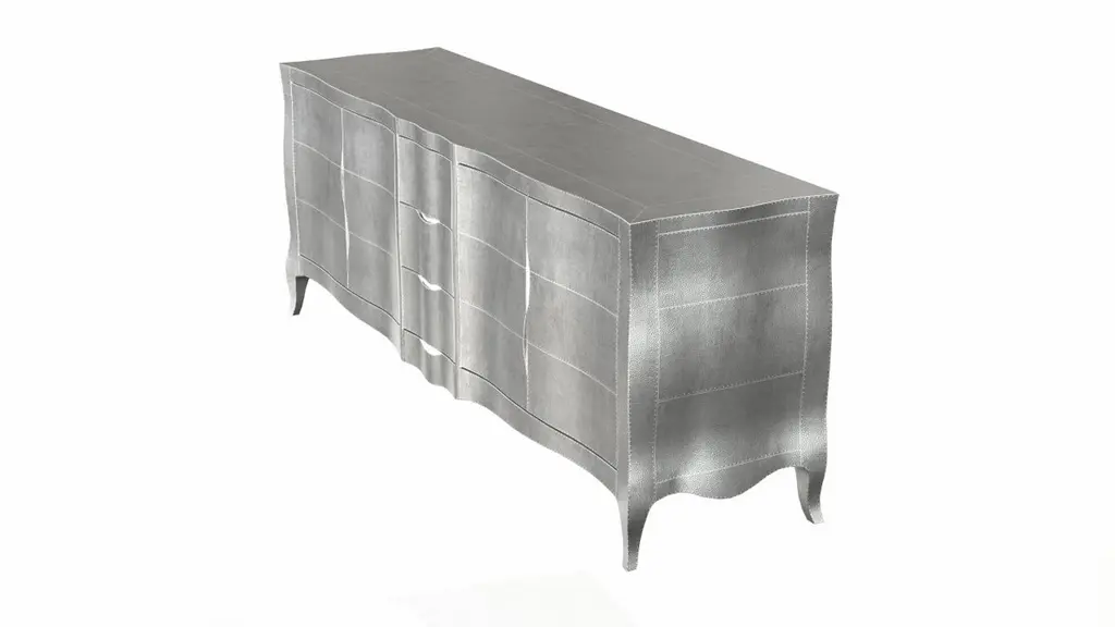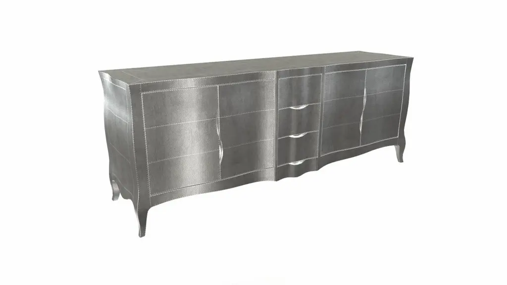 Louise Credenza from our Louise Collection. The renowned designer Paul Mathieu chose the name “Louise Credenza” when he created his more feminine version of Louis XV (1730-1760) furniture. The characteristic cabriole leg, curving outward at the knee and inward towards the foot in an "S" shape was born during this period. It is during the same era that English furniture makers produced the Queen Anne and Chippendale styles.Crafted with utmost care and attention to detail, these Louise Credenza are made to order and are available in twelve metal clad finishes, ensuring that you can choose the perfect one to match your individual style and taste. The use of high-quality materials and expert craftsmanship ensure that each Art Deco Louise Credenza is not only beautiful but also a true piece of Art.The curved legs and side arms of this Art Deco Louise Credenza are hand carved from solid pieces of teak. Pattern makers trace and cut complex forms that will cover the chair in a skin of copper, white bronze, brass or antiqued white bronze The metal finishes will tarnish over time. Regular non-abrasive household metal polishes can be used to restore the original luster.Overall, if you're looking for a piece of furniture that combines luxury, comfort, and style, then the Art Deco Louise Credenza is an excellent choice. With its distinctive curved profile and multiple finish options, this Chair set is sure to elevate the look of any room it is placed in, and be a beloved addition to your home for years to come.The images shown in this listing are shot in different lighting conditions and/or are 3D illustrations. We encourage our customers to please request a sample or a full sample set of 12 finishes so that they can experience the finish first hand. Louise Credenza Art Deco Cabinets in Mid. Hammered White Bronze by Paul Mathieu for Stephanie OdegardSize- 78"L x 21"W x 30"HMaterials - White Bronze, Metal sheet, Teak, Wood, MetalTechniques: Hand-Crafted, Hand-Carved, Metal Work, Wood Work, Metal Wrapping, PolishedPlease note that moisture in air, sudden change in temperature and natural movement of wood over time causes the metal to wrinkle or bubble up. We use well seasoned, reclaimed teak and high quality marine grade MDF (wherever technically possible) to avoid and delay the mentioned changes. However a perfect stability of metal cannot be guaranteed. Please note that our smooth finish metal clad pieces will have some unavoidable tool marks. This is proof that everything is done by hand. The smooth finish will not come out like a machine made perfect surface and the master Artisan will do their best to make it look as good/clean/stable/perfect as he possibly can.The antique white bronze finish is hand done by using an acidic chemical over the white bronze finish to recreate a natural patination. Like with the natural patination of silver, copper, or brass, the final result and color uniformity of the patina cannot be guaranteed. The goal of this finish is to achieve rainbow-like shades with dull, shiny, cloudy, and streaky patches to give an illusion of antiquing. Please note:None of our metal clad pieces are treated with a protective “finish” thus enabling the items to age naturally over time. We will of course polish them well before we pack them. a) Copper oxidizes faster than the other metals. In six to twelve months it will most likely lose its shine and will gradually turn to different shades of brown and/or green/blue. This aging process and its effect is referred to as verdigris. After a year the piece should not change much more. Copper does not rust, but does require periodic cleaning in order to retain its original shine if that the preferred option. ('BRASSO' or any known copper polish can be used to polish copper).b) Brass retains its shine for far longer than others, but will tarnish if not cleaned on occasion. ('BRASSO' is made to polish brass).c) White bronze, has the least tendency to show age or tarnish. If kept in a controlled climate, this metal will hold its shine for years. It can be cleaned with a cleanser and polished with a cloth. d) The antiqued white bronze finish will react with the natural elements the fastest in the beginning but it too will stop reacting and will settle down in a stable state like copper after 6-12 months. Since it is already antiqued and looked like it is tarnished, as described in an earlier message, this fast reaction will not change the over all look. In that way this surface is most forgiving. The images shown in this listing are shot in different lighting conditions and/or are 3D illustrations. We encourage our customers to please request a sample or a full sample set of 12 finishes so that they can experience the finish first hand.