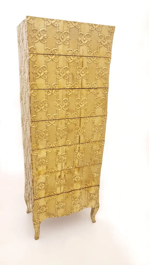 “Semainier” refers to a French piece of furniture with seven drawers (Fr. Semaine = week). It is part of the Louise Collection designed by renowned designer Paul Mathieu. A remarkable piece in which each of the exterior faces is entirely sculpted out of a solid piece of wood by hand, then covered with metal sheeting. The available options for metal cladding are brass, white bronze, antiqued bronze, silver and copper. Both silver and copper will tarnish over time. Regular non-abrasive household metal polishes can be used to restore the original finish. Crafted with utmost care and attention to detail, these Louise Semainier are made to order and are available in twelve metal clad finishes, ensuring that you can choose the perfect one to match your individual style and taste. The use of high-quality materials and expert craftsmanship ensure that each Art Deco Louise Semainier is not only beautiful but also a true piece of art.The curved legs and side arms of this Art Deco Louise Semainier are hand carved from solid pieces of teak. Pattern makers trace and cut complex forms that will cover the chair in a skin of copper, white bronze, brass or antiqued white bronze The metal finishes will tarnish over time. Regular non-abrasive household metal polishes can be used to restore the original luster.Overall, if you're looking for a piece of furniture that combines luxury, comfort, and style, then the Art Deco Louise Semainier is an excellent choice. With its distinctive curved profile and multiple finish options, this Chair set is sure to elevate the look of any room it is placed in, and be a beloved addition to your home for years to come.The images shown in this listing are shot in different lighting conditions and/or are 3D illustrations. We encourage our customers to please request a sample or a full sample set of 12 finishes so that they can experience the finish first hand. Louise Semainier Apothecary Cabinets Fine Hammered Brass by Paul Mathieu for Stephanie OdegardSize- 24"x 16"x 66"HMaterials - Brass, Metal sheet, Teak, Wood, Metal.Techniques: Hand-Crafted, Hand-Carved, Metal Work, Wood Work, Metal Wrapping, PolishedPlease note that moisture in air, sudden change in temperature and natural movement of wood over time causes the metal to wrinkle or bubble up. We use well seasoned, reclaimed teak and high quality marine grade MDF (wherever technically possible) to avoid and delay the mentioned changes. However a perfect stability of metal cannot be guaranteed. Please note that our smooth finish metal clad pieces will have some unavoidable tool marks. This is proof that everything is done by hand. The smooth finish will not come out like a machine made perfect surface and the master artisan will do their best to make it look as good/clean/stable/perfect as he possibly can.The antique white bronze finish is hand done by using an acidic chemical over the white bronze finish to recreate a natural patination. Like with the natural patination of silver, copper, or brass, the final result and color uniformity of the patina cannot be guaranteed. The goal of this finish is to achieve rainbow-like shades with dull, shiny, cloudy, and streaky patches to give an illusion of antiquing. Please note:None of our metal clad pieces are treated with a protective “finish” thus enabling the items to age naturally over time. We will of course polish them well before we pack them. a) Copper oxidizes faster than the other metals. In six to twelve months it will most likely lose its shine and will gradually turn to different shades of brown and/or green/blue. This aging process and its effect is referred to as verdigris. After a year the piece should not change much more. Copper does not rust, but does require periodic cleaning in order to retain its original shine if that the preferred option. ('BRASSO' or any known copper polish can be used to polish copper).b) Brass retains its shine for far longer than others, but will tarnish if not cleaned on occasion. ('BRASSO' is made to polish brass).c) White bronze, has the least tendency to show age or tarnish. If kept in a controlled climate, this metal will hold its shine for years. It can be cleaned with a cleanser and polished with a cloth. d) The antiqued white bronze finish will react with the natural elements the fastest in the beginning but it too will stop reacting and will settle down in a stable state like copper after 6-12 months. Since it is already antiqued and looked like it is tarnished, as described in an earlier message, this fast reaction will not change the over all look. In that way this surface is most forgiving. The images shown in this listing are shot in different lighting conditions and/or are 3D illustrations. We encourage our customers to please request a sample or a full sample set of 12 finishes so that they can experience the finish first hand.