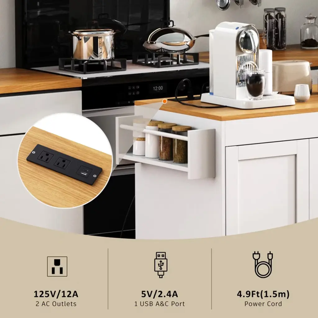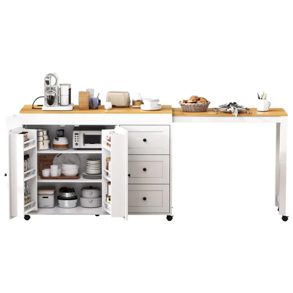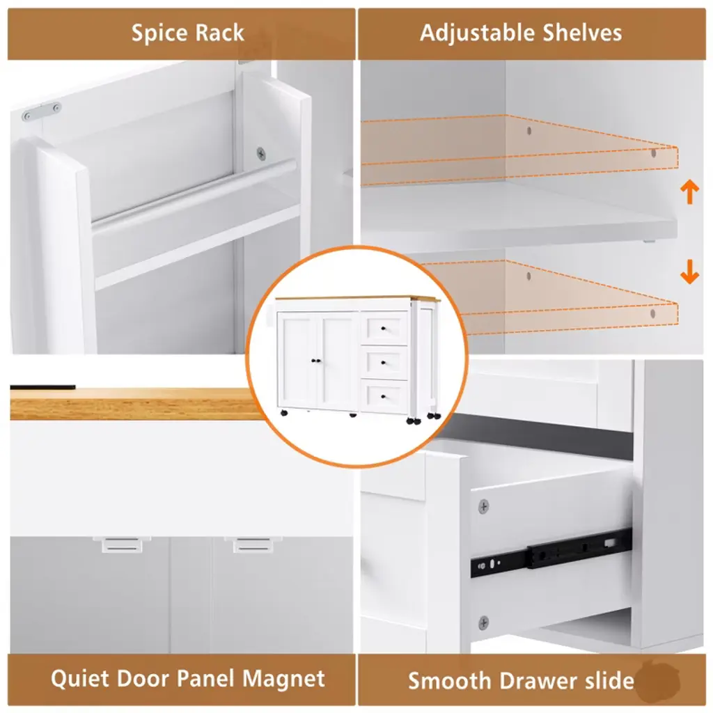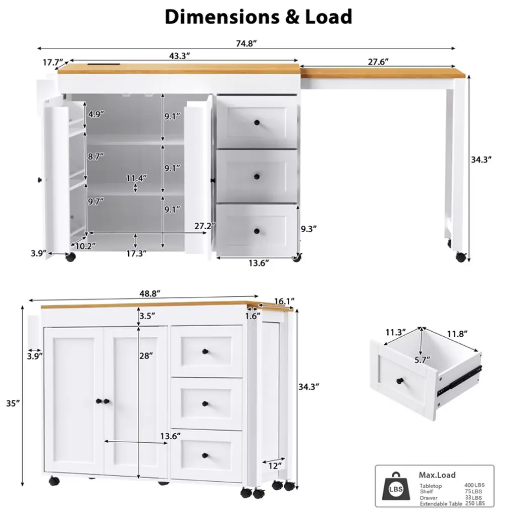 Lovson 74.8" Expandable Kitchen Island With 3 Drawers,power Outlet,casters,spice Rack,double Door Cabinet,for Kitchen,dining Room,white