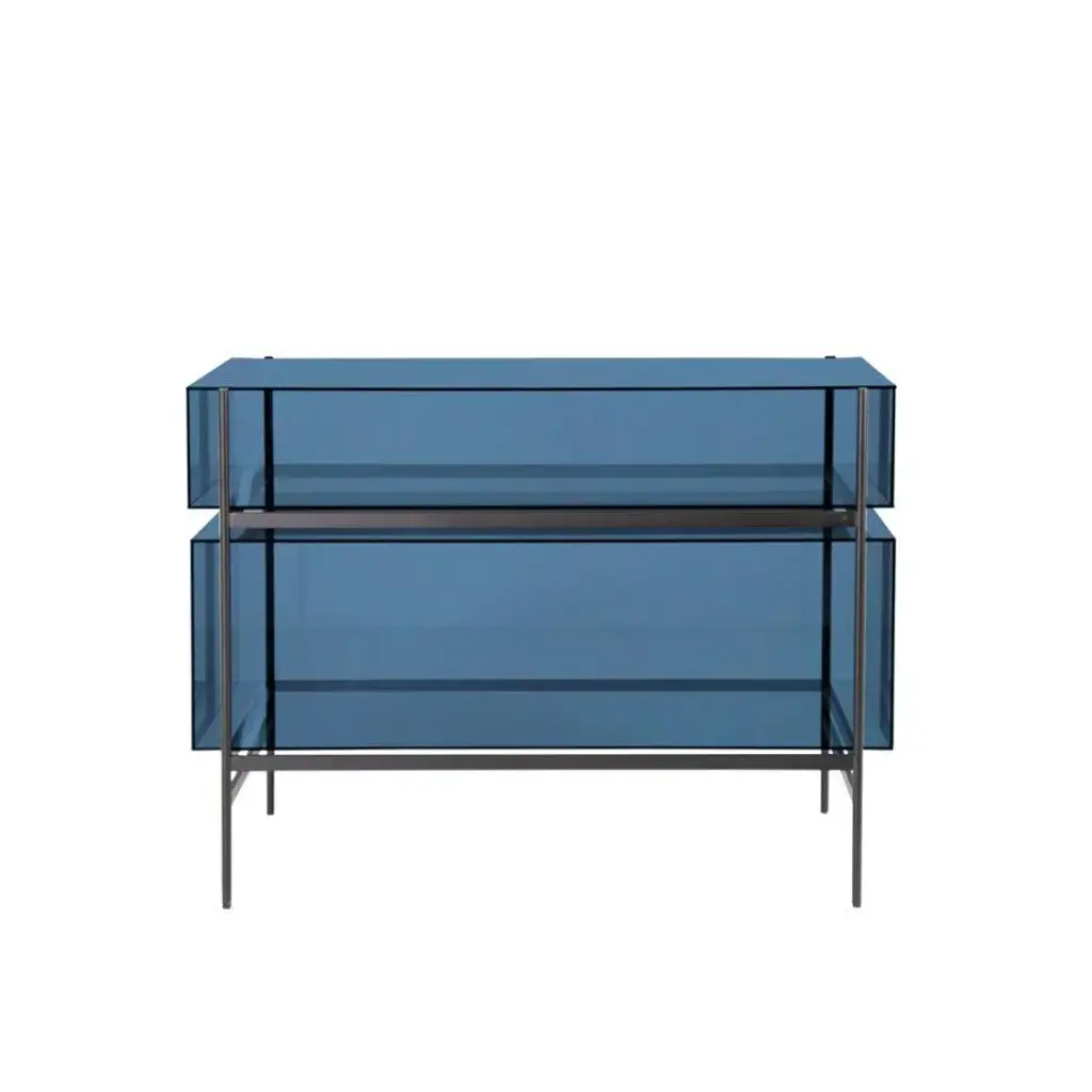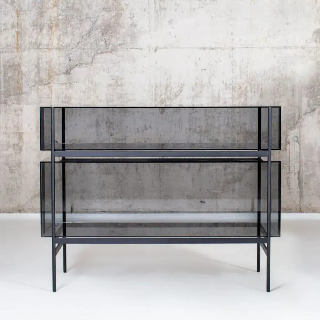 StudioVisser &Meijwaard describe their conception of lyn as a “graphic interplay between glass and the metal frameworks”. The doorless and diverse series of cabinets and high boards are equivalent to the designers’ ambition to rethink established forms, like they did in their past as fashion designers. The reduction to the absolute essential form opens a free interplay of material and colour. Depending on the lighting conditions, the viewer’s perspective and arrangement it casts the utmost of diverse highlights.