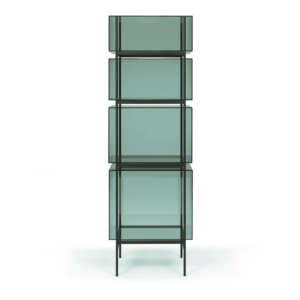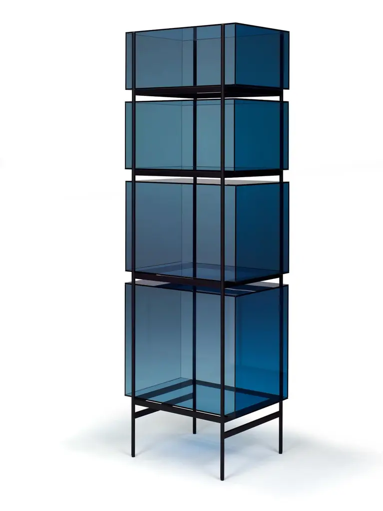 Lyn high blue black cabinet by PulpoDimensions: D60 x W45 x H185 cmMaterials: Glass; powder coated steel.Also available in different colours. Studio Visser & Meijwaard describe their conception of lyn as a “graphic interplay between glass and the metal frameworks”. The doorless and diverse series of cabinets and high boards are equivalent to the designers’ ambition to rethink established forms, like they did in their past as fashion designers. The reduction to the absolute essential form opens a free interplay of Material and colour. Depending on the lighting conditions, the viewer’s perspective and arrangement it casts the utmost of diverse highlights. Each piece is created from coloured glass.Pulpo is a design editor for high-end products in the home sector.Design is our passion. Art is our engine. We are fascinated by the Craft of the ceramic and glassblowing workshops and are guided by the rough aesthetics of these unique pieces.Pulpo’s philosophy goes back to the IDEA of the “carte blanche”. Our designers and artists develop their designs freely and experimentally. A variety of materials and a weakness for structures are our strengths.The headquarters of pulpo is in Weil am Rhein, near the Swiss border. Consisting of the creative and sales department, warehouse and logistics, this is the think tank for our artists and designers. pulpo’s dealer network extends far beyond Weil am Rhein – from Iceland and Dubai to Australia.Pulpo is movement – is possibility – is passion.In 2006, pulpo was founded by Ursula and Patrick L’hoste as a design brand at the interface between shape and Material. pulpo’s conception is to edit lighting, furniture and accessoires on editor’s choice. The company’s focus is to conduct up-and-coming designers and selected manufacturers, using the nature of Material’s to form the score. Materials such as ceramics, stone and especially glass, which is pulpo’s primary focus since 2013.