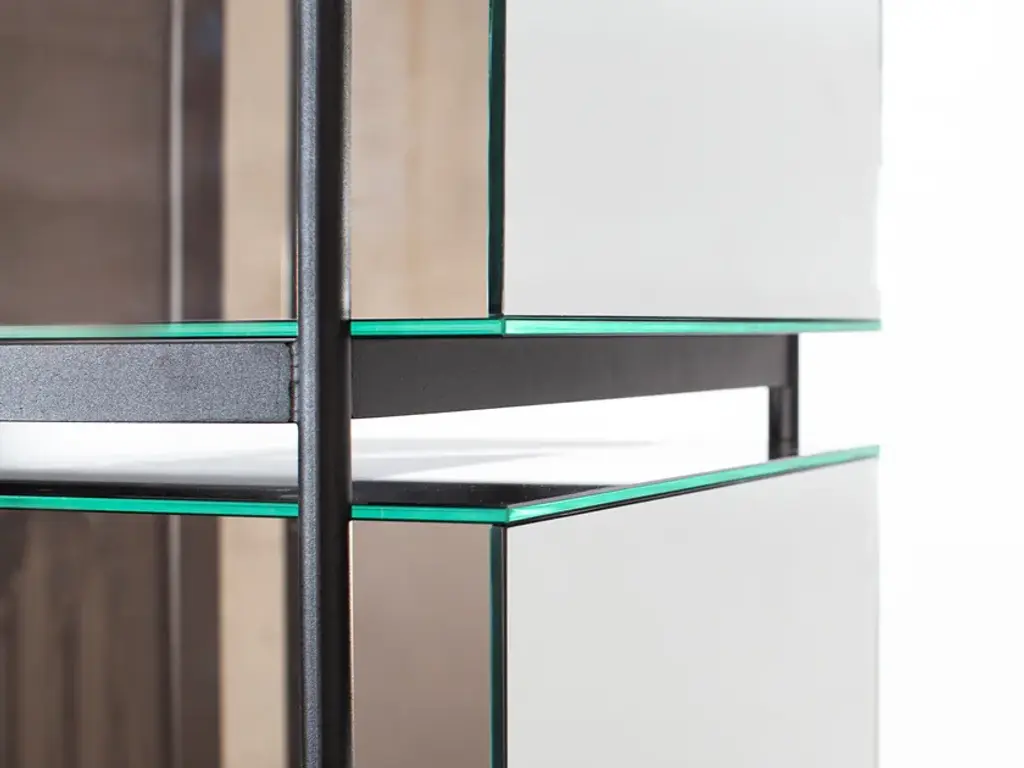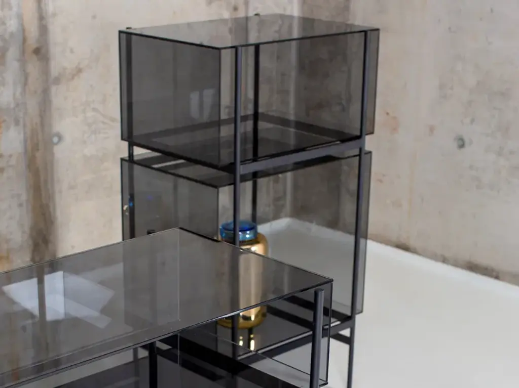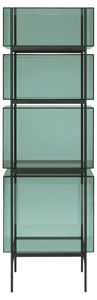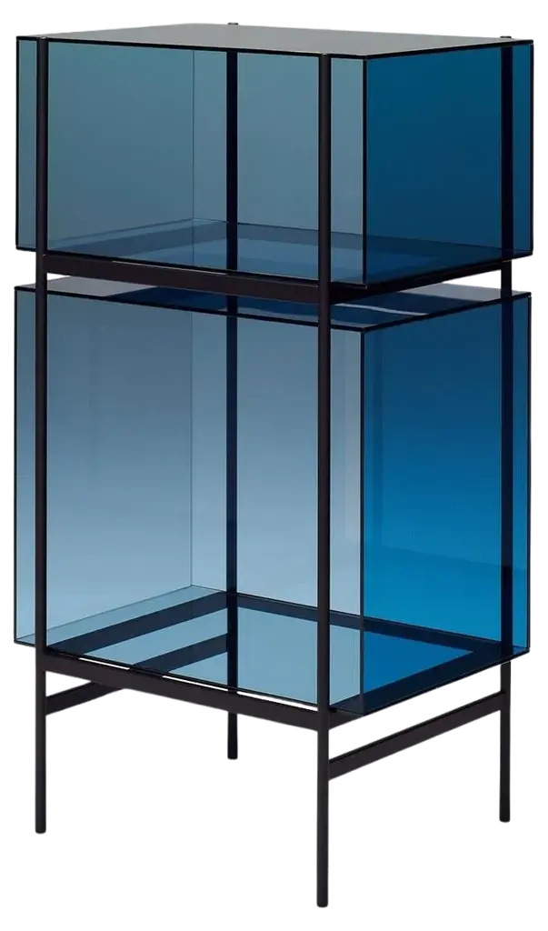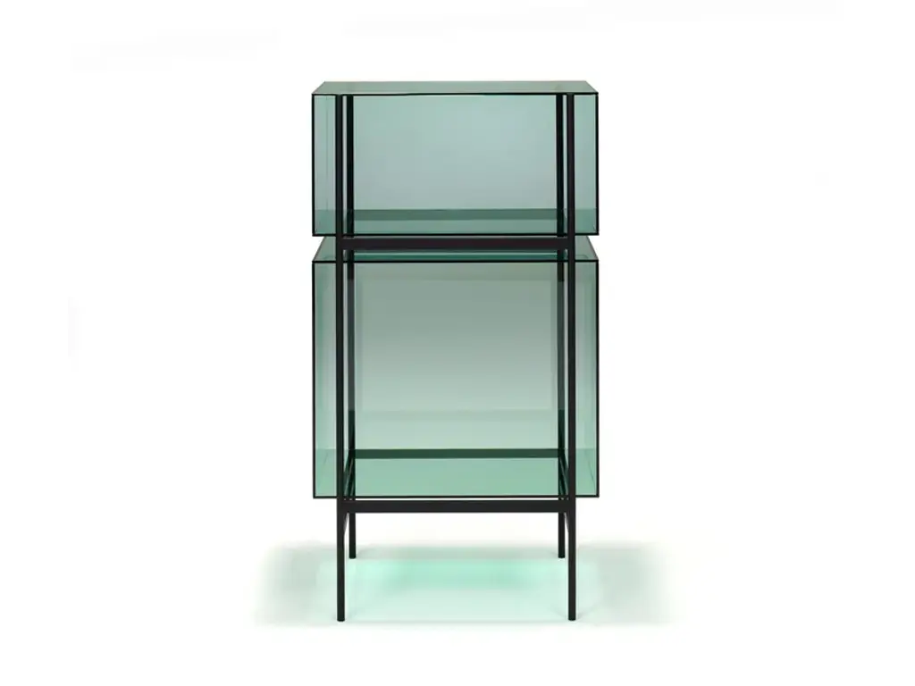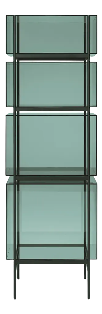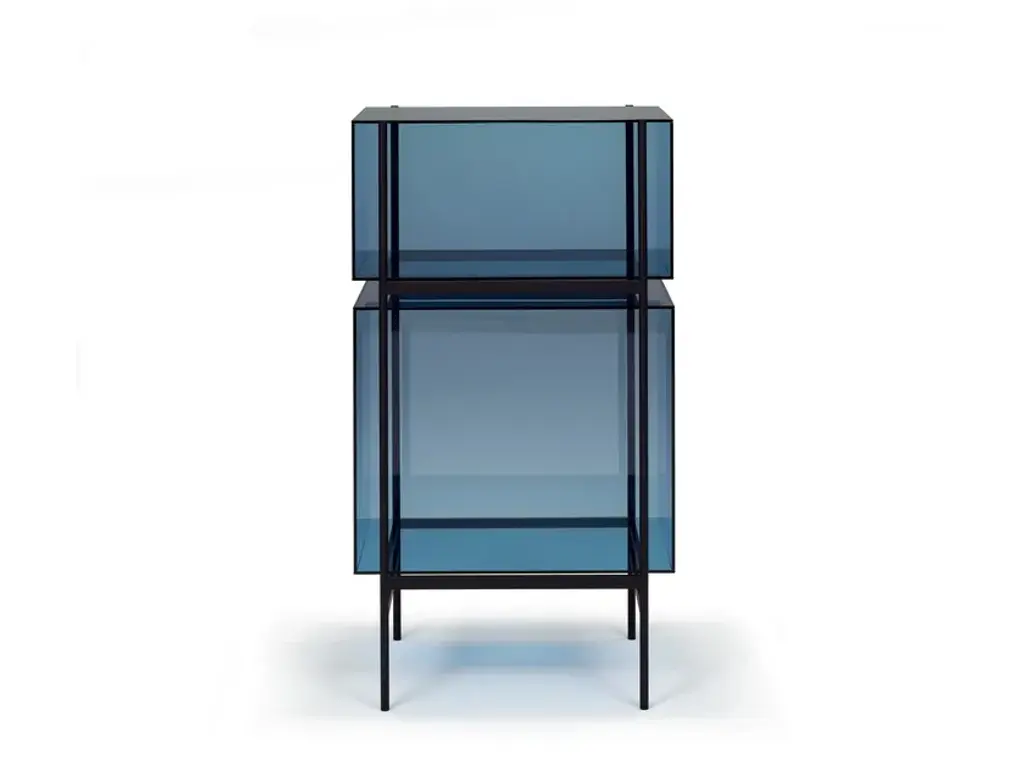 Studio Visser & Meijwaard describe their conception of lyn as a “graphic interplay between glass and the metal frameworks”. The doorless and diverse series of cabinets and high boards are equivalent to the designers’ ambition to rethink established forms, like they did in their past as fashion designers. The reduction to the absolute essential form opens a free interplay of material and color.Depending on the lighting conditions, the viewer’s perspective and arrangement it casts the utmost of diverse highlights. The cabinets are produced from float glass and powder-coated steel. Bubbles, streaks and other variations in size and color are part of the production process, and not defects of the design or production. The lyn series if made up of two sizes, small and high, and available in a range of color combinations.Material: handmade glass, steel (powder coated)Color: Blue/Black, Green/Black, Grey/Black, Mirror/Black