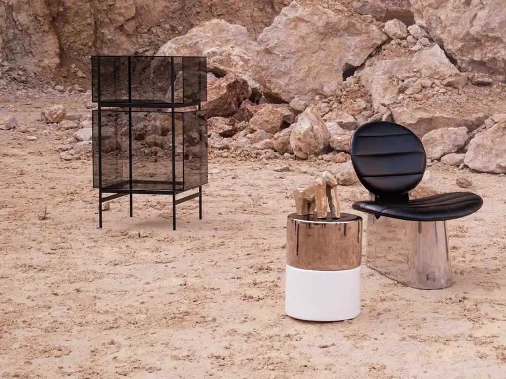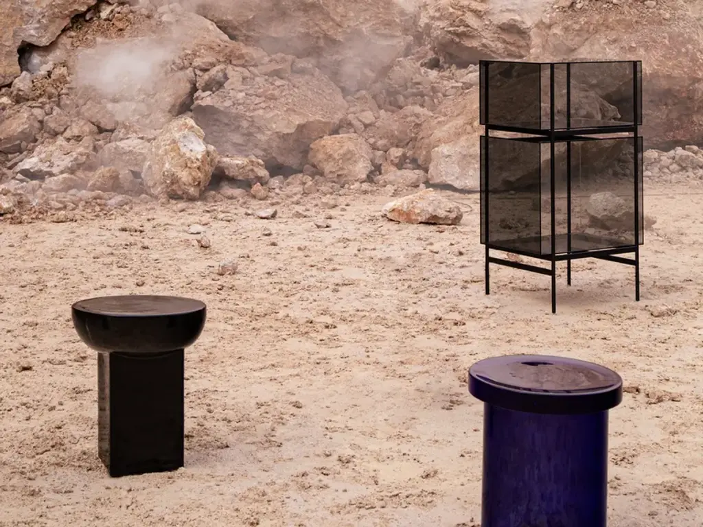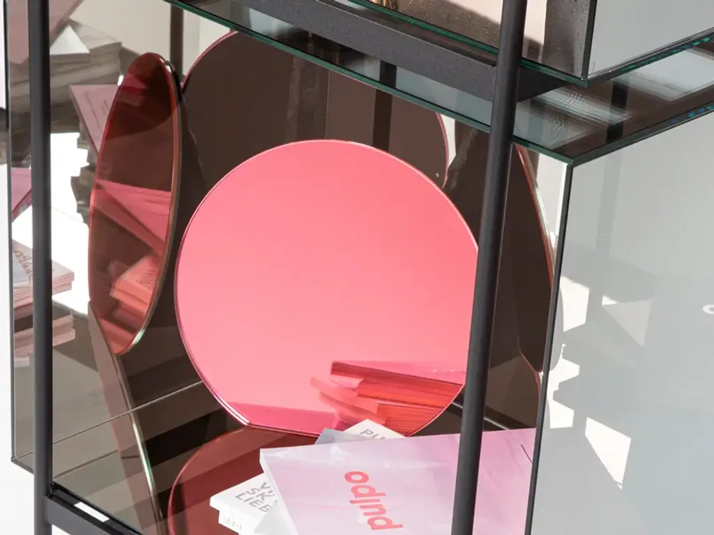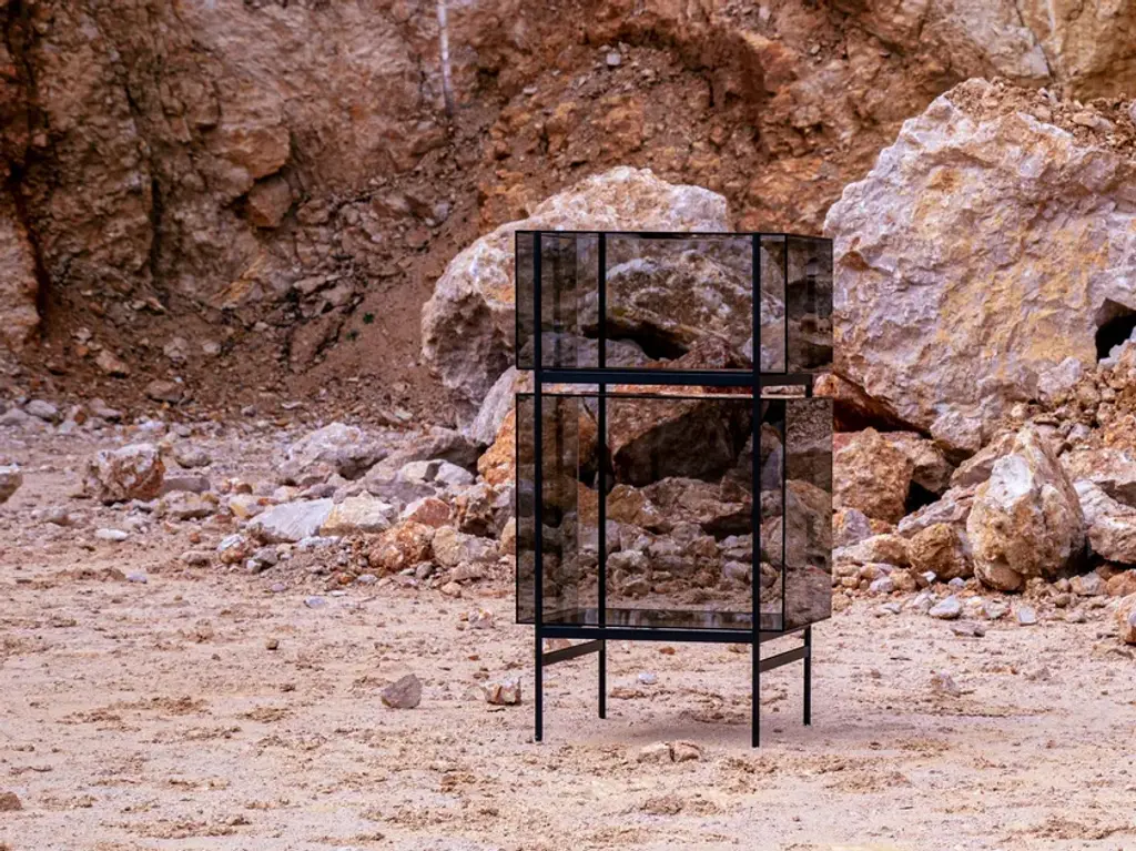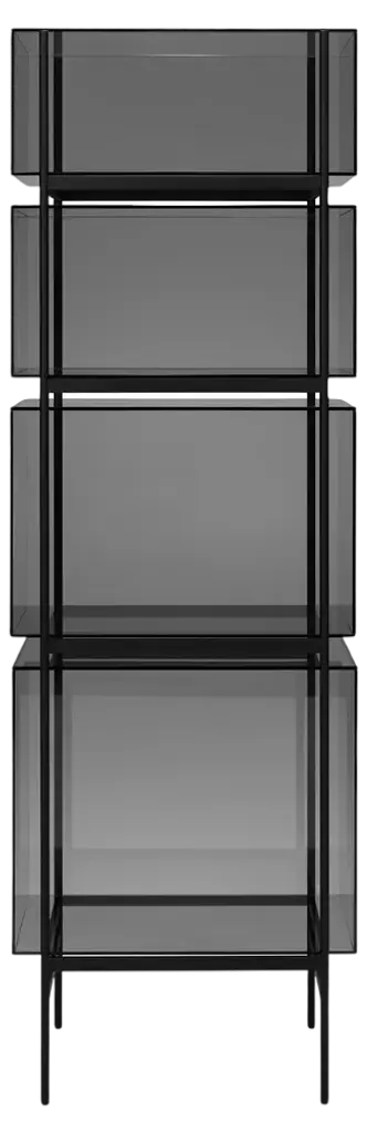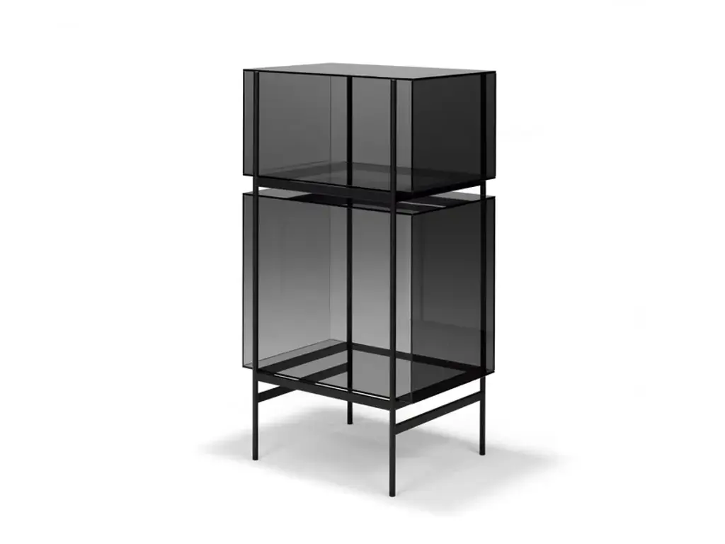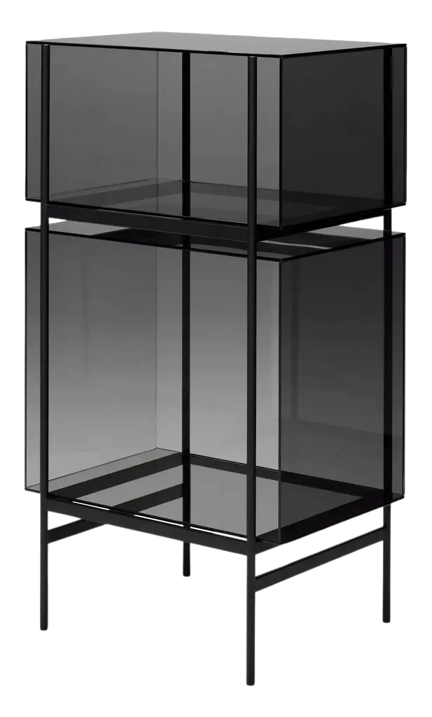 Studio Visser & Meijwaard describe their conception of lyn as a “graphic interplay between glass and the metal frameworks”. The doorless and diverse series of cabinets and high boards are equivalent to the designers’ ambition to rethink established forms, like they did in their past as fashion designers. The reduction to the absolute essential form opens a free interplay of material and color.Depending on the lighting conditions, the viewer’s perspective and arrangement it casts the utmost of diverse highlights. The cabinets are produced from float glass and powder-coated steel. Bubbles, streaks and other variations in size and color are part of the production process, and not defects of the design or production. The lyn series if made up of two sizes, small and high, and available in a range of color combinations.Material: handmade glass, steel (powder coated)Color: Blue/Black, Green/Black, Grey/Black, Mirror/Black