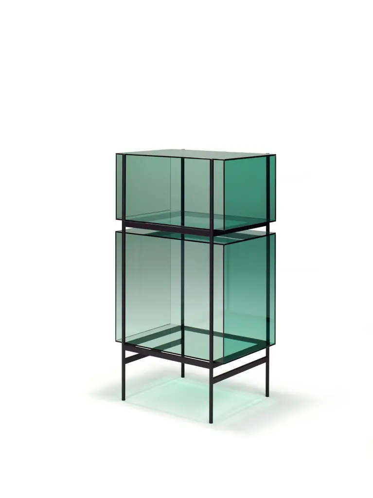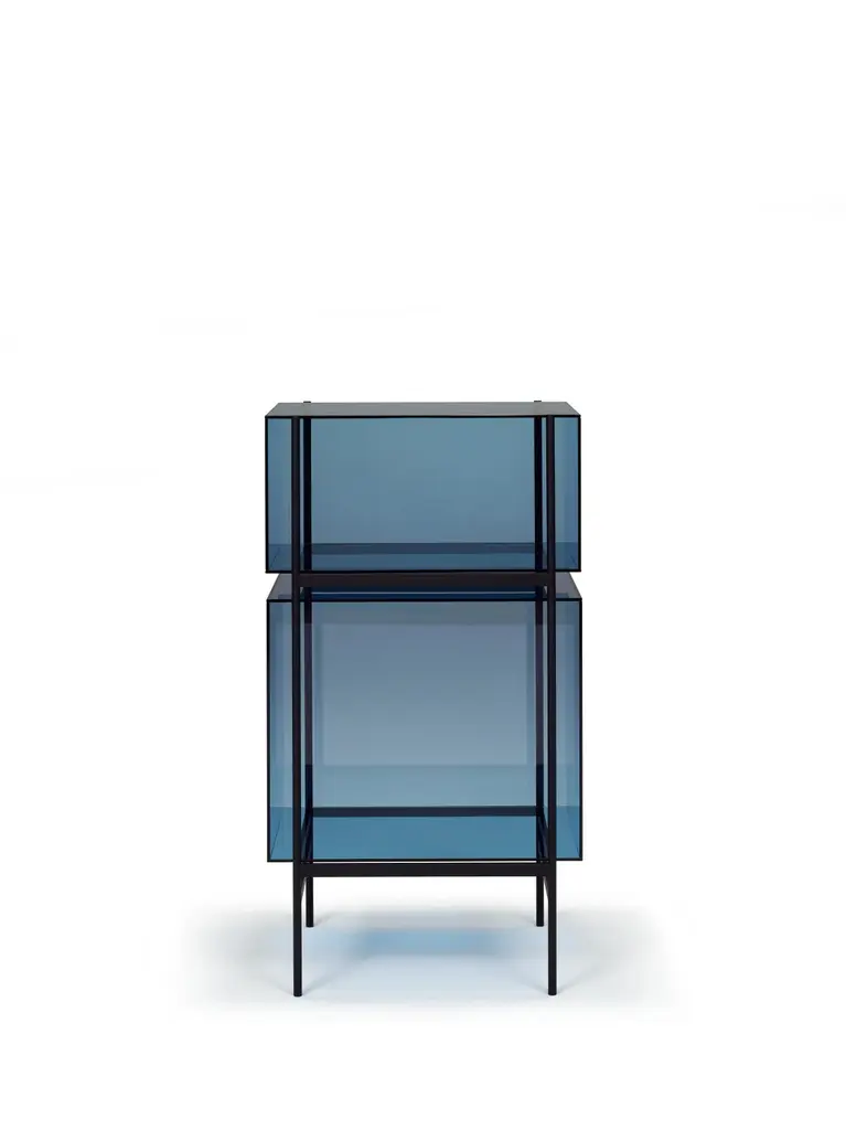 Lyn Small Grey Black Cabinet by PulpoDimensions: D60 x W45 x H110 cmMaterials: glass; powder coated steelAlso available in different colours.Studio Visser & Meijwaard describe their conception of lyn as a “graphic interplay between glass and the metal frameworks”. The doorless and diverse series of cabinets and high boards are equivalent to the designers’ ambition to rethink established forms, like they did in their past as fashion designers. The reduction to the absolute essential form opens a free interplay of material and colour. Depending on the lighting conditions, the viewer’s perspective and arrangement it casts the utmost of diverse highlights. Each piece is created from coloured glass.Pulpo is a design editor for high-end products in the home sector.Design is our passion. Art is our engine. We are fascinated by the craft of the ceramic and glassblowing workshops and are guided by the rough aesthetics of these unique pieces.Pulpo’s philosophy goes back to the idea of the “carte blanche”. Our designers and artists develop their designs freely and experimentally. A variety of materials and a weakness for structures are our strengths.The headquarters of pulpo is in Weil am Rhein, near the Swiss border. Consisting of the creative and sales department, warehouse and logistics, this is the think tank for our artists and designers. pulpo’s dealer network extends far beyond Weil am Rhein – from Iceland and Dubai to Australia.Pulpo is movement – is possibility – is passion.In 2006, pulpo was founded by Ursula and Patrick L’hoste as a design brand at the interface between shape and material. pulpo’s conception is to edit lighting, furniture and accessoires on editor’s choice. The company’s focus is to conduct up-and-coming designers and selected manufacturers, using the nature of material’s to form the score. Materials such as ceramics, stone and especially glass, which is pulpo’s primary focus since 2013.