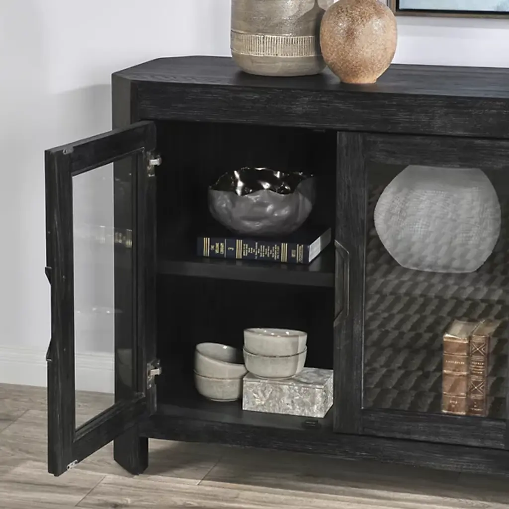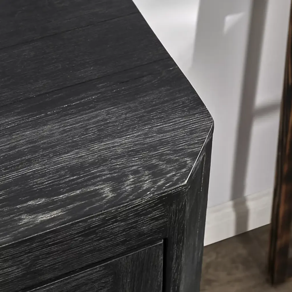 The Macarthur Cabinet from Classic Home stores precious items behind four tempered glass doors, making contents both protected and visible. Two adjustable shelves inside accommodate items of varying heights while maximizing storage potential. The reclaimed oak construction tells a story through its preserved grain patterns and authentic aged markings. Metal hardware in geometric shapes punctuates the facade, adding industrial notes to the natural wood. The cabinet's angled corners break away from traditional right angles, while the sustainably sourced materials support responsible forestry practices.