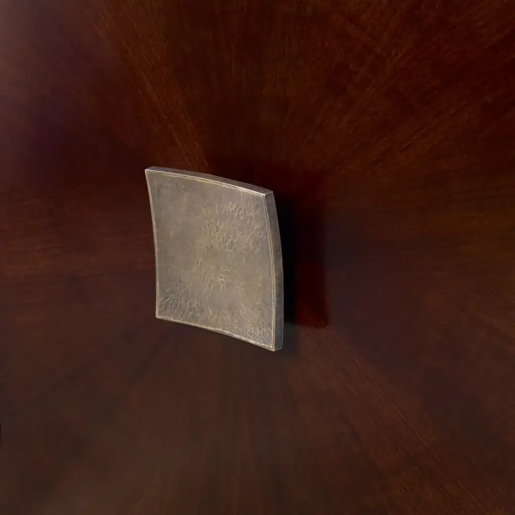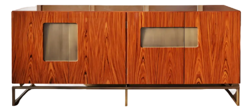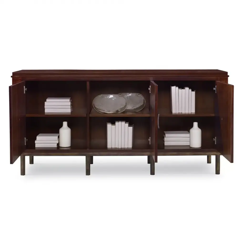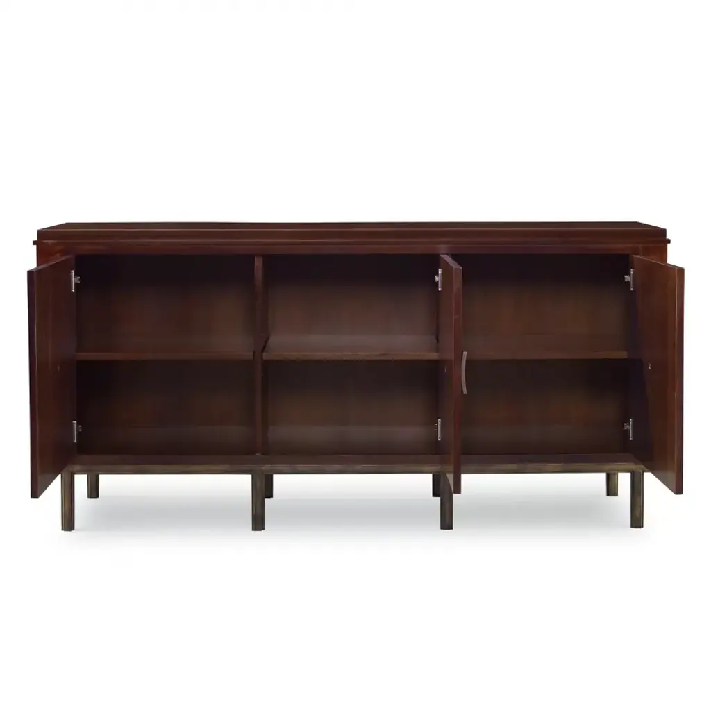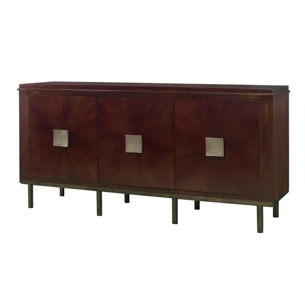 Crafted of Mahogany with Walnut veneer, this cabinet is raised on an iron base with a rich, aged bronze finish. Concave, square pulls are placed in the center of stunning starburst veneer doors. The three doors open to reveal adjustable shelves and grommets for easy electrical access. Adjustable glides are included.