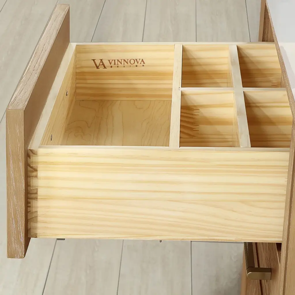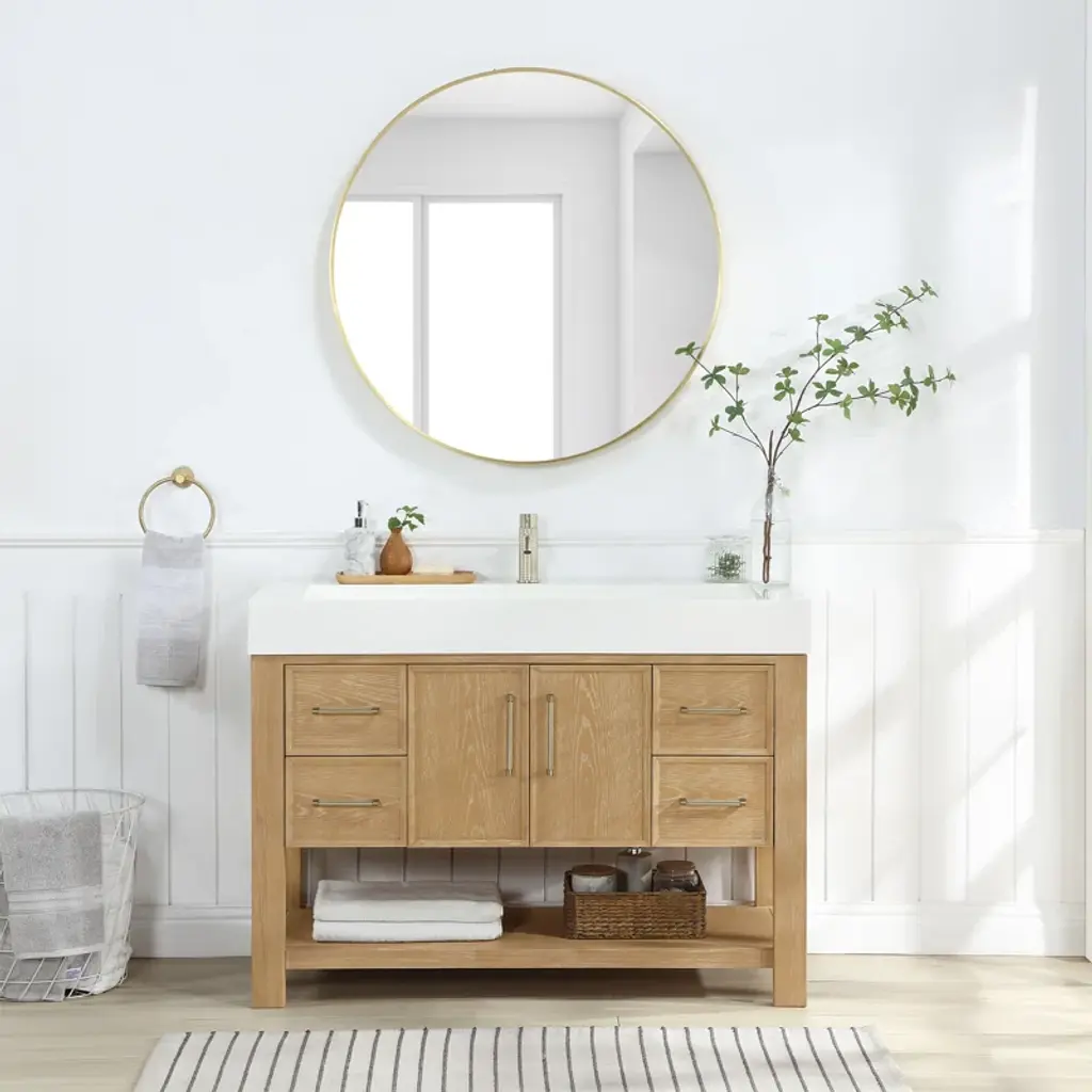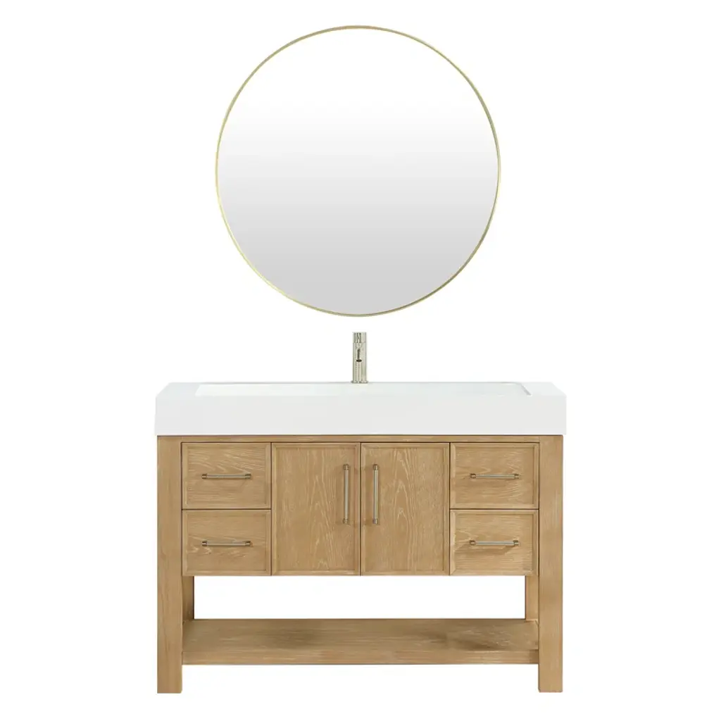 Constructed from premium solid wood with a warm, earthy finish, our Berenize series vanity is the perfect marriage of durability, style, and convenience. Its minimalist design, clean lines, and crisp white countertop give this piece a decidedly modern aesthetic, making it a chic addition to any master or guest bath. Storage abounds in this eco-friendly piece, featuring spacious drawers and cabinets and an open shelf below.