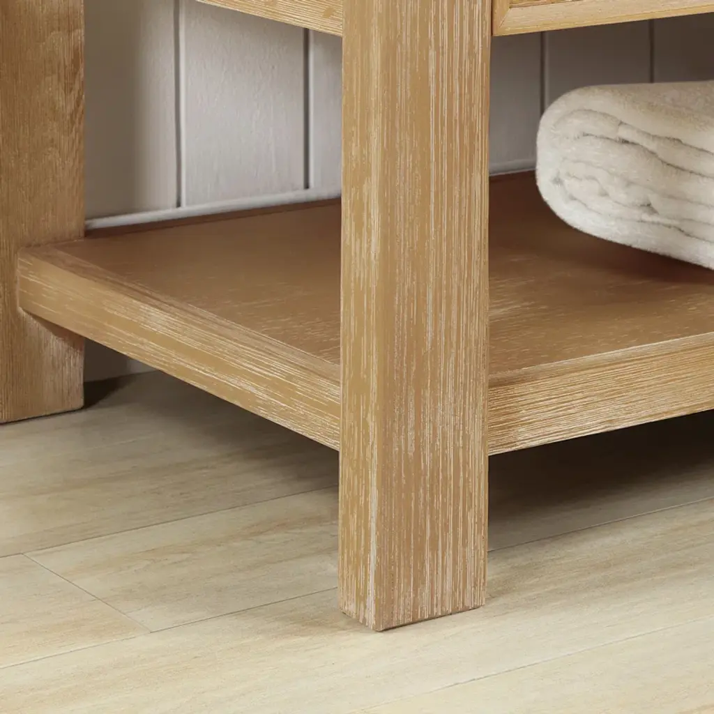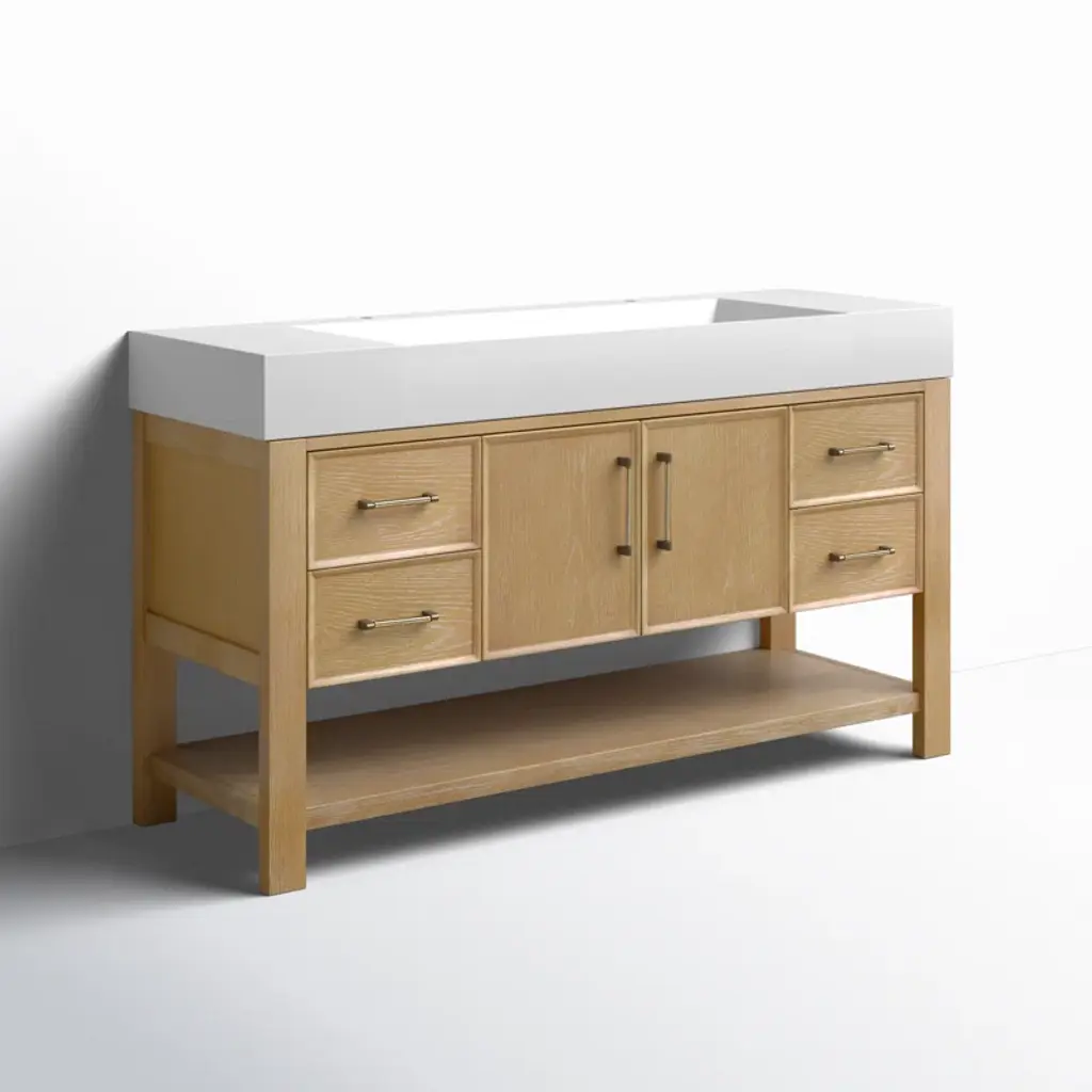 This freestanding bathroom vanity is a blend of modern aesthetics and practical storage, making it a must-have addition to your main or guest bath. Handmade from solid poplar wood, it features a washed ash gray finish that complements the crisp white engineered stone countertop. The integrated composite stone sink adds to its sleek look, while brushed gold-finished hardware adds an elegant contrast. With four soft-close drawers, a cabinet, and an open shelf below, this vanity offers ample storage for your bathroom essentials. Please note that the faucet and mirror are not included.