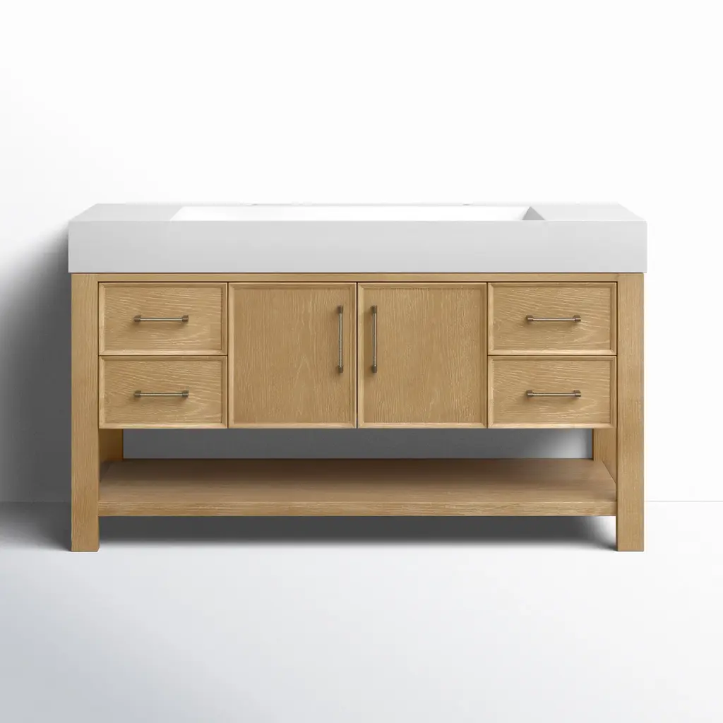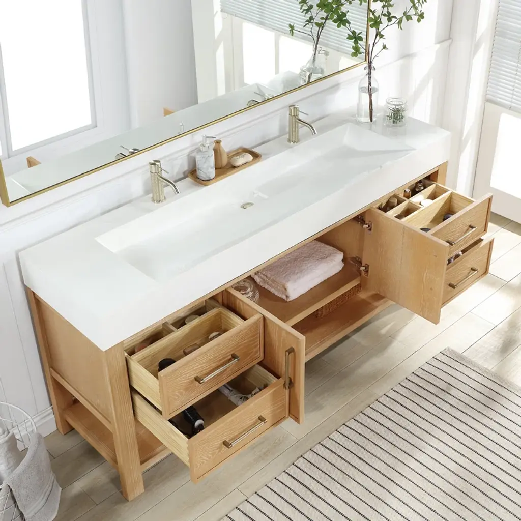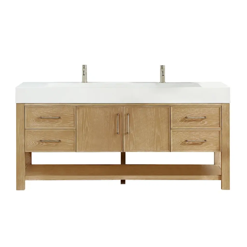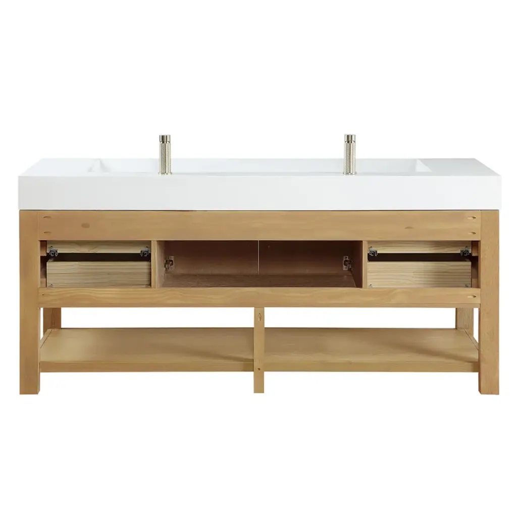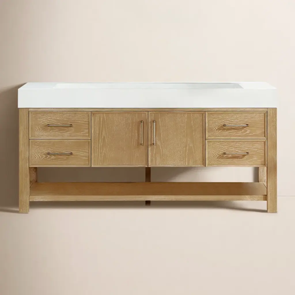 Constructed from premium solid wood with a warm, earthy finish, our Berenize series vanity is the perfect marriage of durability, style, and convenience. Its minimalist design, clean lines, and crisp white countertop give this piece a decidedly modern aesthetic, making it a chic addition to any master or guest bath. Storage abounds in this eco-friendly piece, featuring spacious drawers and cabinets and an open shelf below.