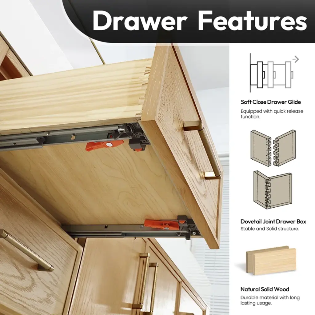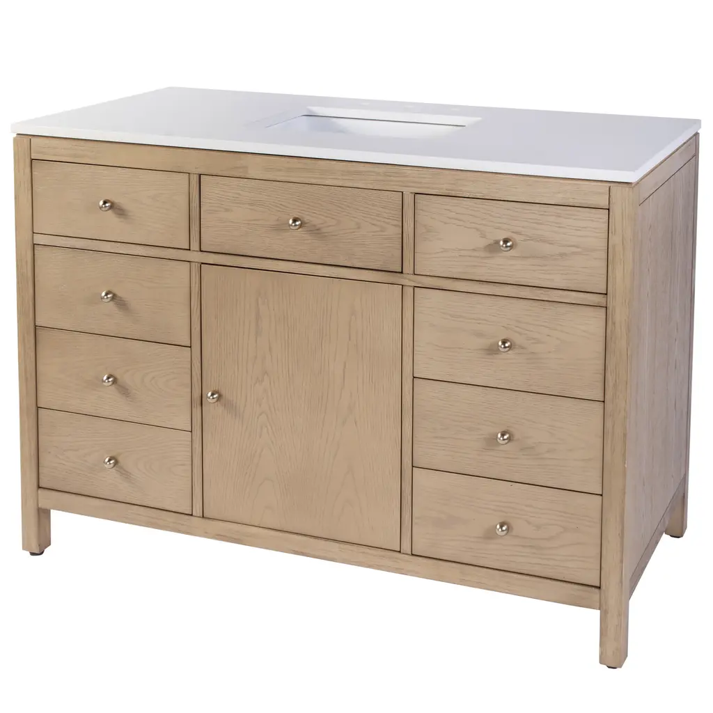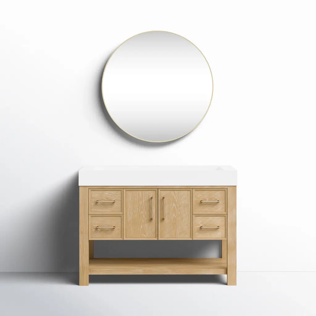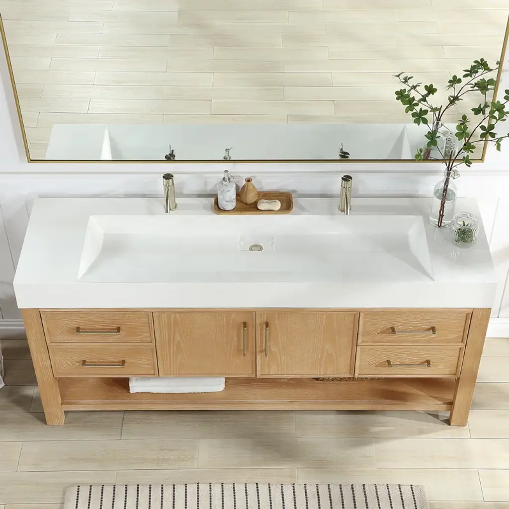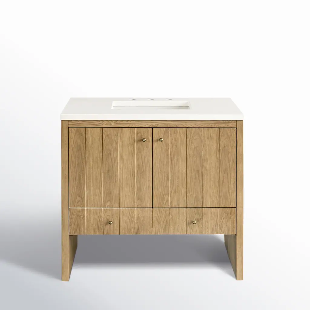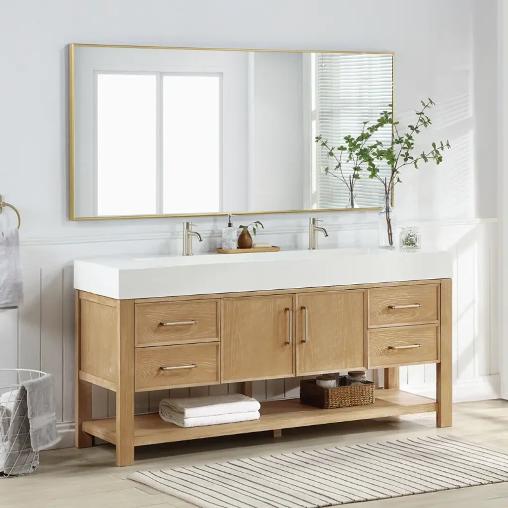 Constructed from premium solid wood with a warm, earthy finish, our Berenize series vanity is the perfect marriage of durability, style, and convenience. Its minimalist design, clean lines, and crisp white countertop give this piece a decidedly modern aesthetic, making it a chic addition to any master or guest bath. Storage abounds in this eco-friendly piece, featuring spacious drawers and cabinets and an open shelf below.