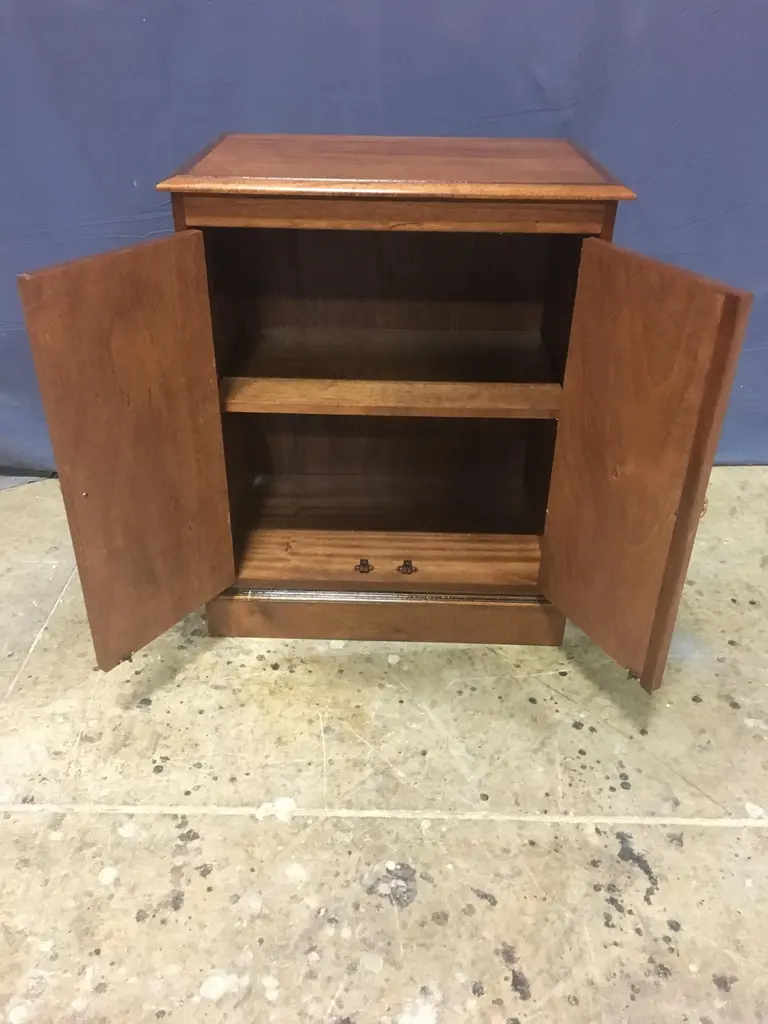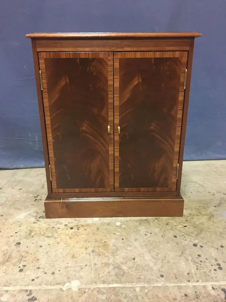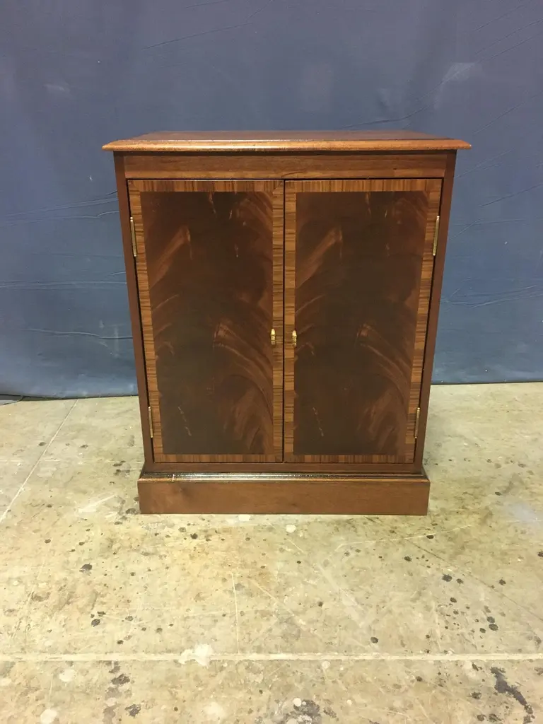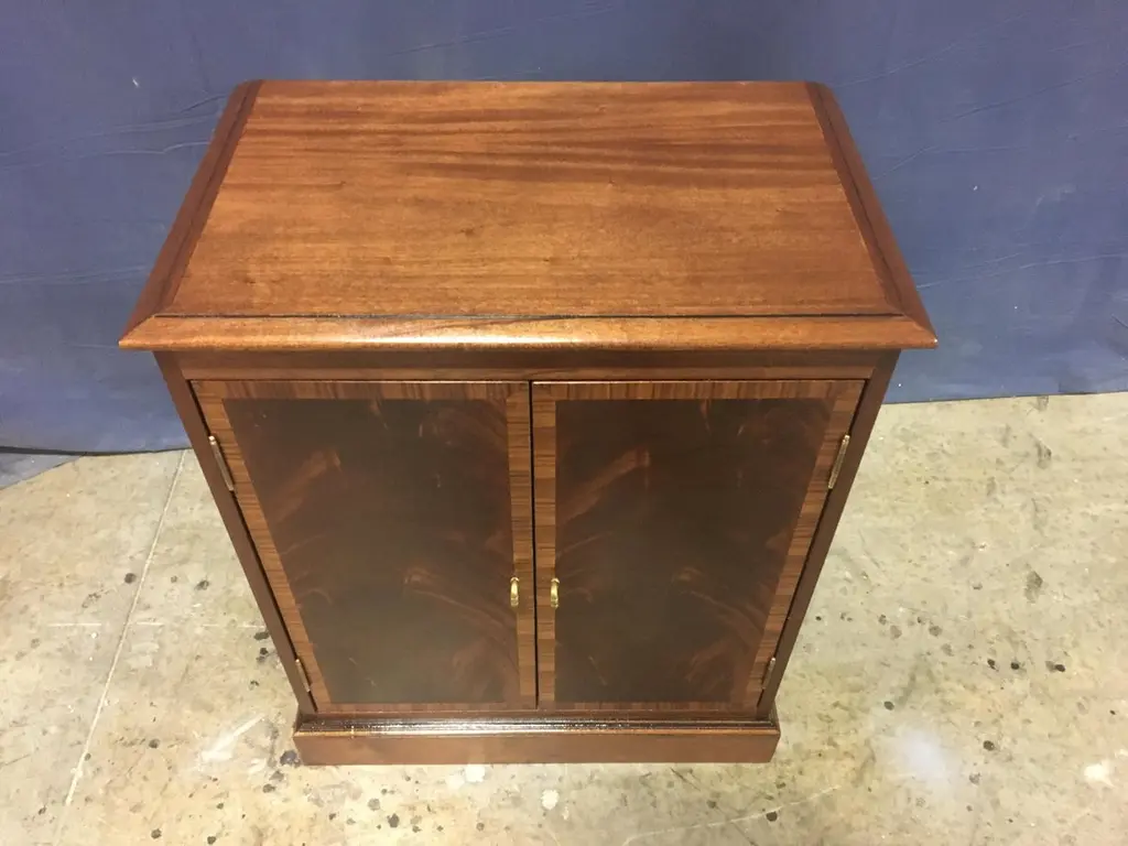 This is made-to-order traditional mahogany two-door cabinet made in the Leighton Hall shop. It is ideal to be used as a small buffet, hall cabinet/credenza or foyer cabinet. It features two doors with swirly crotch mahogany fields and a Pau Ferro border. It has a cathedral mahogany top with a traditional ogee profile edge. It has a semi gloss finish and one adjustable shelf.Dimensions: Width: 28 in., depth 21.5 in., height 34 in.This piece can be purchased as shown or we can make a custom piece in our shop to your size and specifications. Optional features include: width, depth, height, door inlay design, door locks, hardware and finish.