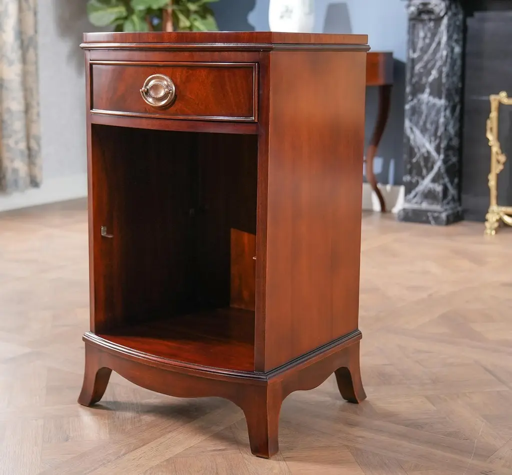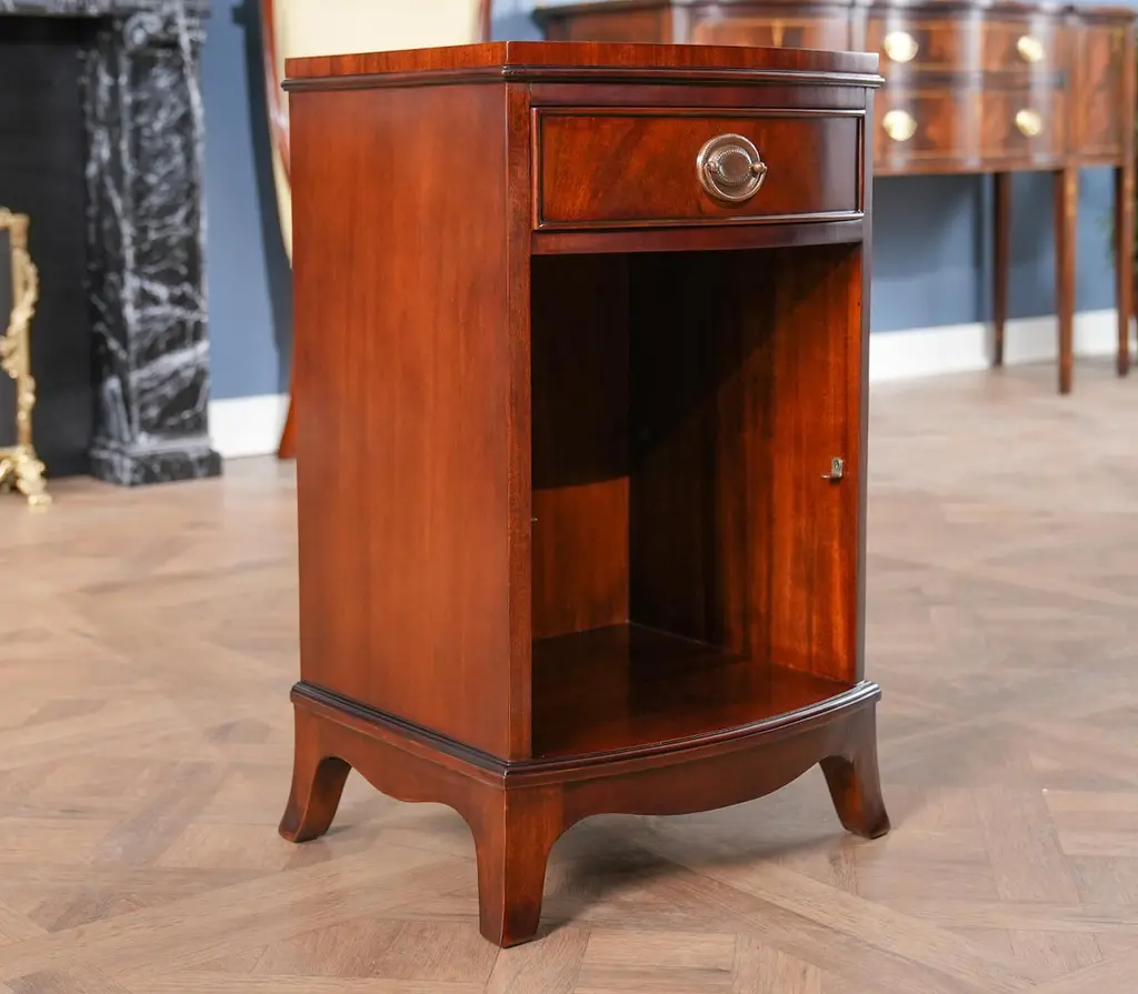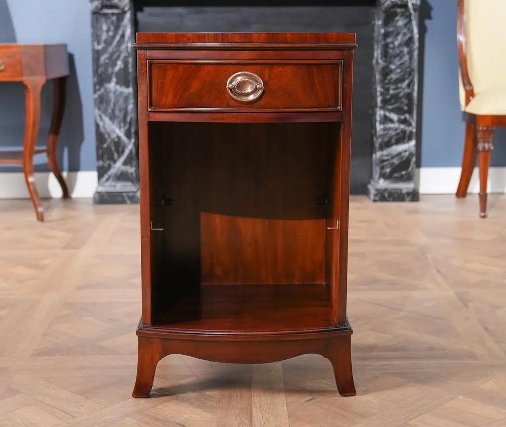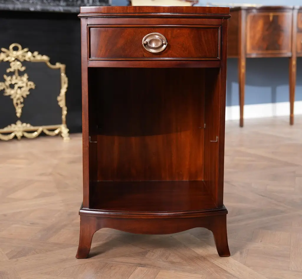 A fine quality Mahogany One Drawer Nightstand featuring hand shaped, solid mahogany details as well as dovetailed drawers. The bowed front creates a beautiful shape, and the single drawers create, and shelf creates a lot of practical storage in a small footprint. The Mahogany One Drawer Nightstand drawer fronts are also accented by antique style, solid brass hardware. Taller than many nightstands this item is also well suited for use as an end table, an entry way piece, an office cabinet.Measures 17″w x 15″d x 29″h
