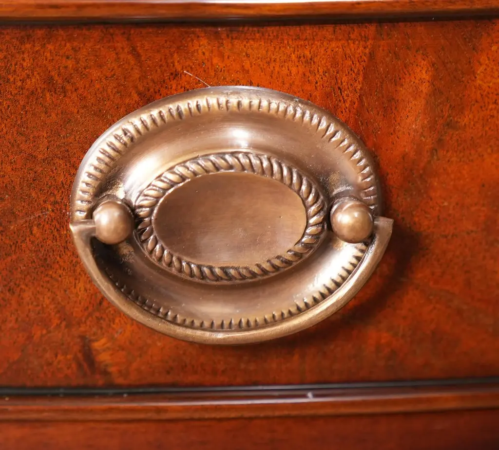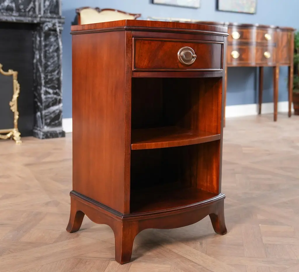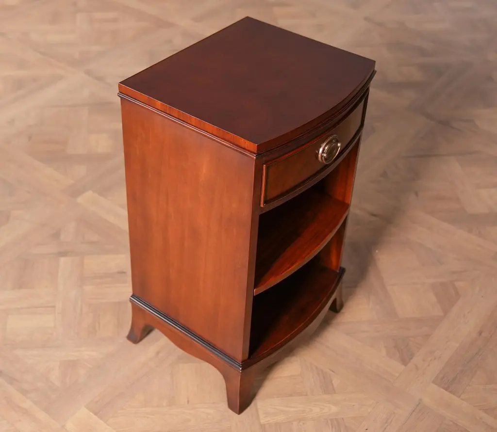 A fine quality Mahogany One Drawer Nightstand featuring hand shaped, solid mahogany details as well as dovetailed drawers. The bowed front creates a beautiful shape, and the single drawers create, and shelf creates a lot of practical storage in a small footprint. The Mahogany One Drawer Nightstand drawer fronts are also accented by antique style, solid brass hardware. Taller than many nightstands this item is also well suited for use as an end table, an entry way piece, an office cabinet.Measures 17″w x 15″d x 29″h