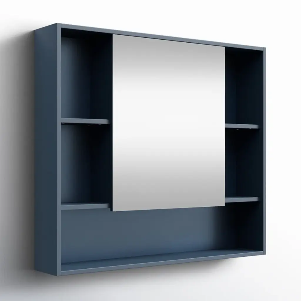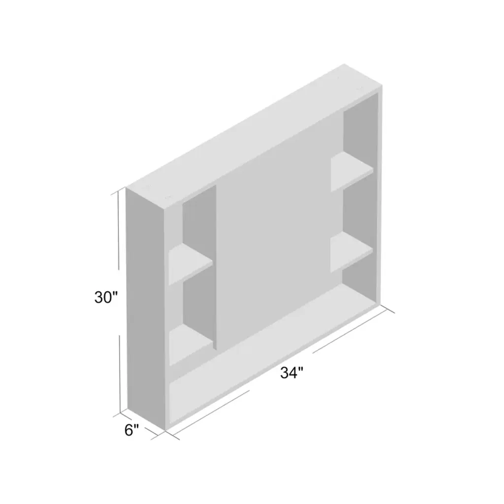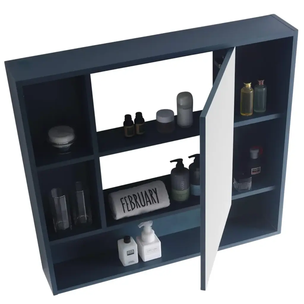 Shelf-presentation. This medicine cabinet’s satisfying geometric design brings a streamlined look to your bathroom. Compartmentalized shelving keeps self-care supplies organized and in easy reach, while additional storage space behind its mirror conceals more personal items.