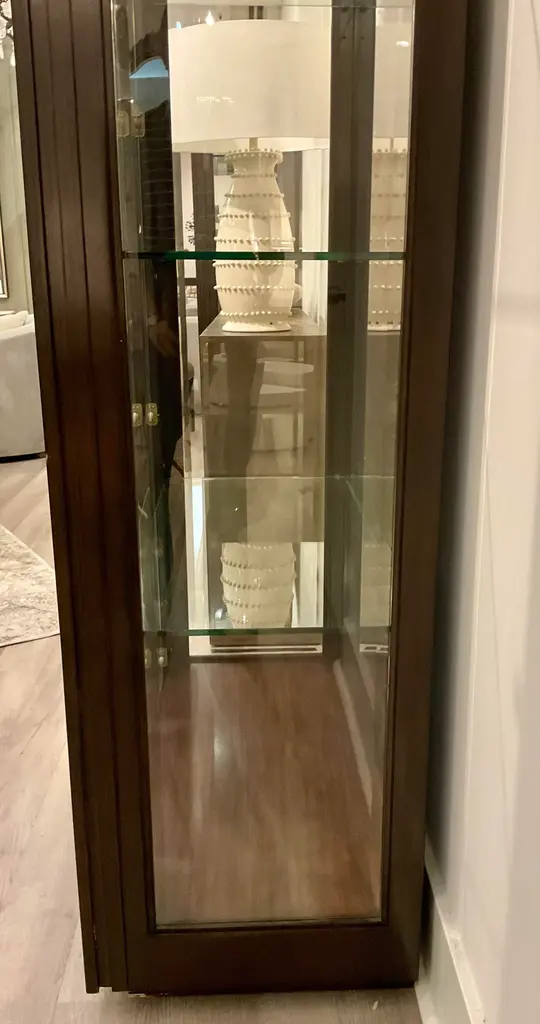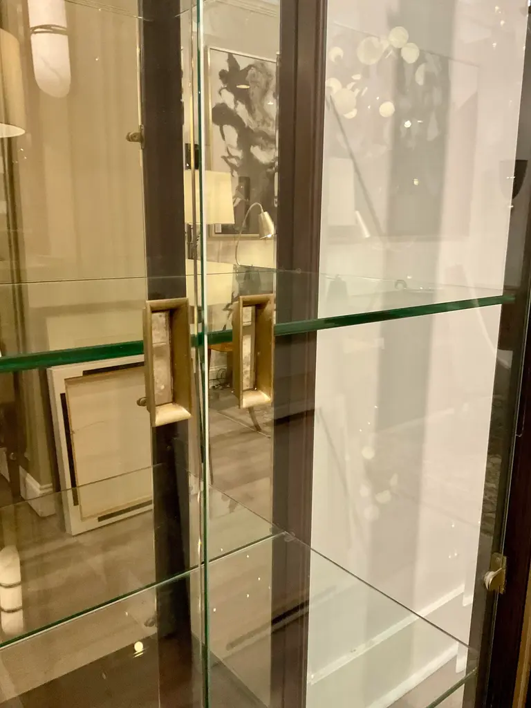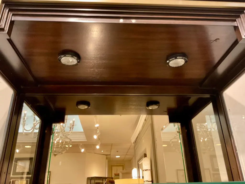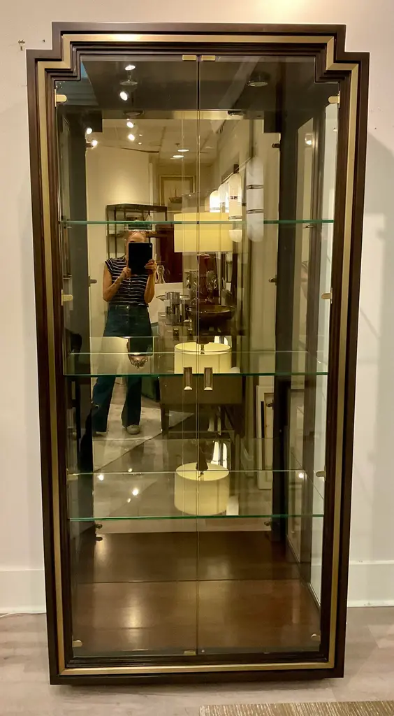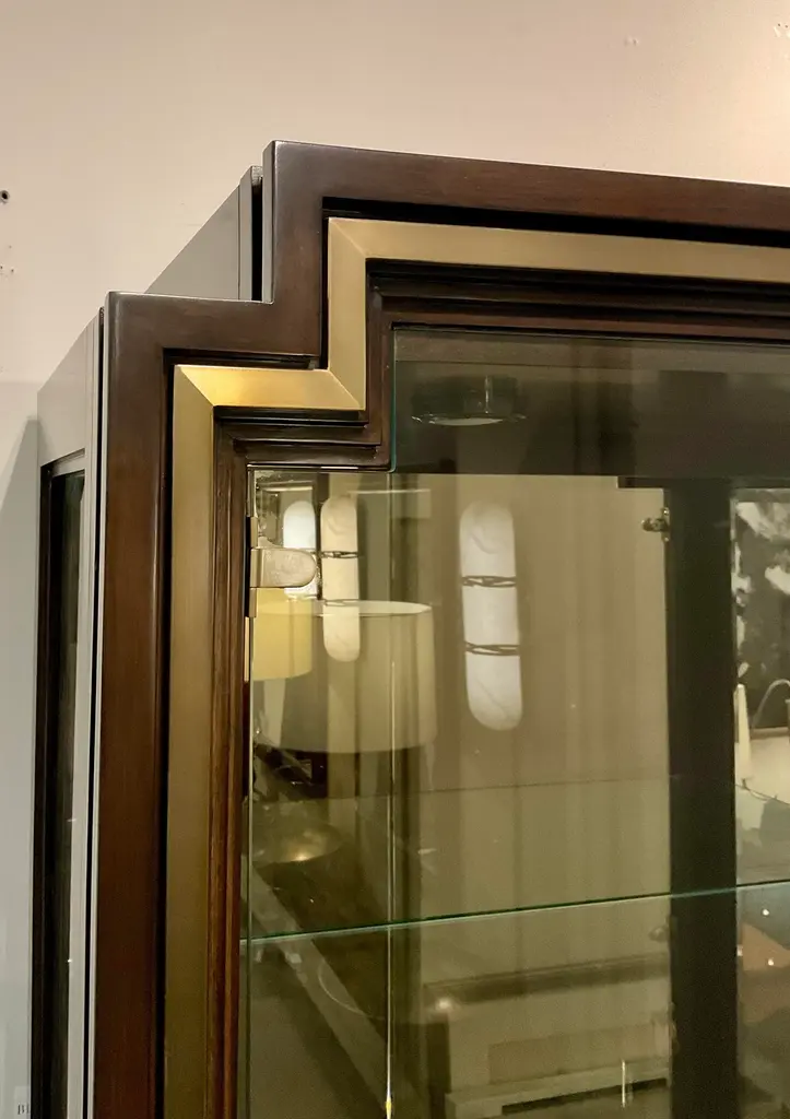 Original retail $10,497, stylish Maitland-Smith Modern Lyric Display Cabinet, dark oak wood frame, satin brass trim, toe glass doors, three adjustable glass shelves, bronze mirror paneled back, two three way LED lights, showroom floor sample