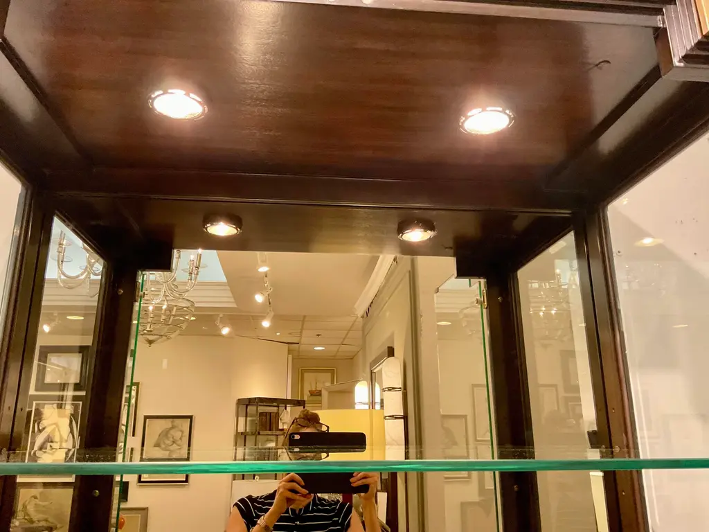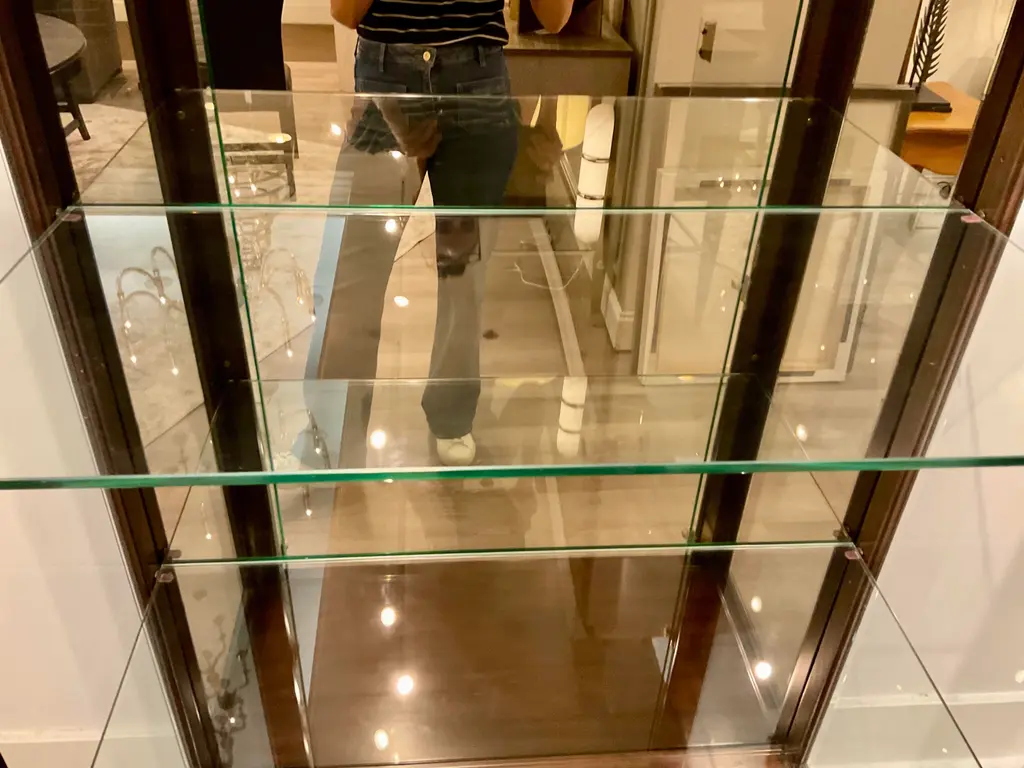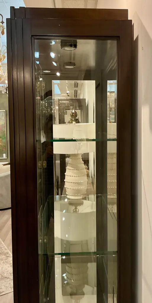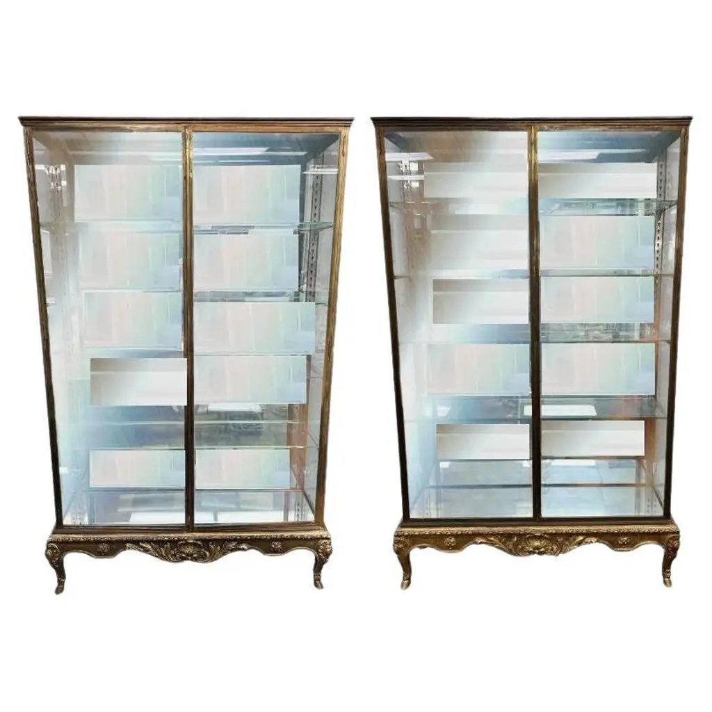 Original retail $10,497, stylish Maitland-Smith Modern Lyric Display Cabinet, dark oak wood frame, satin brass trim, toe glass doors, three adjustable glass shelves, bronze mirror paneled back, two three way LED lights, showroom floor sample