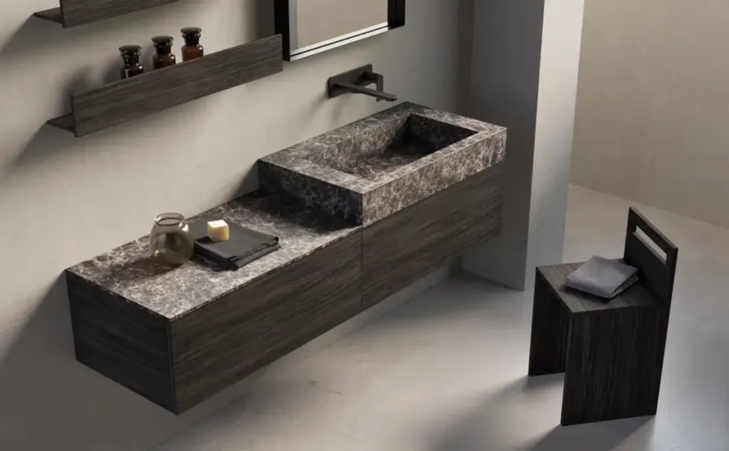 MAKE 27 is a bathroom composition which includes:- MKI095 washbasin top with push-pull drawer- MK113 base with push-pull drawer- HFX06+HFX23 HPL Oriental washbasin with hidden drain - HFX01 HPL Oriental top- MCF6 Melamine-faced chipboard shelf with Olmo Lava finish- LNS1 mirror with black metal frame and LED lighting