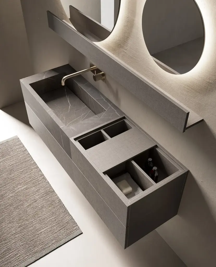 MAKE 28 is a bathroom composition which includes:- MK007A washbasin top with push-pull drawer- MK1537base with drawer + open unit and cover- HFX08 Alabastro Grey HPL washbasin- RRX191 round mirror with perimeter LED with sensor- RRX190 round mirror with perimeter LED- MKM4 Melamine-faced chipboard self with grey fabric effect