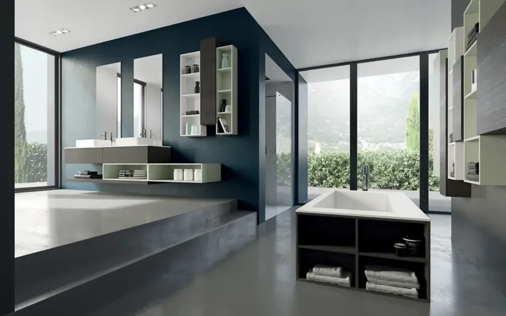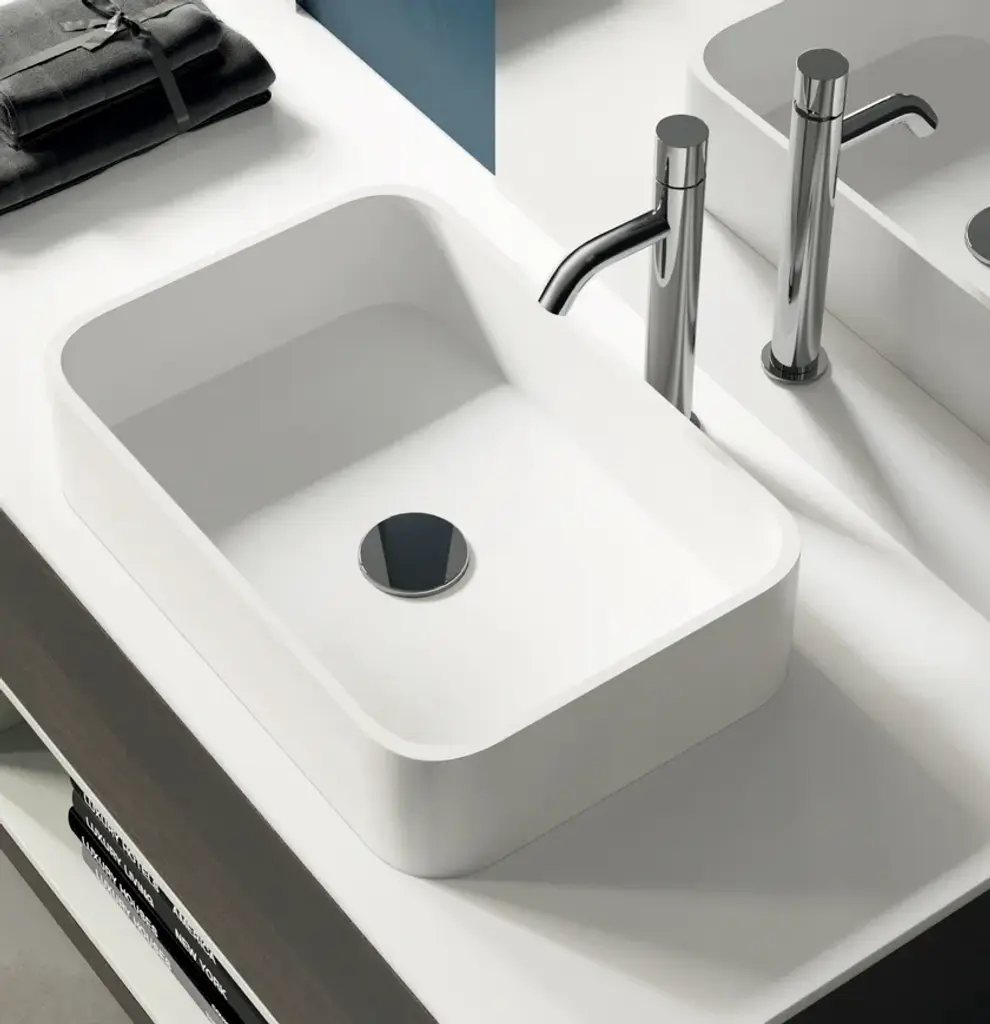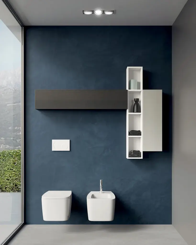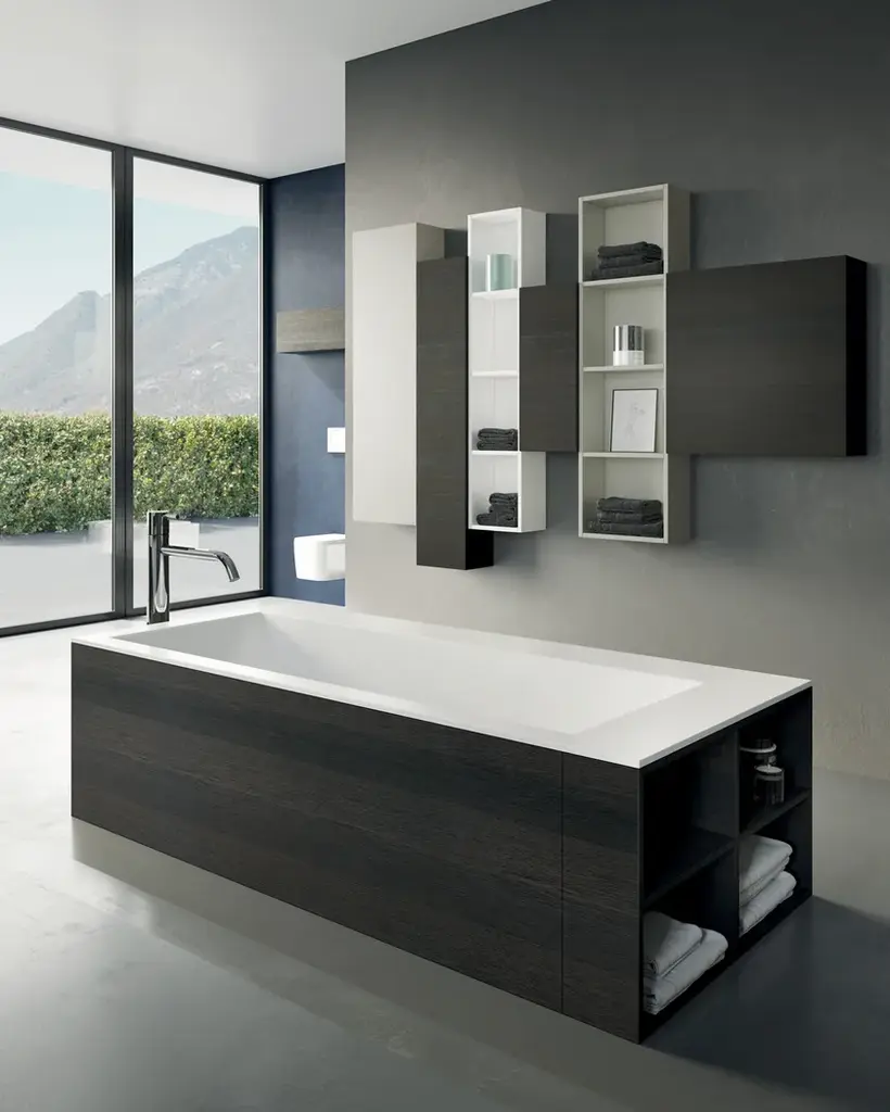 MAKE B 04 is a bathroom composition which includes:RRX18 edge mirror - 50 x 2 x H 150 cmMinima - Washbasin in Tecnoril - 58 x 37 x H 16 cmMK010 1-drawer washbasin stand - 90 x 40 x H 25 cmT069 top Tecnoril - 180 x 40 x H 1,2 cmMK932 matt lacquered open element - 90 x 40 x H 25TX033 top / straight shelf - 180 x 40 x H 6 cmP102 wall unit with 1 door PG017 open wall unit - 25 x 18 x H 90 cmPG017 open wall unit - 35 x 18 x H 90 cmFinish: slate oak - matt white lacquer. Tecnoril topMake is a furnishing revolution, a completely modular system that meets all your functional, dimensional and material requirements and needs.Make is easy to imagine, compose and install. Make is a chameleonic project which changes to suit different needs and environments, with an almost endless range of compositional possibilities, introducing dimensions that meet the demands of today’s living space. Make is constructive freedom, allowing the generation of unconventional forms and aggregations, simply and immediately.Make goes beyond the bathroom, being a programme that meets the needs of every area of the home, from the living room to the wardrobe, from the storage cupboard to the laundry.Make comes in a wide range of materials: wood, surfaced chipboard, lacquered elements, glass, concrete, Teknos, Tecnoril, stone, quartz resin and ceramics, which can be matched in the compositions to create new and appealing arrangements.Make is clean cut and exclusive detail, technical innovation and freedom of expression. Make is the evolution of the “furnishing system”, versatile and tailored to suit individual requirements, capable of making every customer’s dreams come true, without forgetting its original philosophy