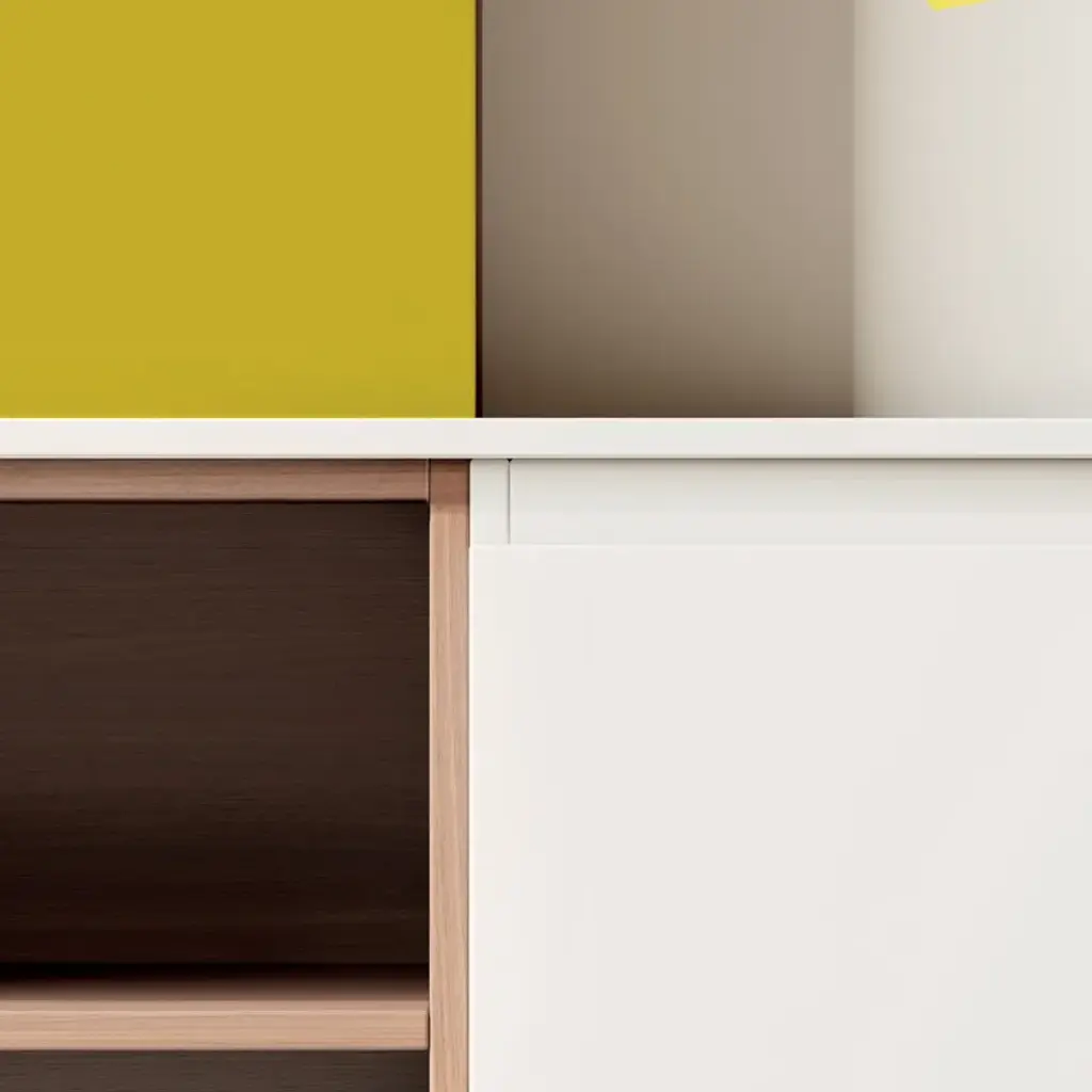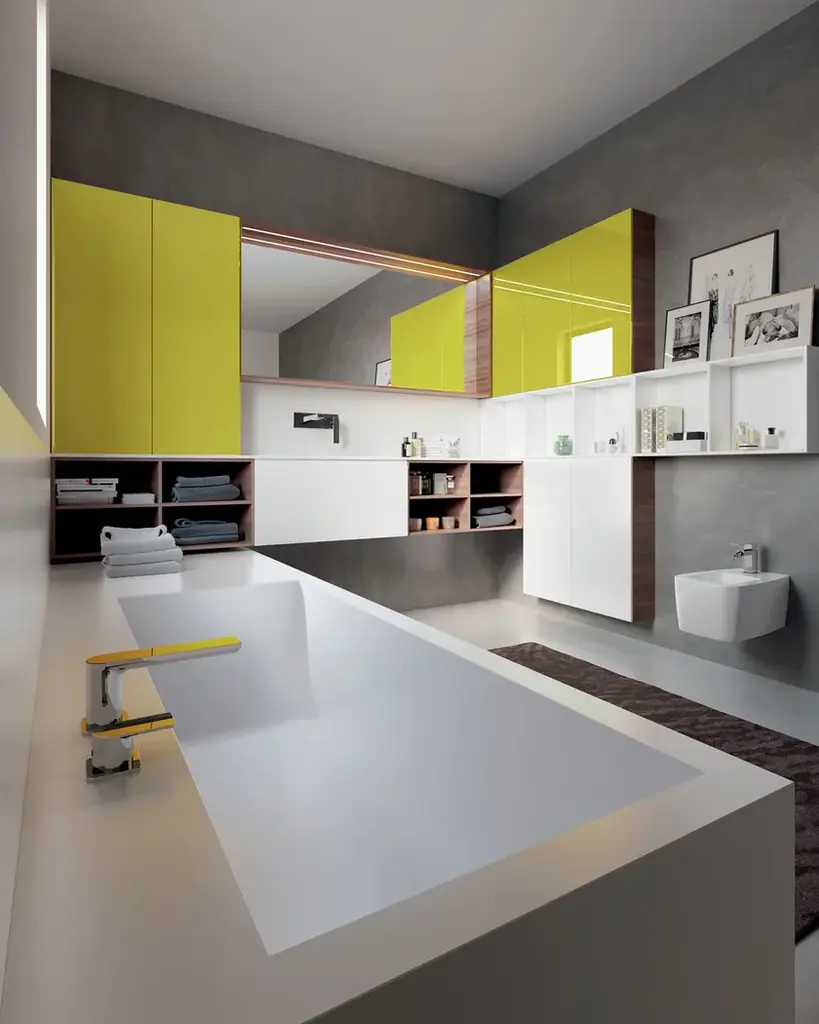 MAKE B 08 is a bathroom composition that includes:MK1070 melamine open element - 80 x 46 x H 40 cmMK095 washbasin base 1 drawer - 80 x 46 x H 40 cmC040 column with 2 doors - 80 x 20 x H 120 cmRRX316 mirror with melamine frame - 160 x 13 x H 75 cmTX123 Tecnoril top - 240 x 51 x H 1,2 cmPG035 3-compartment open wall unit - 120 x 18 x H 40 cmPG034A open wall unit 2 compartments - 80 x 18 x H 40 cmP094 + P088 wall unit with 2 doors + 1 glossy door - 80/40 x 20 x H 75 cmP094 wall unit 2 lacquered doors matt - 80 x 20 x H 75 cmTecnoril bathtub - 170 x 70 x H 50 cmFinish: saffron / matt white glossy lacquered - Siena elm melamine. Tecnoril top.Make is a furnishing revolution, a completely modular system that meets all your functional, dimensional and material requirements and needs.Make is easy to imagine, compose and install. Make is a chameleonic project which changes to suit different needs and environments, with an almost endless range of compositional possibilities, introducing dimensions that meet the demands of today’s living space. Make is constructive freedom, allowing the generation of unconventional forms and aggregations, simply and immediately.Make goes beyond the bathroom, being a programme that meets the needs of every area of the home, from the living room to the wardrobe, from the storage cupboard to the laundry.Make comes in a wide range of materials: wood, surfaced chipboard, lacquered elements, glass, concrete, Teknos, Tecnoril, stone, quartz resin and ceramics, which can be matched in the compositions to create new and appealing arrangements.Make is clean cut and exclusive detail, technical innovation and freedom of expression. Make is the evolution of the “furnishing system”, versatile and tailored to suit individual requirements, capable of making every customer’s dreams come true, without forgetting its original philosophy