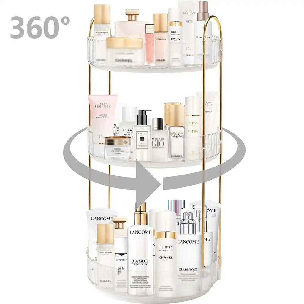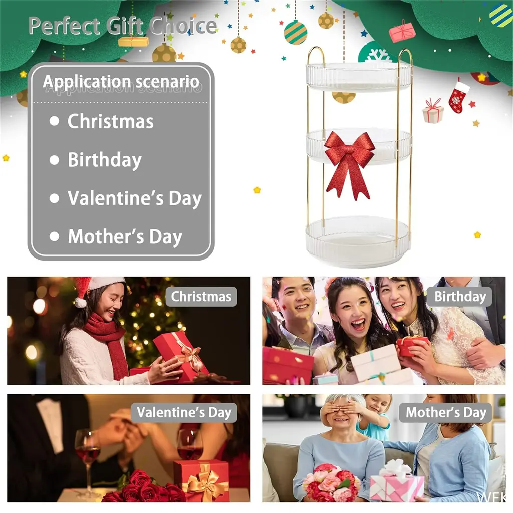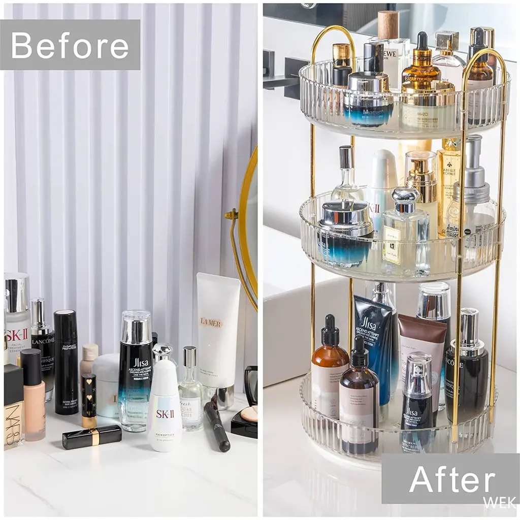 Design 360 rotation: 360-degree easy rotation can bring you a more convenient experience, the rotating base is smooth, and the edge of the tray is high enough to prevent the cosmetics from falling when rotating the cosmetics, suitable for all your cosmetics3-layer large capacity: This makeup storage box can be placed according to your own preferences, and can be used to store perfume, nail polish, lipstick, foundation blush, eye shadow, base makeup, makeup powder and nail tools, as well as toiletries such as facial cleanser, kitchen supplies such as spice racks, which can meet your daily needs and save you 80% of spaceSturdy material: The shelves on both sides of the cosmetics display cabinet are gold steel, and the two trays are aurora gradient purple high-quality ABS. The combination of white and gold is beautiful and durable, and can withstand the trampling of adults (experimentally tested, please rest assured to use)Easy to assemble: The Lazy Susan storage box is very simple and convenient to assemble, and it can be assembled in less than 1 minute. You can also disassemble each part for cleaning.