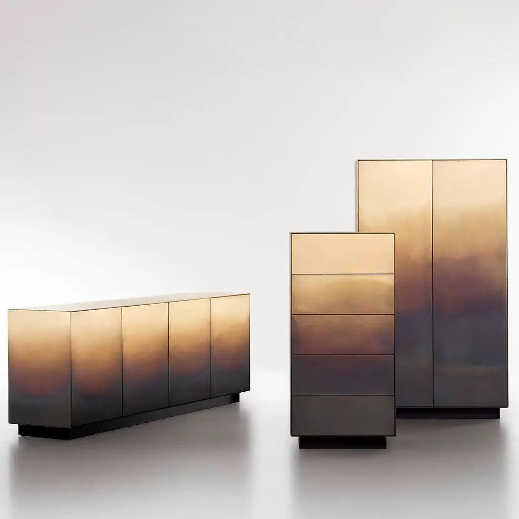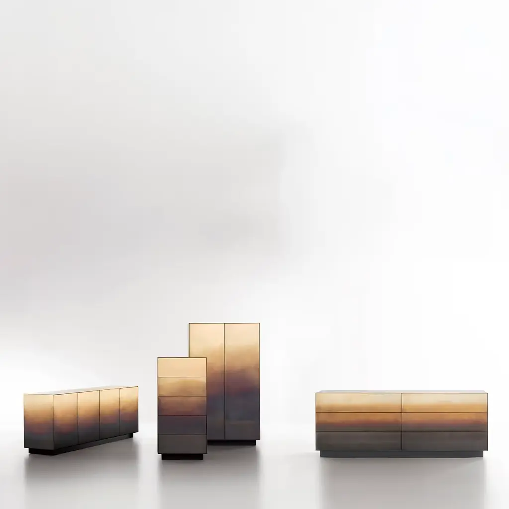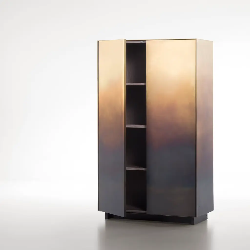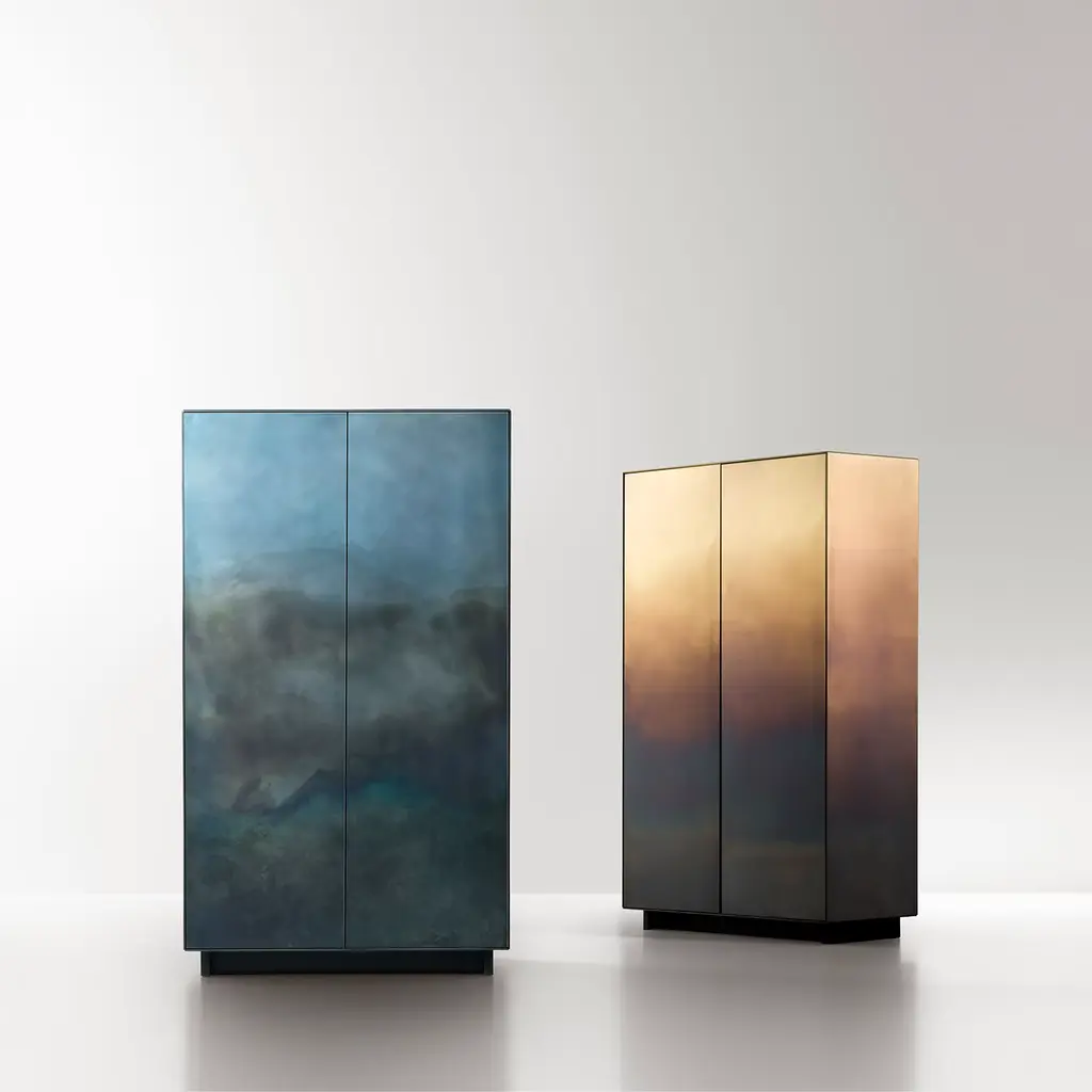 The traces of time are drawn one on top of another, infused into the changing skin of the rigorous metal forms that define these cabinets and chests. Like the tide (marea in Italian) leaves its mark, wave after wave, even here the hand of the craftsman has left its sign, oxidation after oxidation, creating a painterly effect that resembles water’s erosion of the material. Somewhere between design object and work of art, each piece in the collection, composed of a chest of drawers, low credenza and cabinet, is unique thanks to an entirely hand-crafted finish that transforms the metal surface into a delicate watercolour.