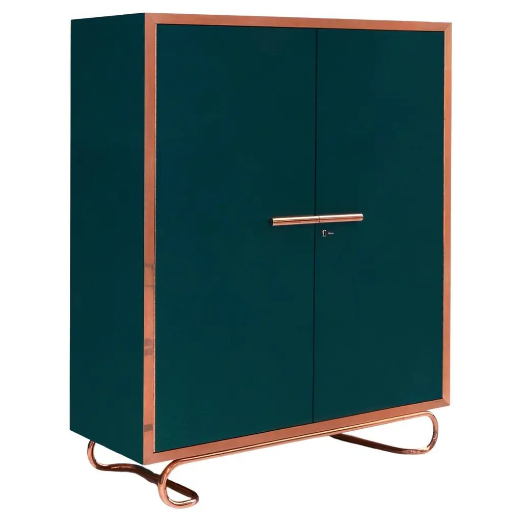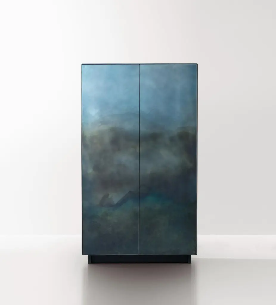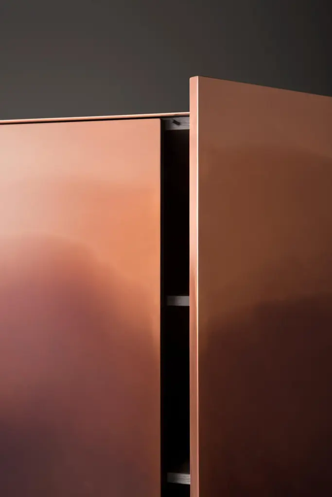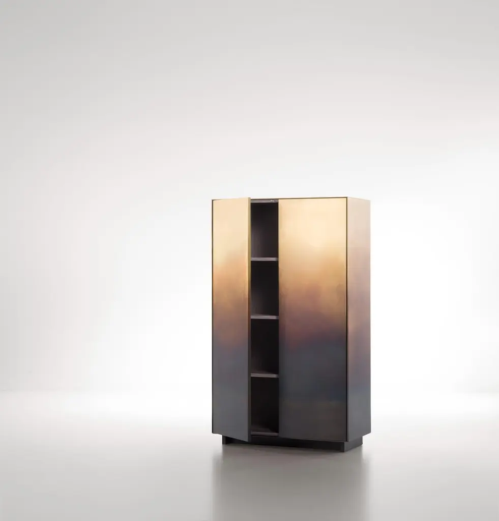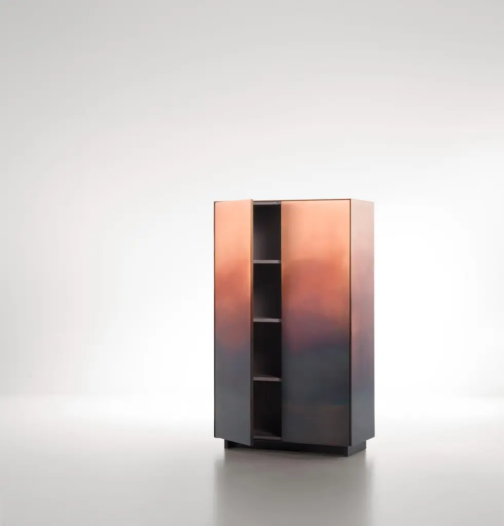 Marea Cabinet by De CastelliDimensions: W 90 x D 45 x H 155 cmMaterials: DeMarea Copper, Titanium Oak WoodBrass and Stainless Steel versions also available. Please contact us for any request.The traces of time are drawn one on top of another, infused into the changing skin of the rigorous metal forms that define these cabinets and chests. Like the tide (marea in Italian) leaves its mark, wave after wave, even here the hand of the craftsman has left its sign, oxidation after oxidation, creating a painterly effect that resembles water’s erosion of the material. Somewhere between design object and work of art, each piece in the collection, composed of a chest of drawers, low credenza and cabinet, is unique thanks to an entirely hand-crafted finish that transforms the metal surface into a delicate watercolour.DE CASTELLI“HARD COUTURE”Faithful to its decision to reinstate the special role of metal in design and experimentation, De Castelli infuses artisan ideas and workmanship into industrial processes, leading to entirely original results. The encounter with design inspires an approach to materials founded upon respect for their potential, be it hidden or obvious, which emerges slowly in a collection of pieces that, despite being part of a series, remain unique.Unique not only for the hand that has created them, but also for the singular cultural path that focuses on the aesthetic (and not just practical) value of the primordial material with which De Castelli shapes living spaces.A BESPOKE APPROACHEach object, even in the repetition of form, is a creative act in and of itself, one that incorporates a heritage of constantly-evolving expertise and research. The equation that relegates ‘cold’ metals to the margins of furnishing projects is thus overturned, bringing iron, brass and copper, in their infinite variations and finishes, to the centre of an entirely renewed stage, allowing them to finally shine with their own light.SUSTAINABILITYDe Castelli has always been committed to making the entire production cycle increasingly sustainable, aware that metal, the material with which its business identifies itself, is precious and must be treated with care, without waste.PEOPLE FIRSTThe wide spaces of the De Castelli headquarters in Crocetta del Montello (TV) allow those who work to enjoy environments where order, cleanliness and safety are always maintained and guaranteed. An attitude of attention and respect for people that has led to the shared ethical code.